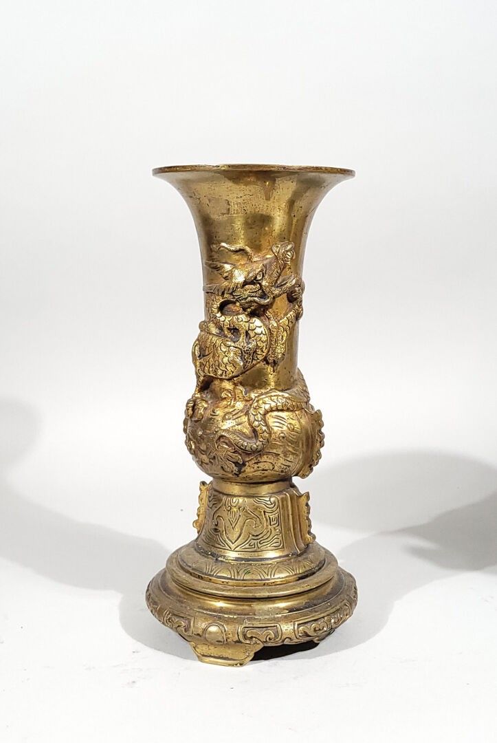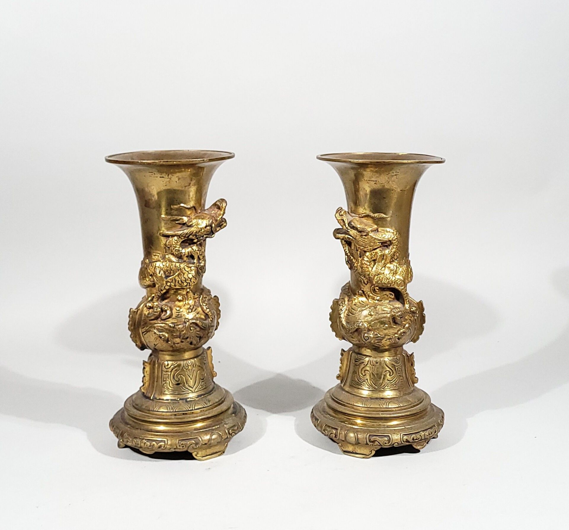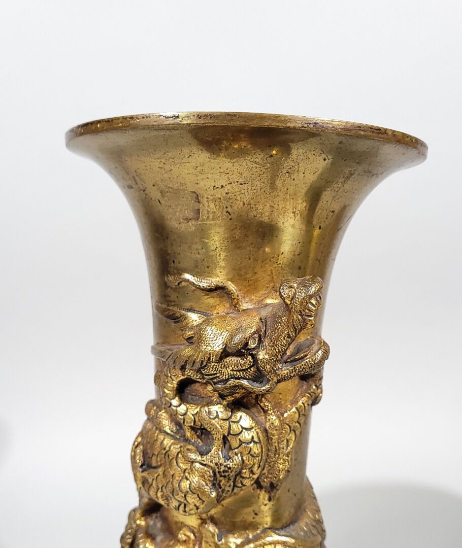 Pair of ormolu horn-shaped vases or torches decorated with dragons in low relief.