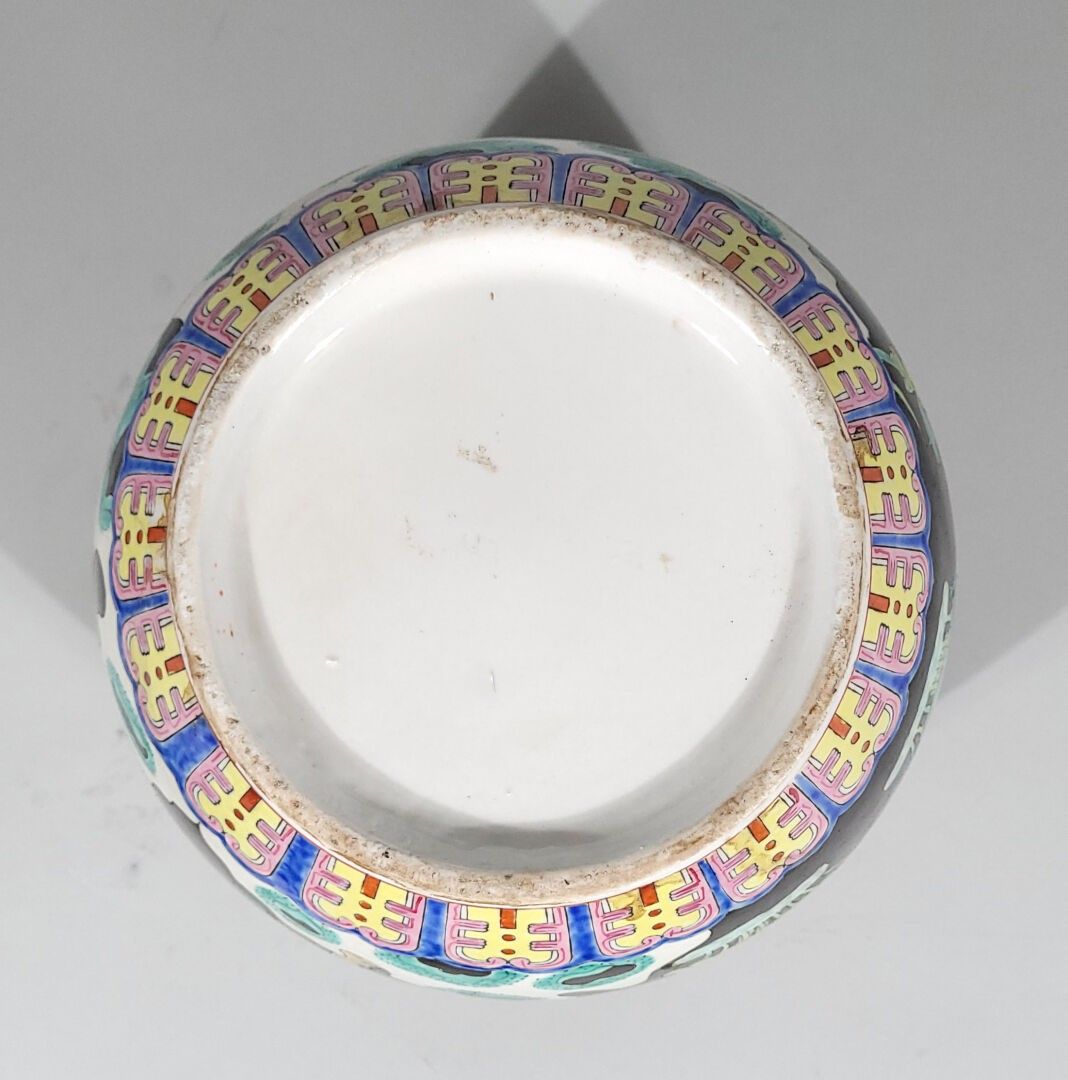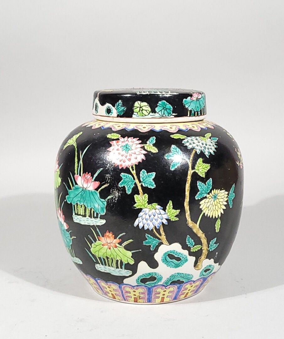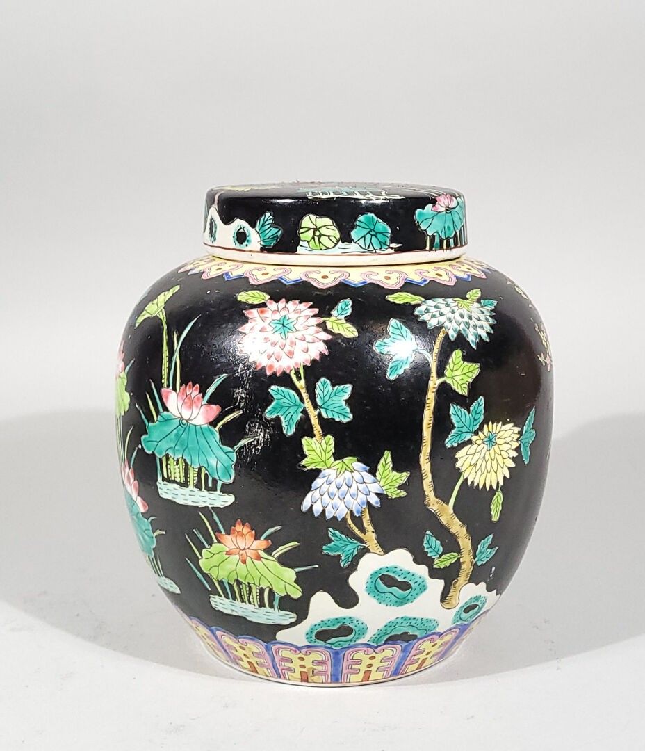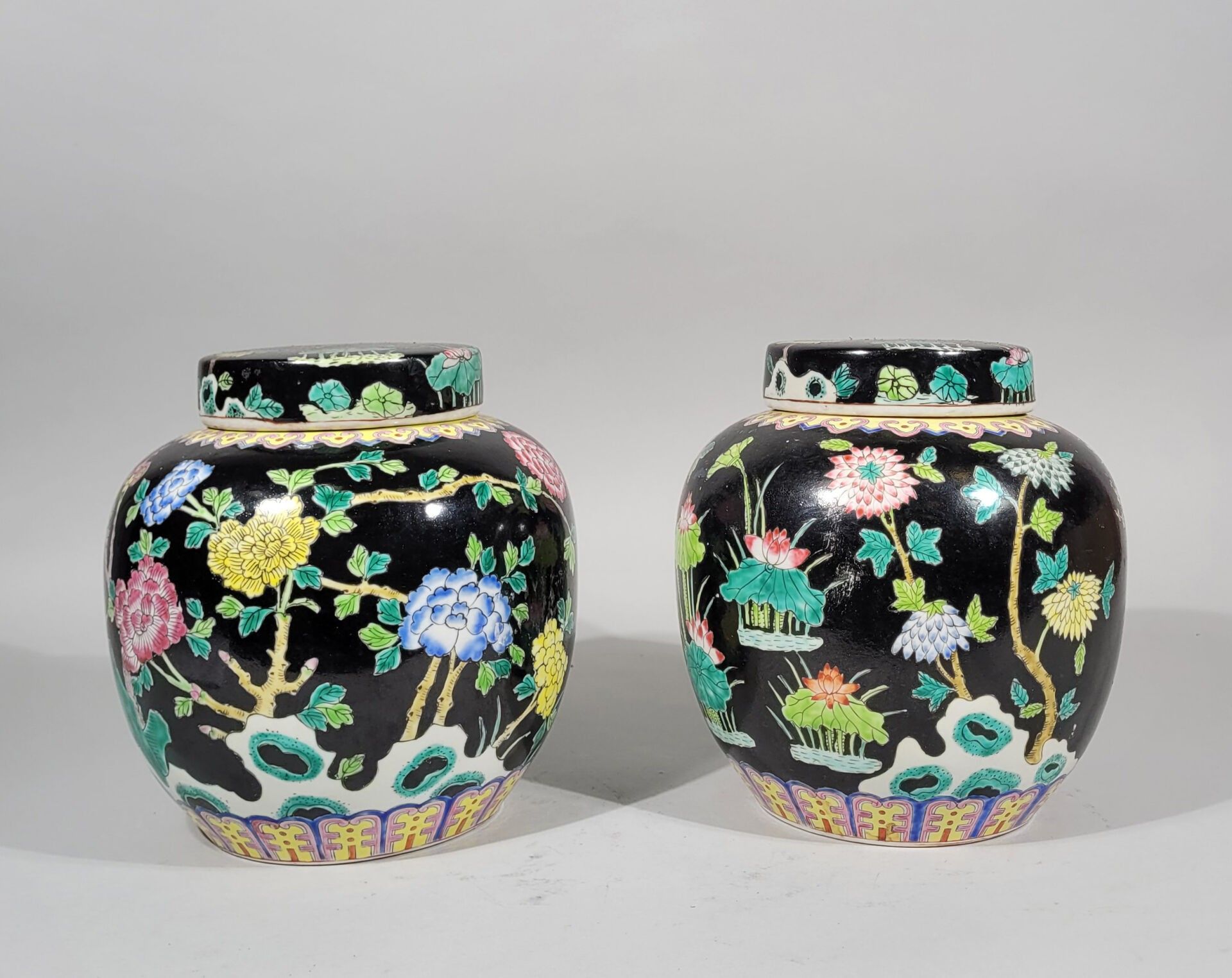 A pair of porcelain ginger pots with polychrome decoration of flowers including chrysanthemums, lotus and prunus on a black background.