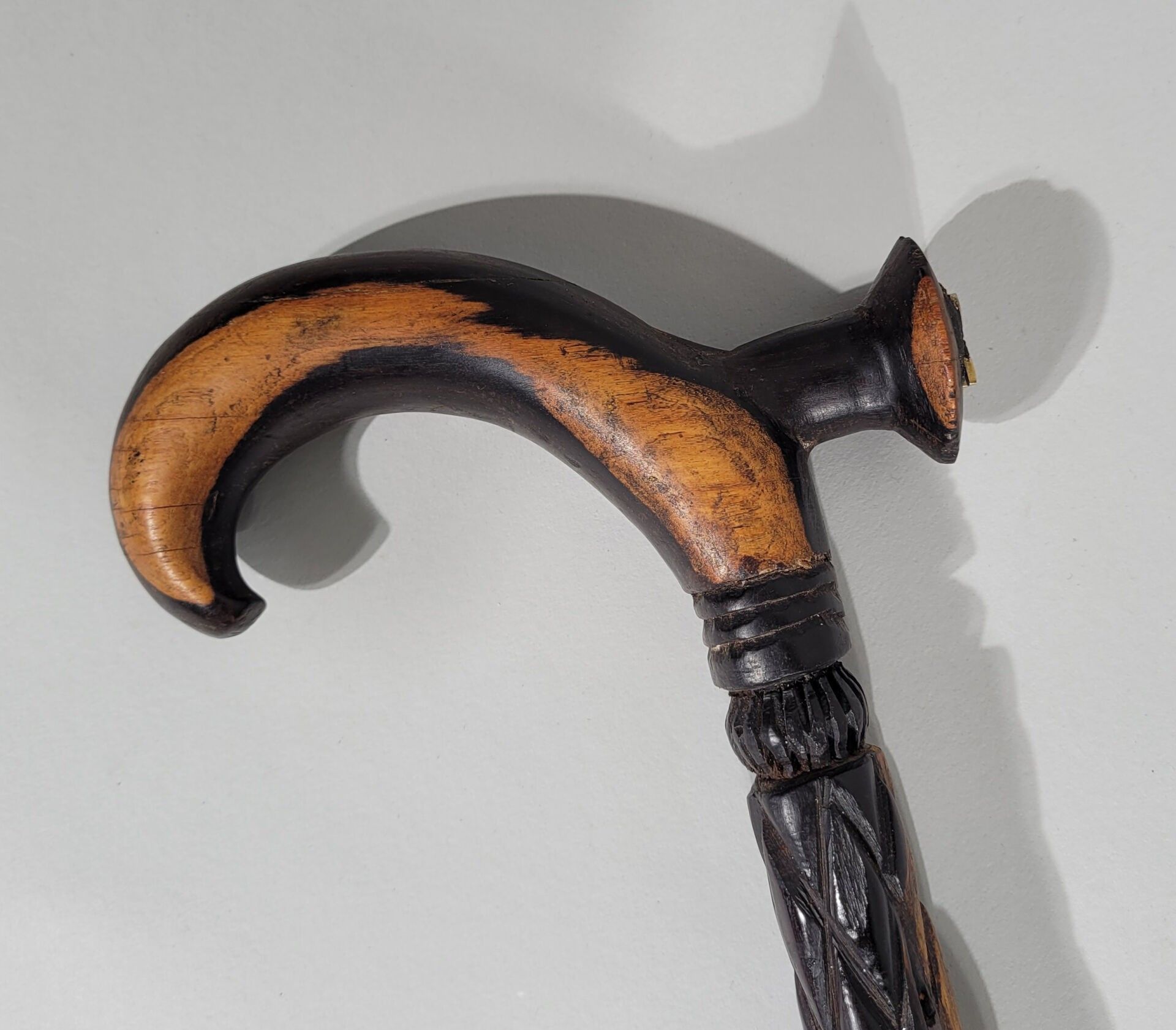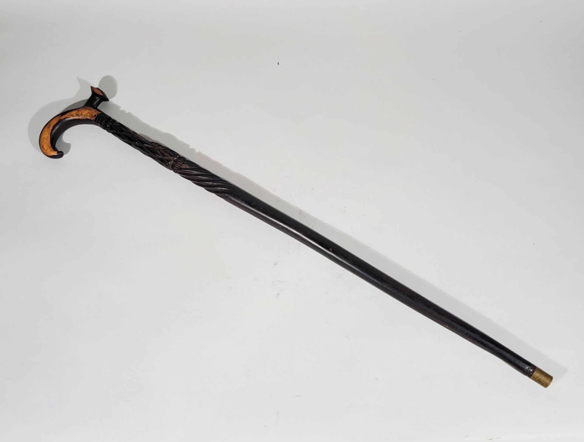 Ebony cane engraved with geometric designs, the handle decorated with a brass yaz.
