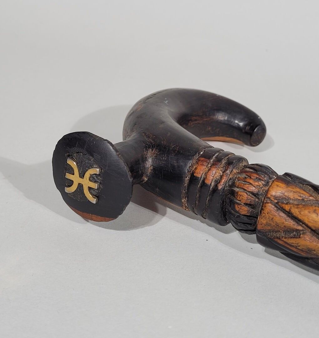 Ebony cane engraved with geometric designs, the handle decor…