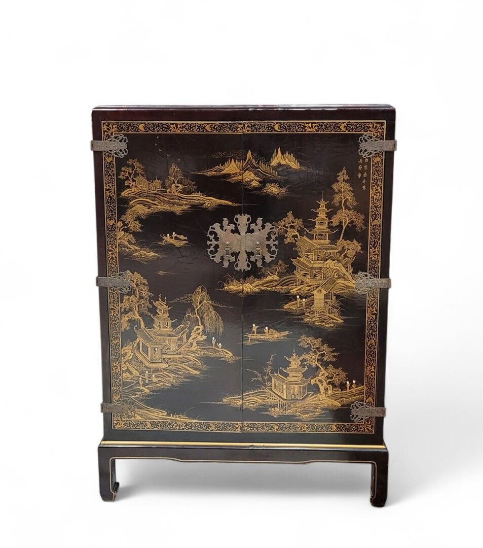 A black and gold lacquered wooden ARMOIRE decorated with animated landscapes. The front opens on two doors.