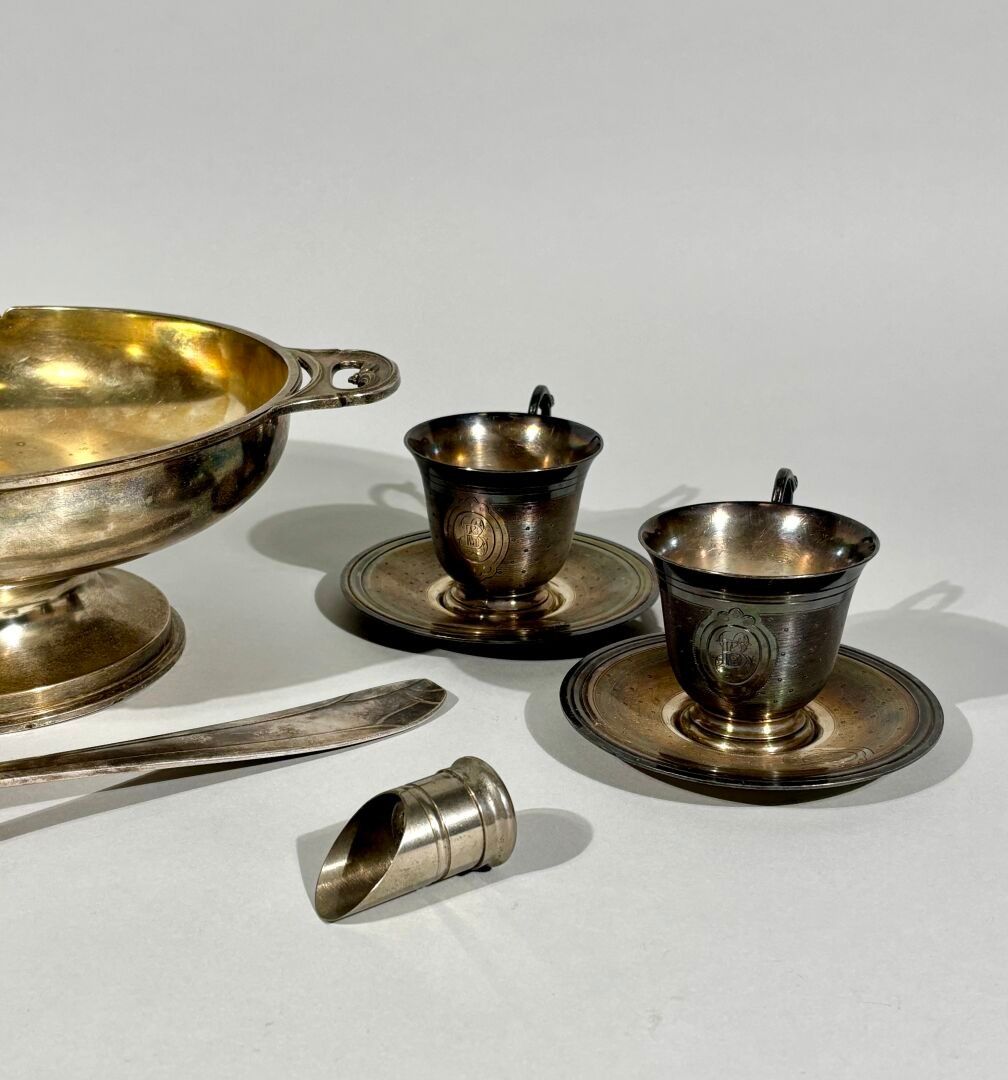 - 2 cups on pedestal and their saucers with guilloché motif and monogrammed cartouche BC,