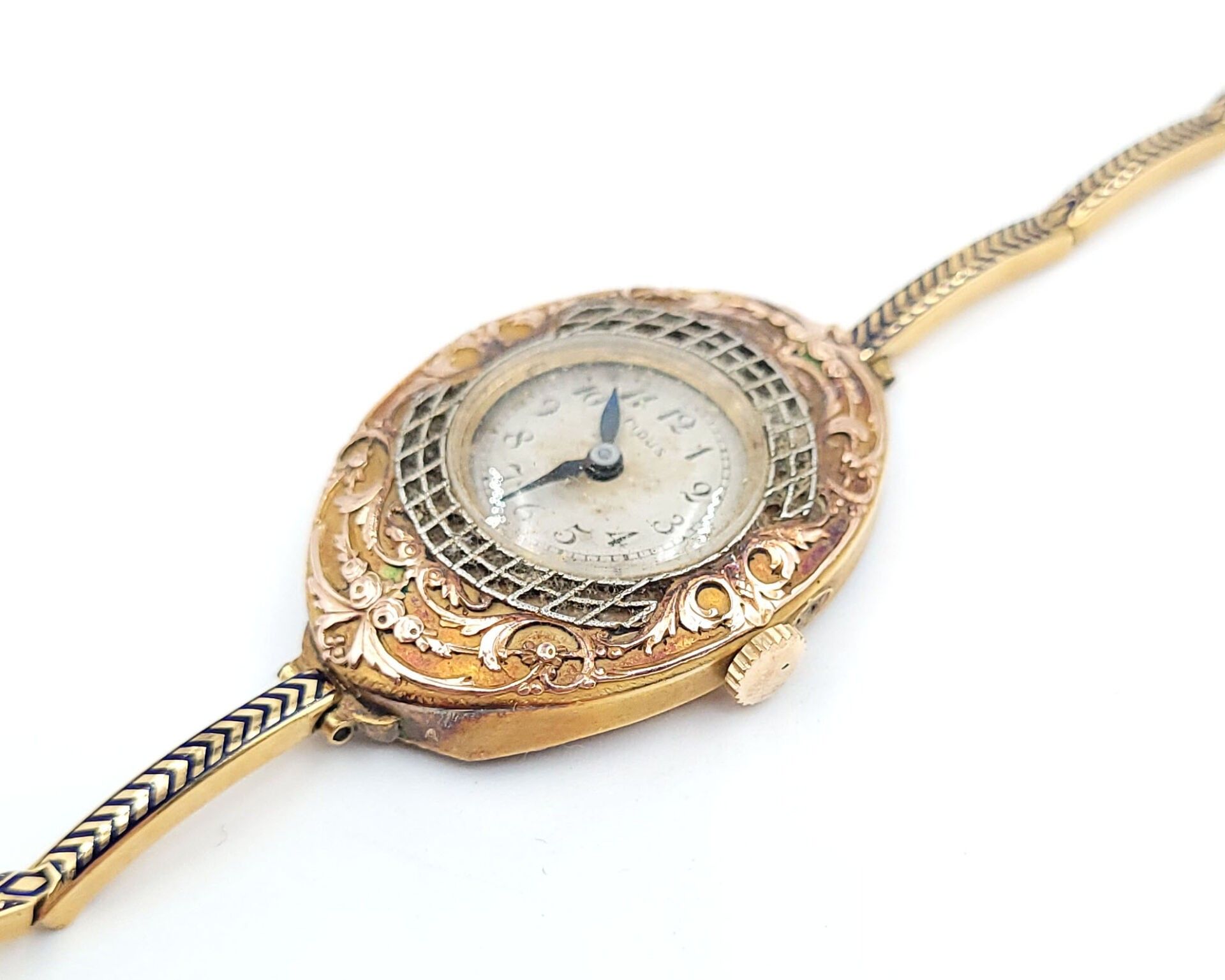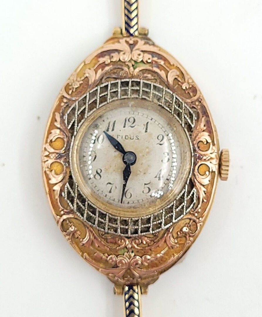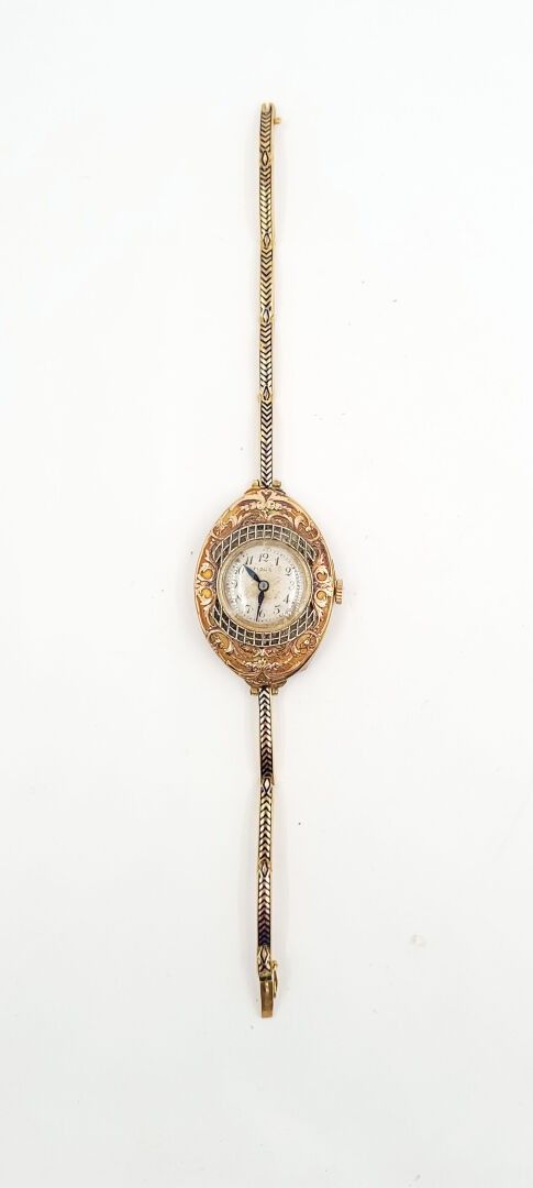 Oval white and yellow gold 750‰ BRACELET WATCH with interlace decoration, dial with Arabic numerals on an iridescent background signed Fidus. Enamelled gold 750‰ bracelet with articulated links. Hand-wound movement.
