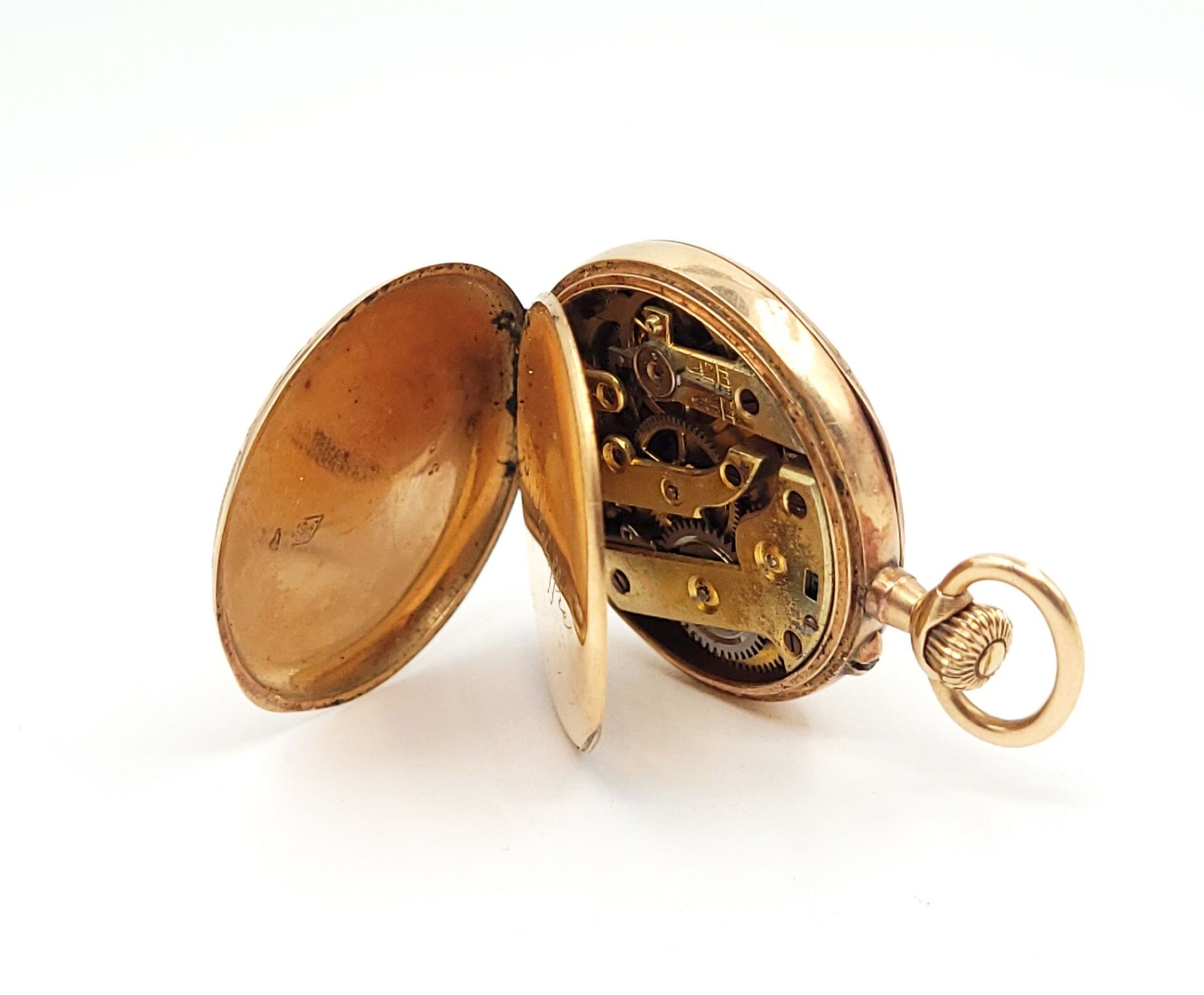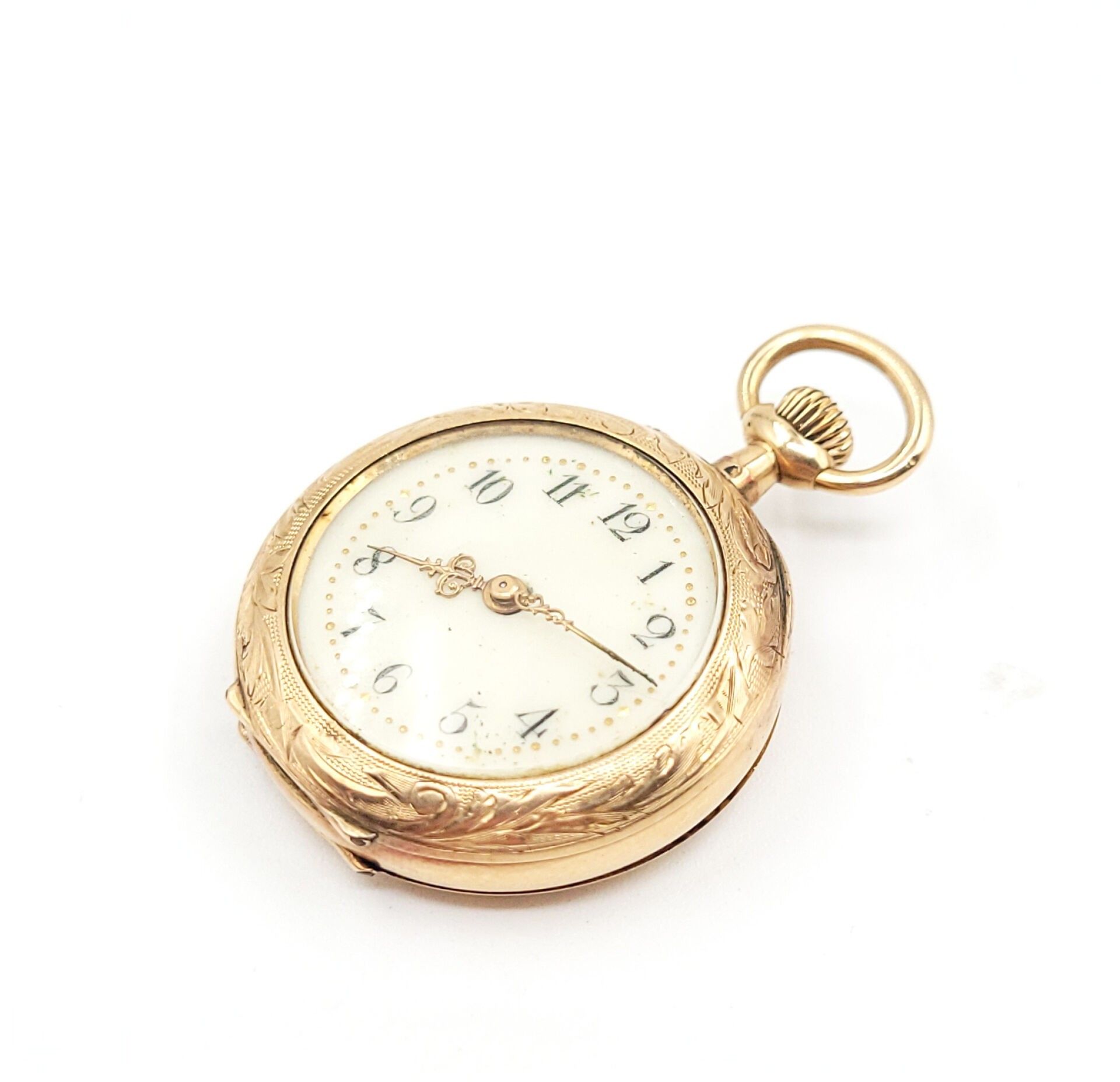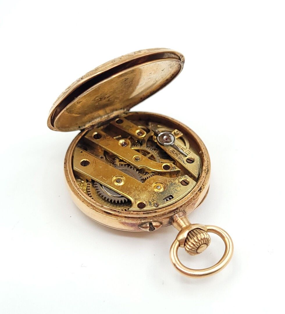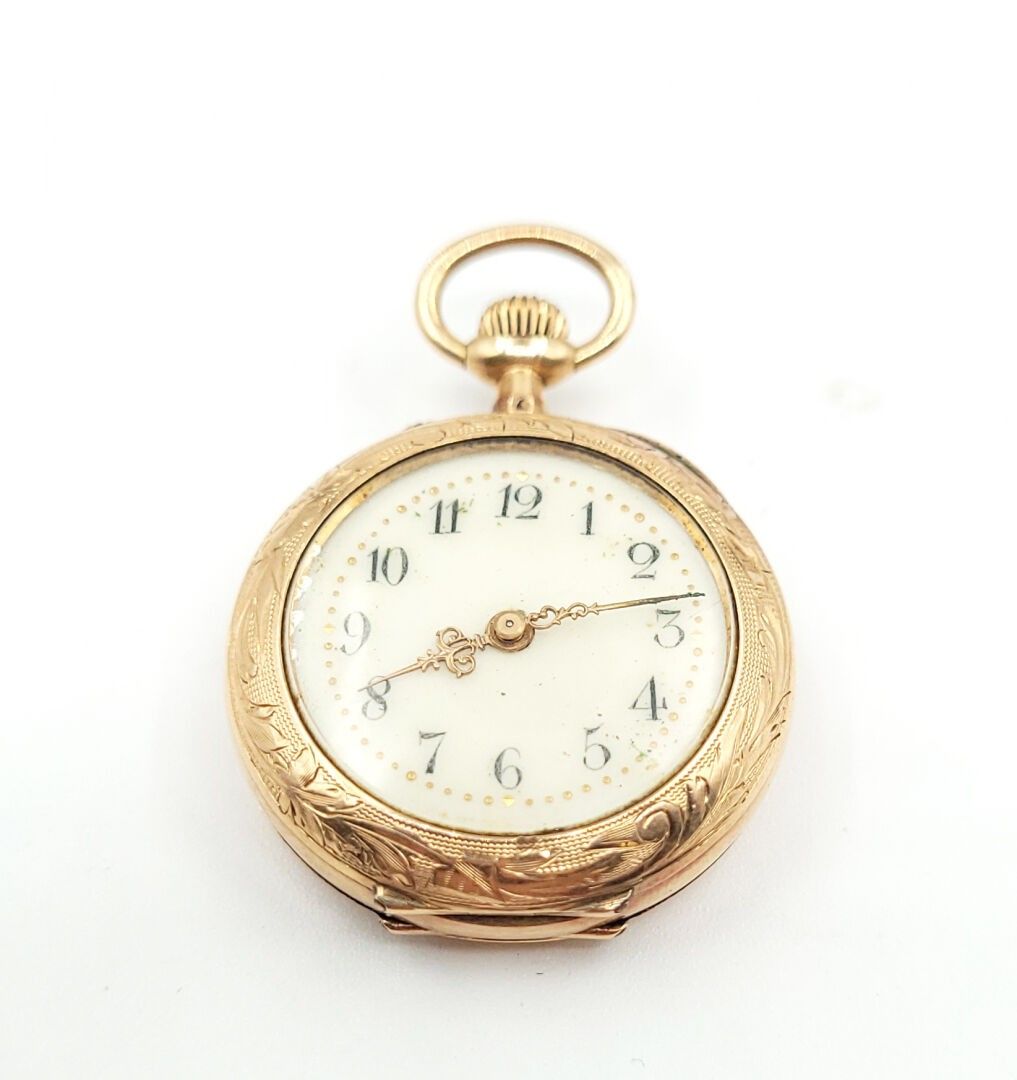 A gousset WATCH with a yellow gold 750‰ case engraved with foliate motifs, dust cover and gold 750‰ bowl, the white enamelled dial, Arabic numerals.