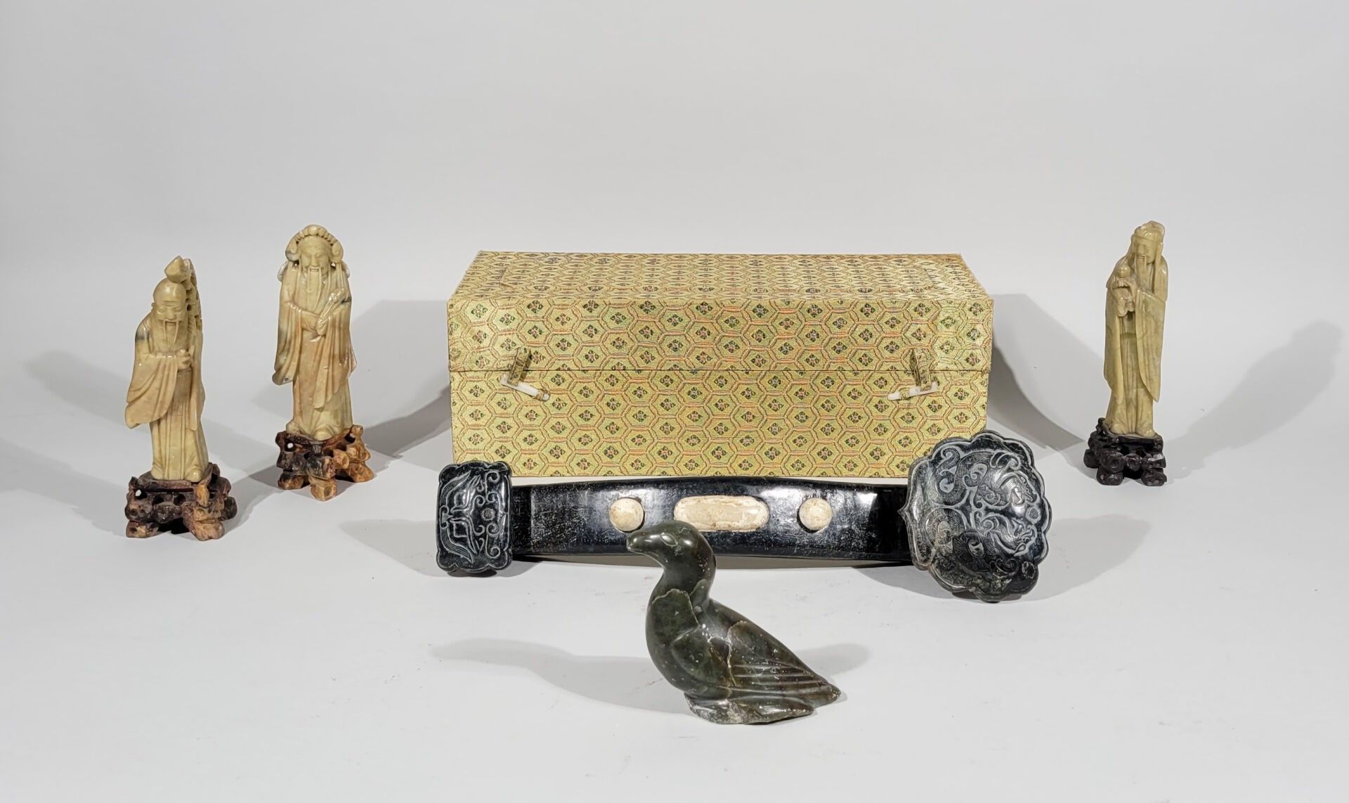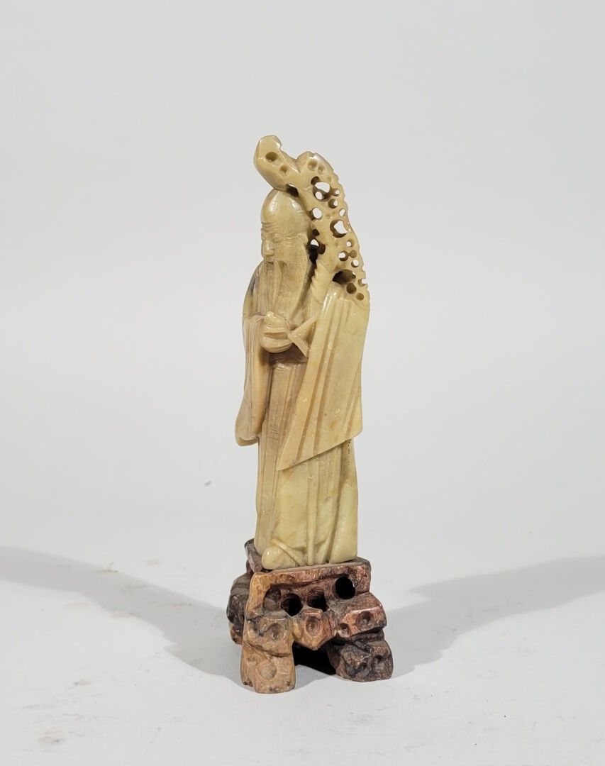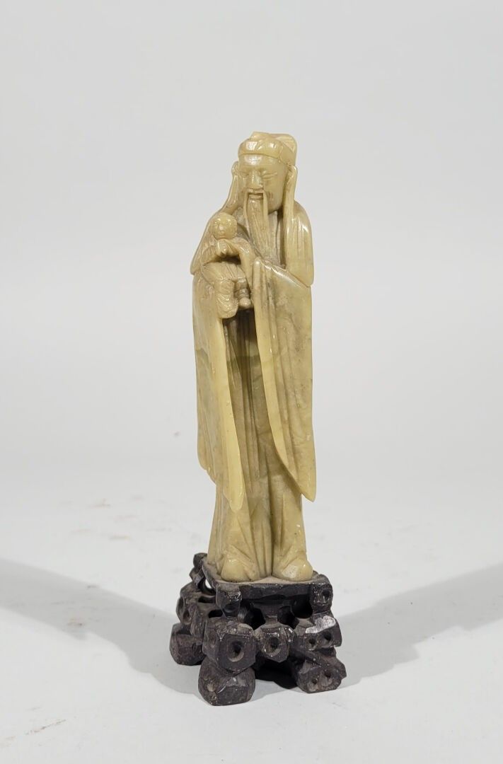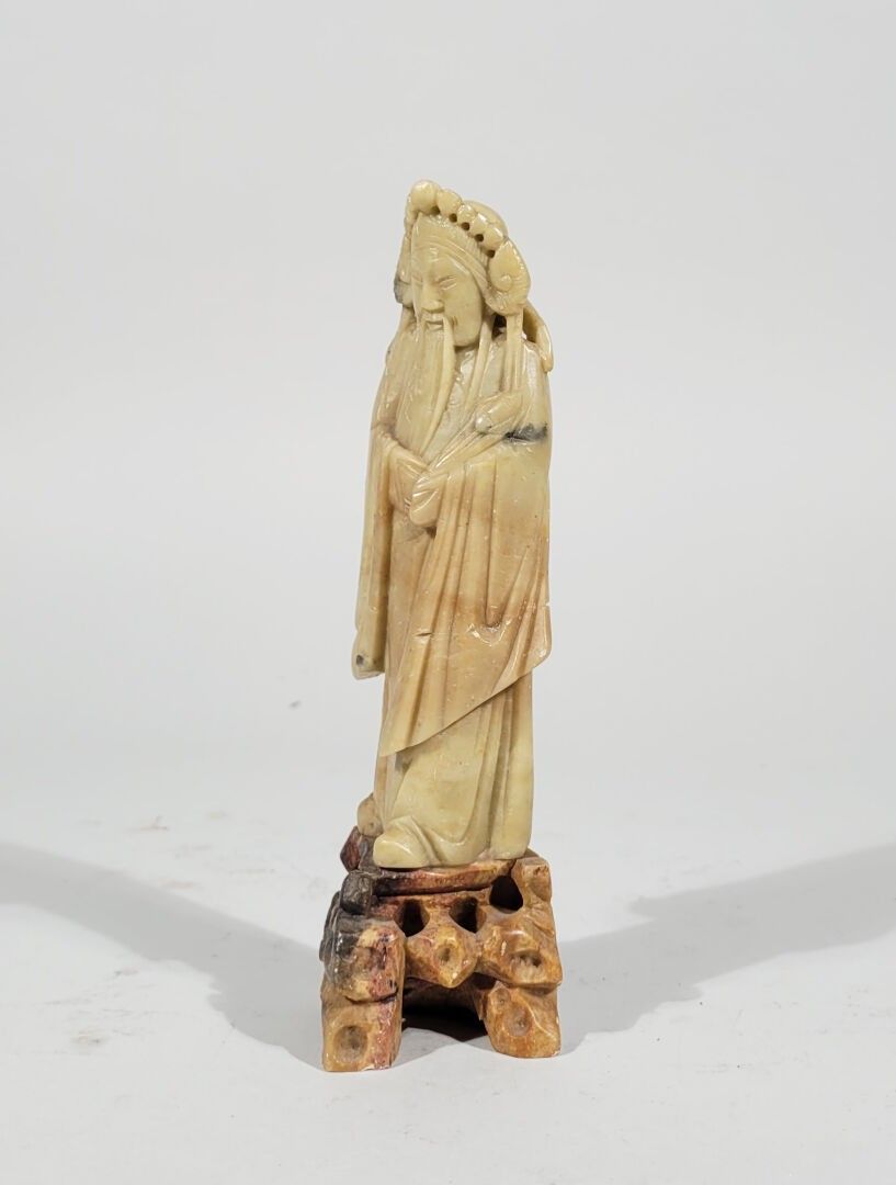 - 3 male figures on lardstone pedestals (One glued back) Height. Height : 20 cm