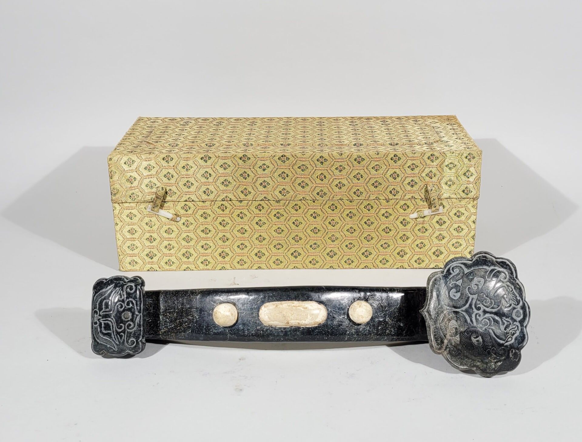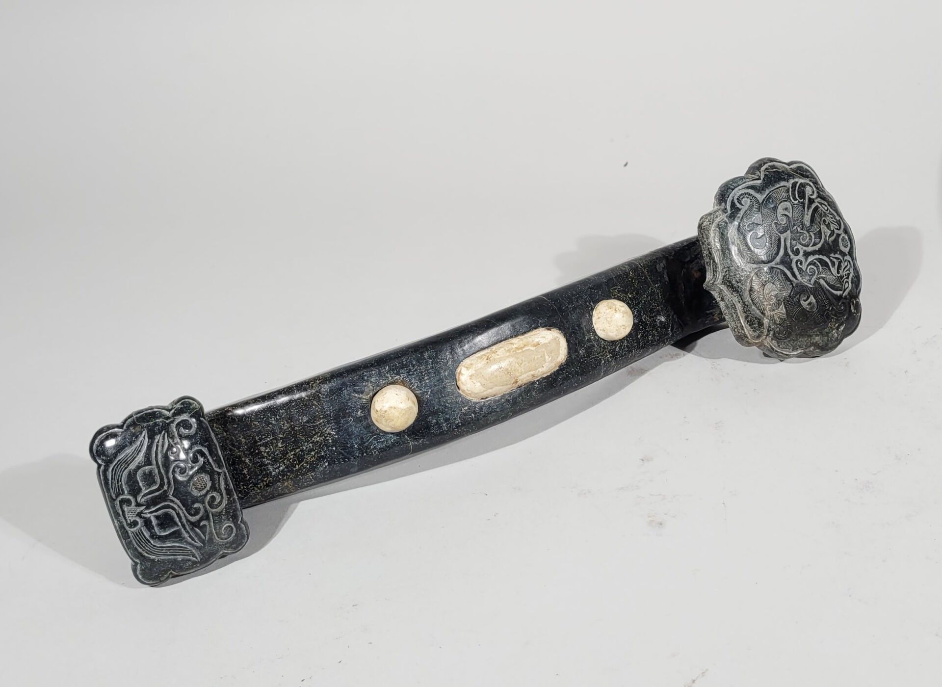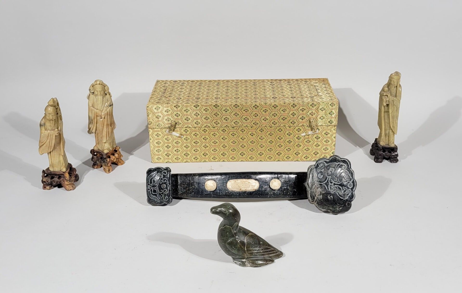 - 3 male figures on lardstone pedestals (One glued back) Height. Height : 20 cm