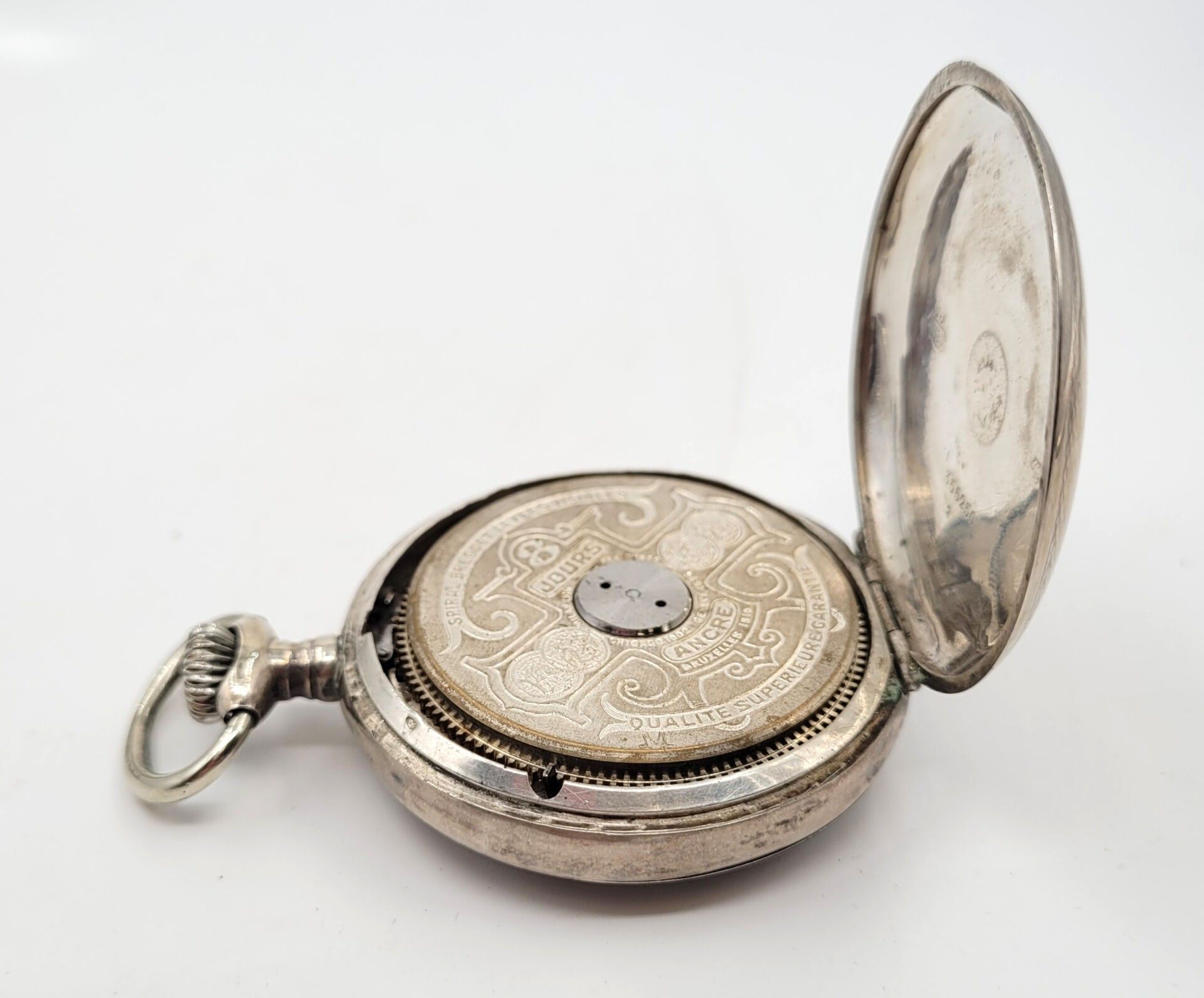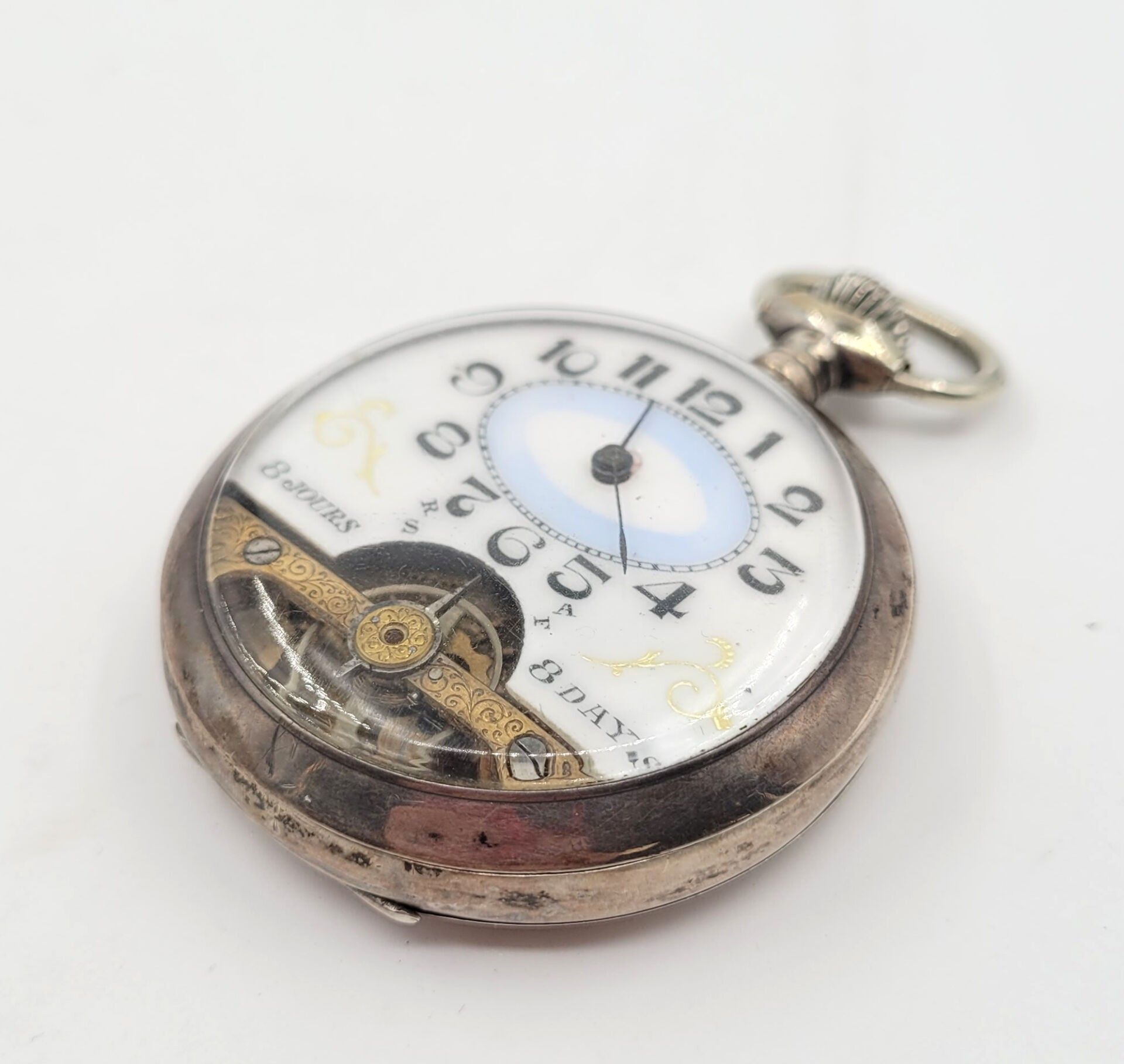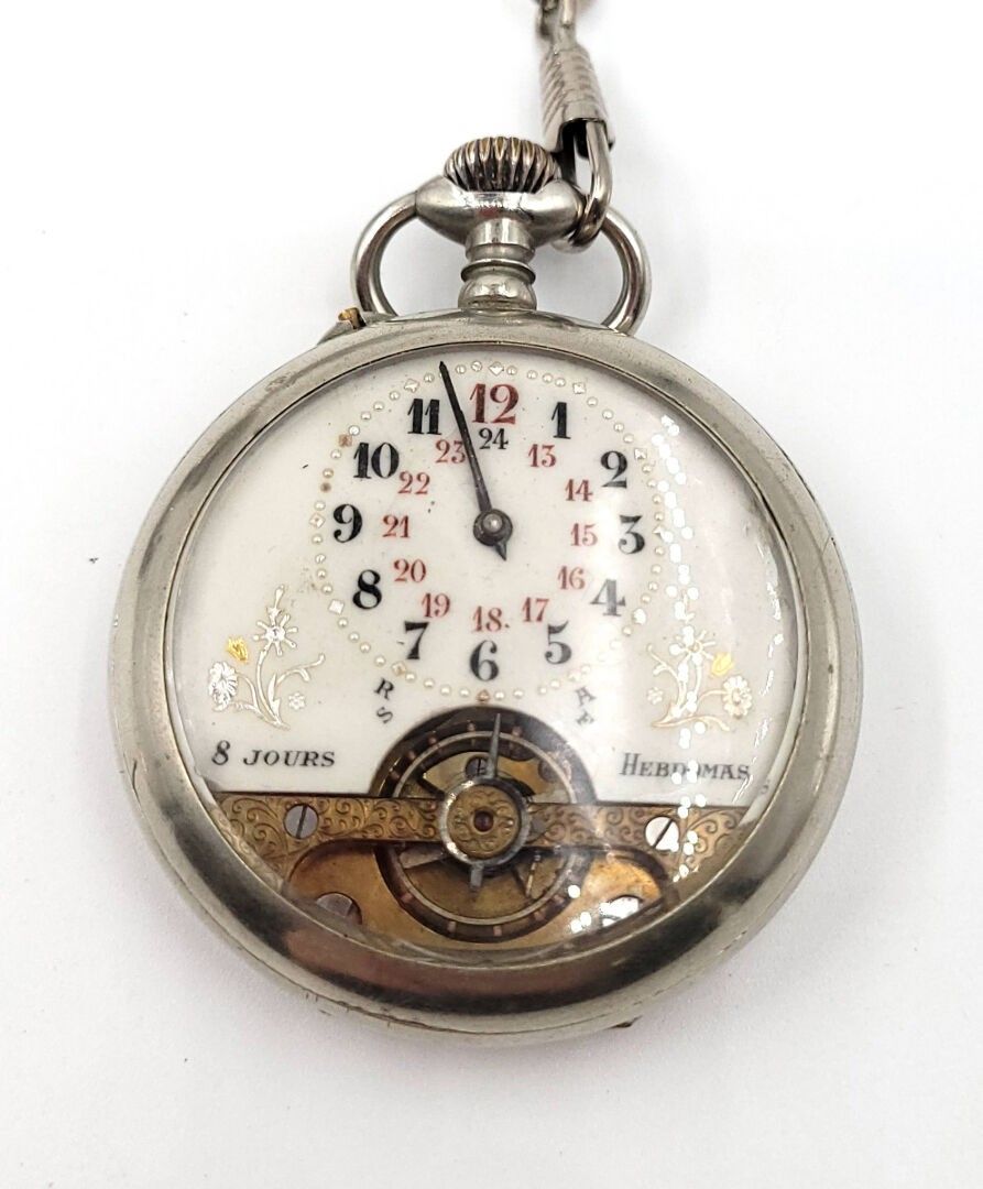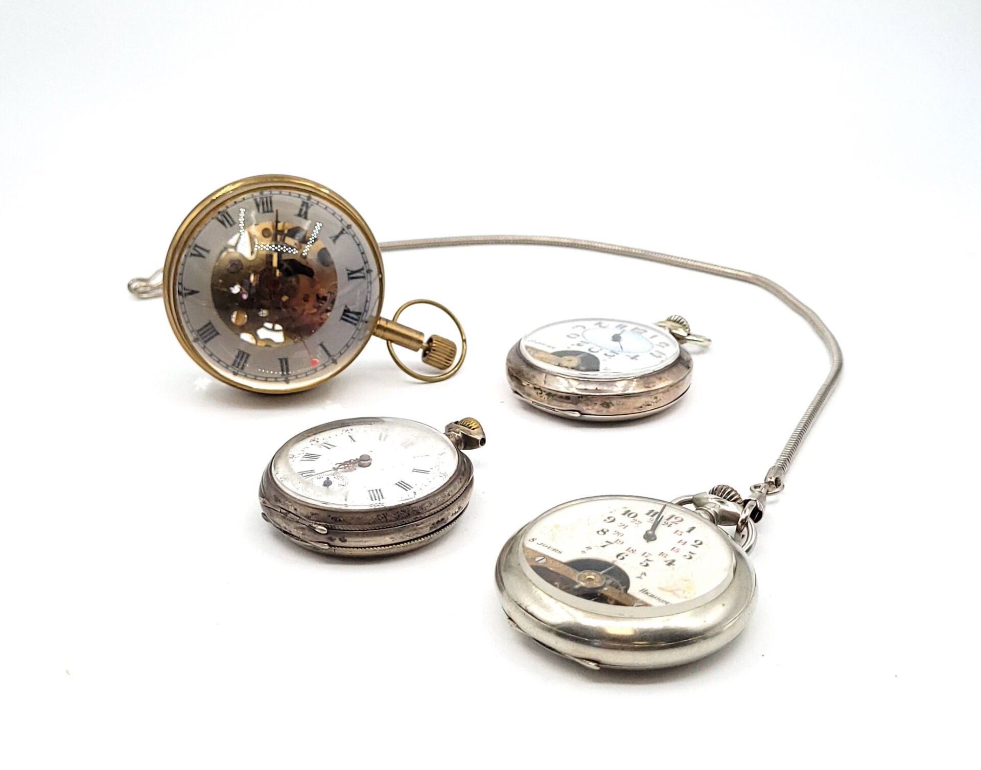 REUNION of four gousset watches comprising: - 1 watch with silver 800‰ case, the white enamelled dial with Roman numerals and railway. Crab hallmark - Gross weight: 69.2 g - 1 950‰ silver case watch, the guilloche cuvette, the white and blue enamelled dial, 8-day bréguet spiral. Coq hallmark - Gross weight: 79.8 g - 1 silvered metal watch, white enamelled dial signed Hebdomas. - 1 brass and glass watch with white enamelled dial with Roman numerals and skeleton back. Total gross weight: 149 g