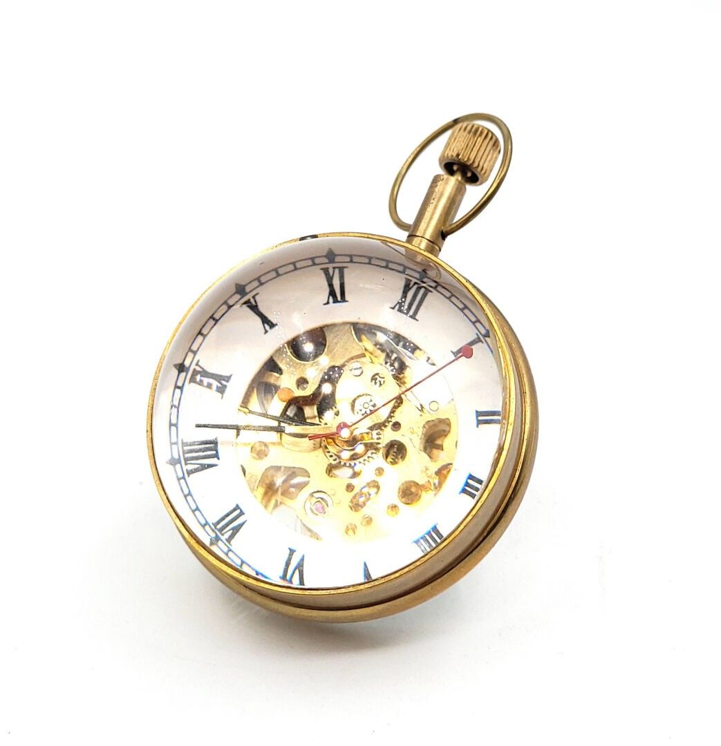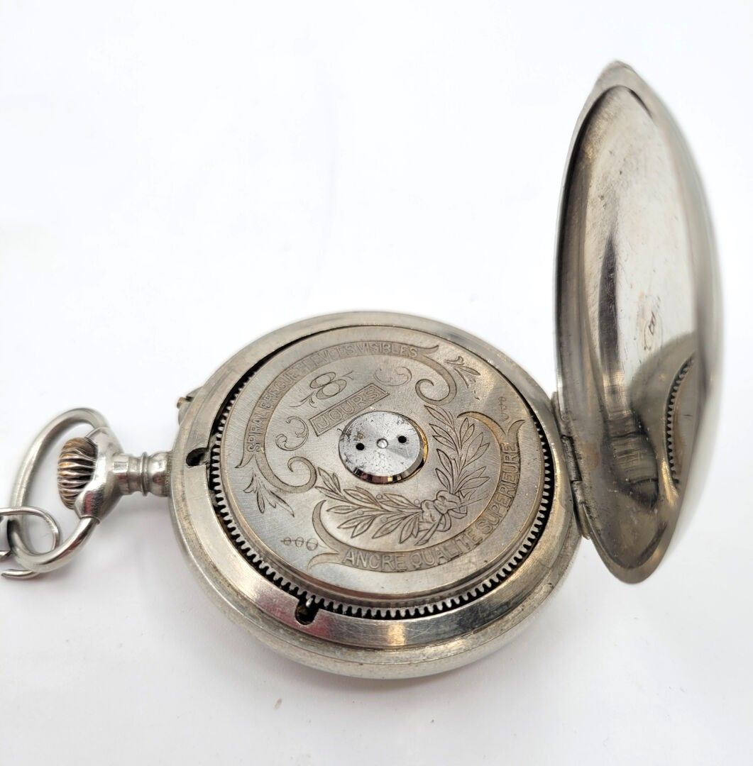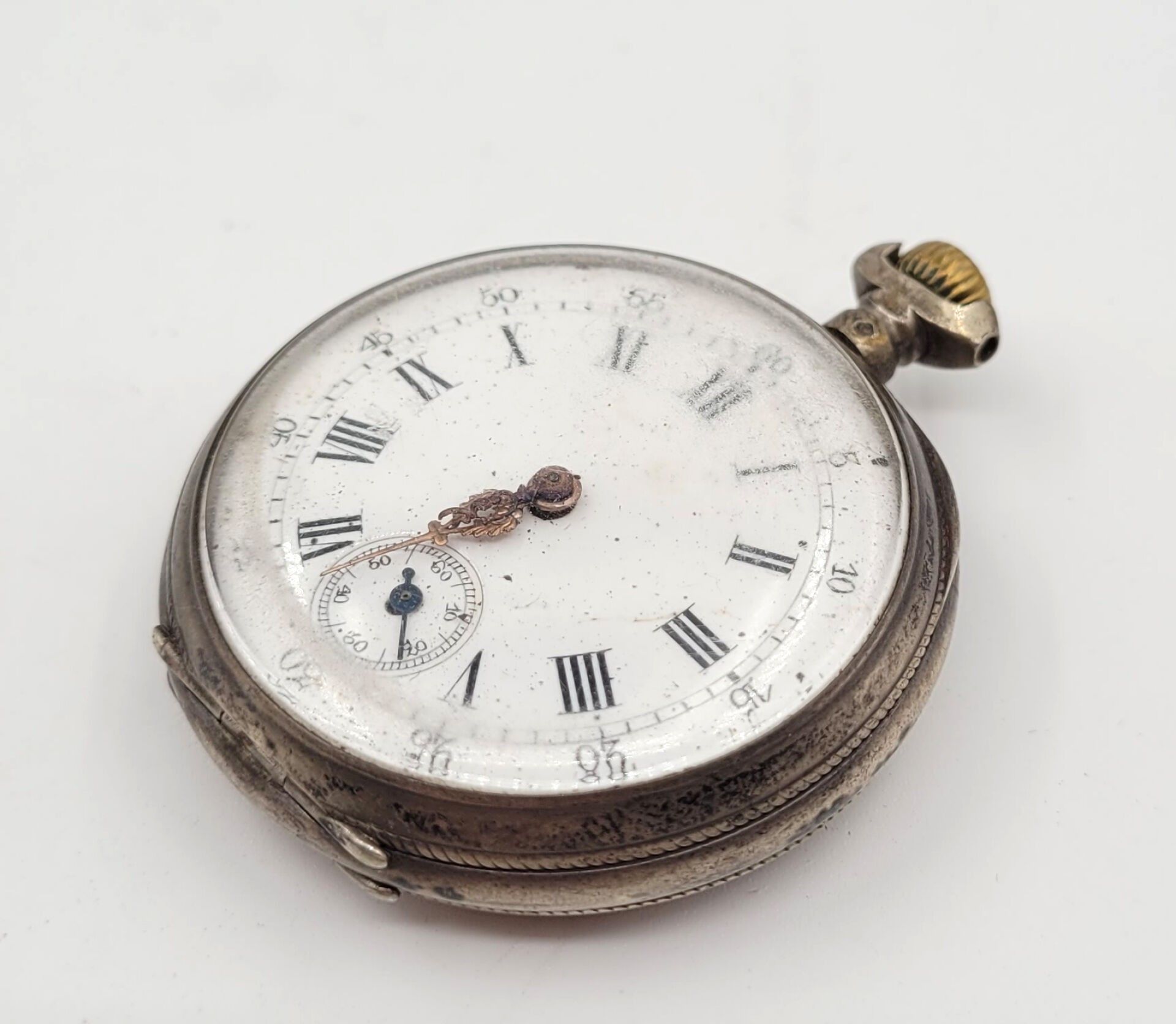 REUNION of four gousset watches comprising: - 1 watch with silver 800‰ case, the white enamelled dial with Roman numerals and railway. Crab hallmark - Gross weight: 69.2 g - 1 950‰ silver case watch, the guilloche cuvette, the white and blue enamelled dial, 8-day bréguet spiral. Coq hallmark - Gross weight: 79.8 g - 1 silvered metal watch, white enamelled dial signed Hebdomas. - 1 brass and glass watch with white enamelled dial with Roman numerals and skeleton back. Total gross weight: 149 g