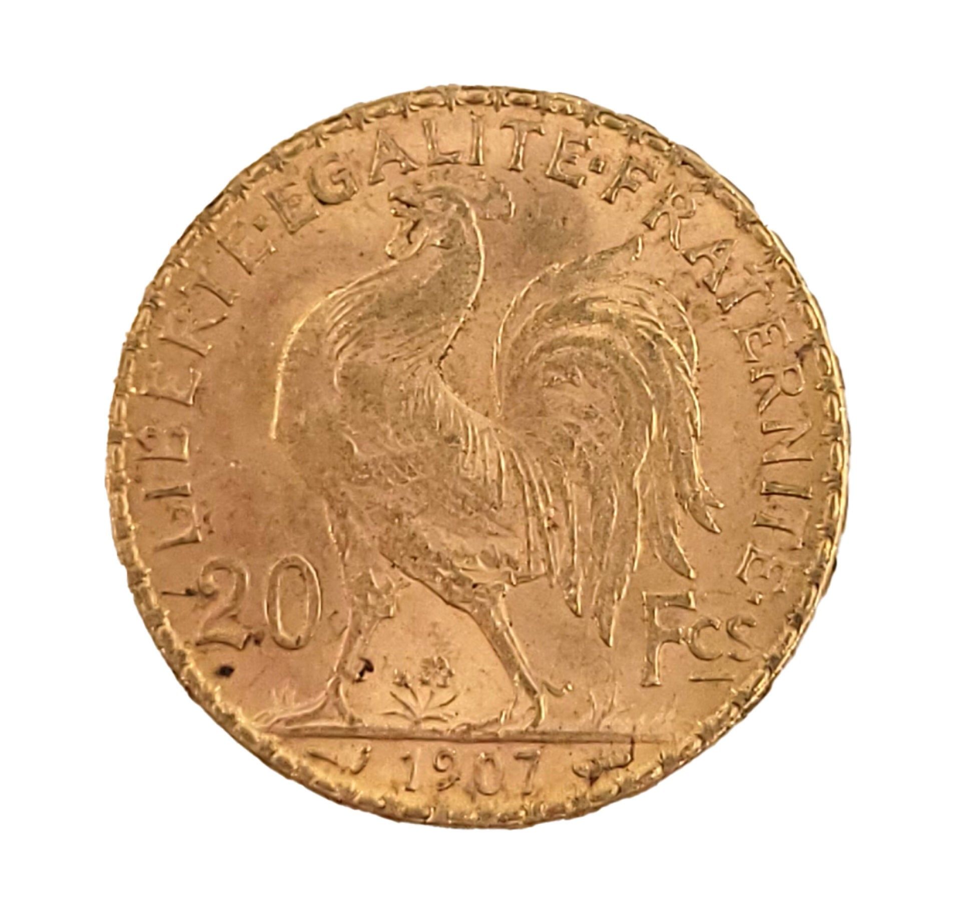 A 20 franc gold PIECE with the Chaplain cock dated 1907.