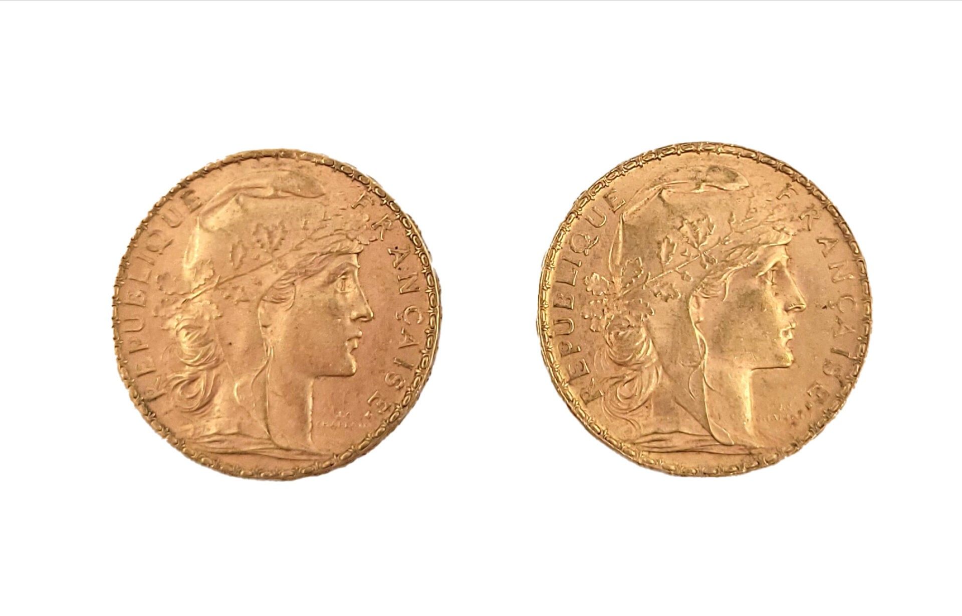 Two 20 franc gold PIECES with the Chaplain rooster dated 190…