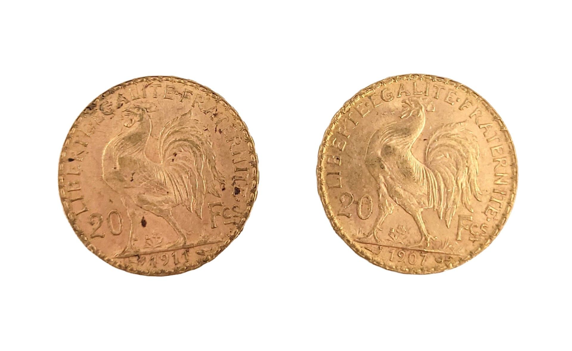 Two 20 franc gold PIECES with the Chaplain rooster dated 1907 and 1911.