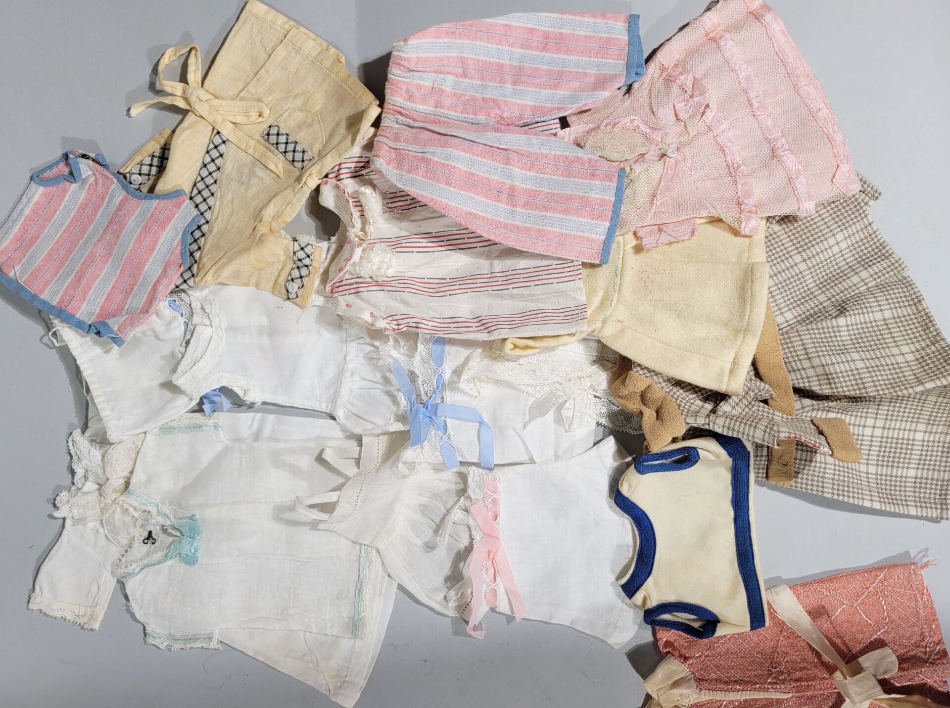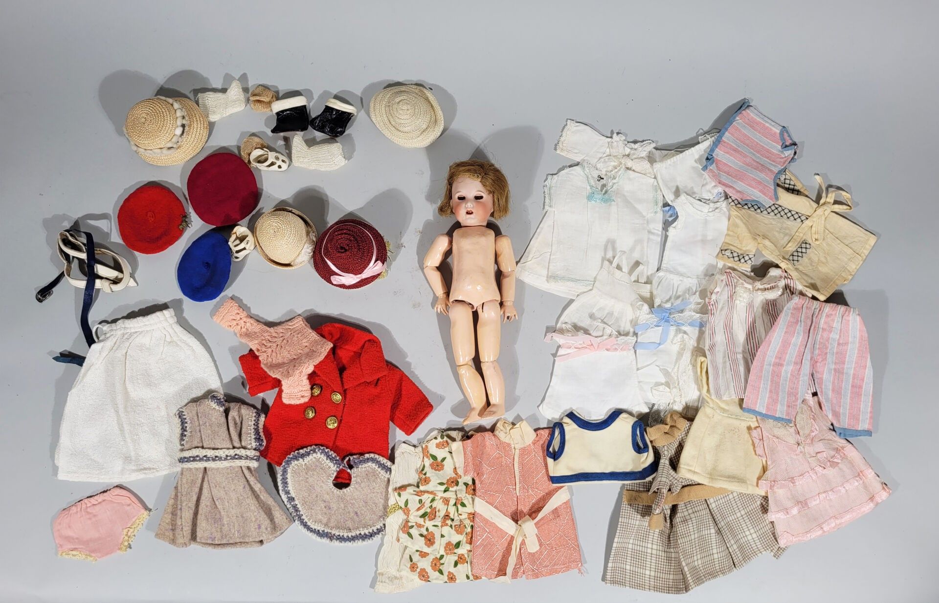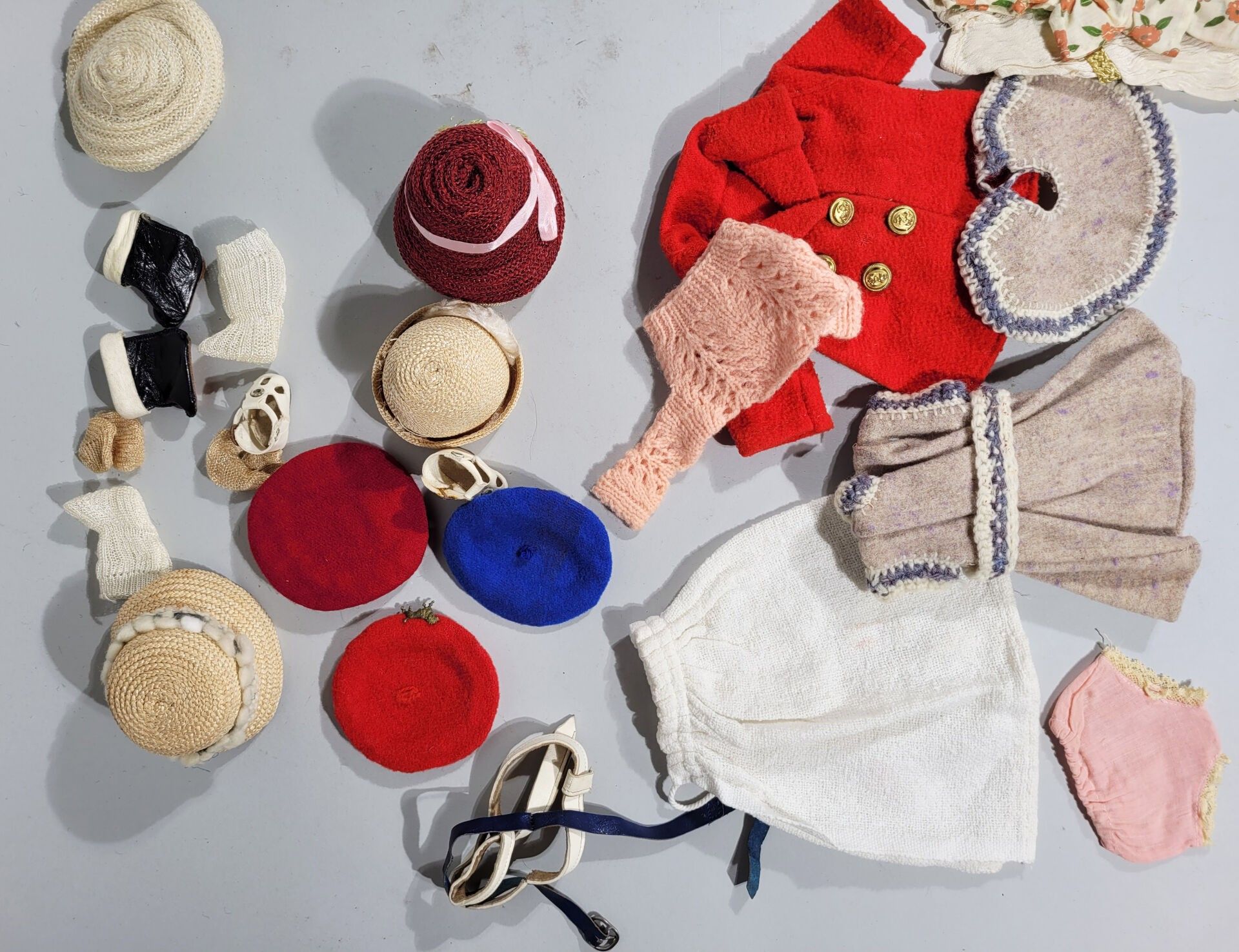 With numerous accessories: 5 straw hats, 3 berets, 1 pair of boots, 1 pair of sandals, 2 pairs of socks, 6 sleeveless cotton briefs, 2 cotton briefs with sleeves, 1 pair of cotton knickers and a nightcap, 2 sets of knickers/pants, a kimono, 7 dresses, one with a cape, 1 cape and a red coat, 1 jumper, a bolero and 2 belts.