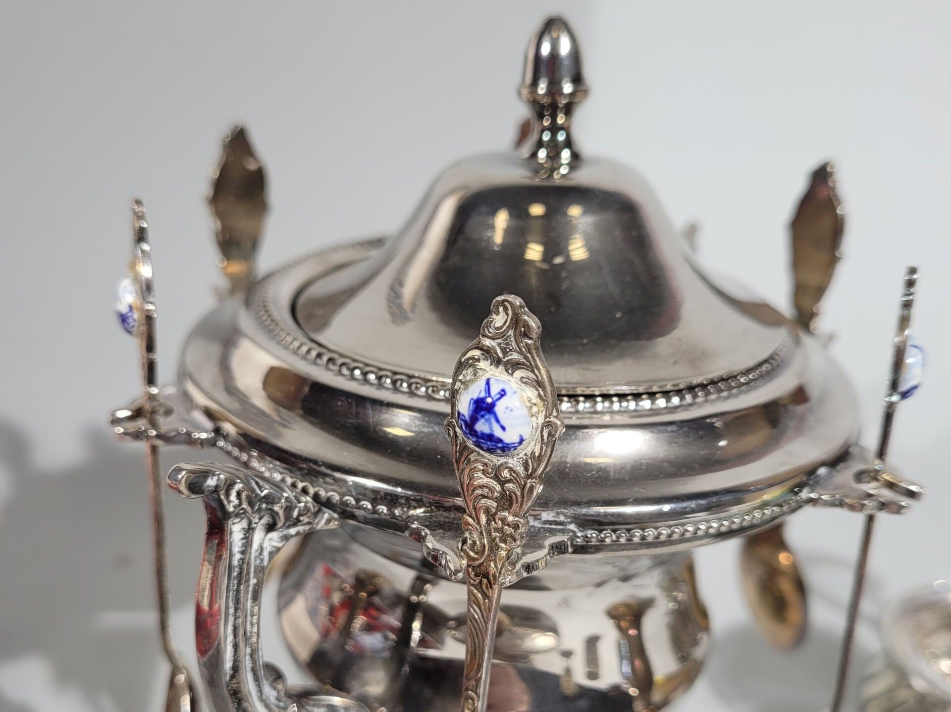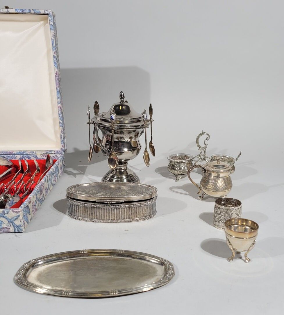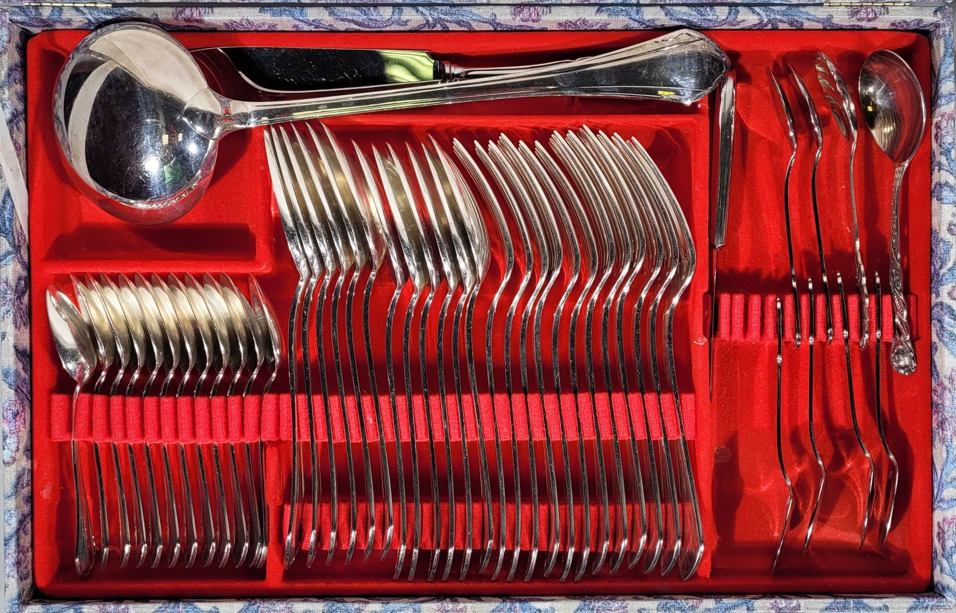 - A set of cutlery including: 12 large place settings, a sugar spoon, a cream spoon, twelve teaspoons, six teaspoons, a ladle, a cake knife and a butter knife.