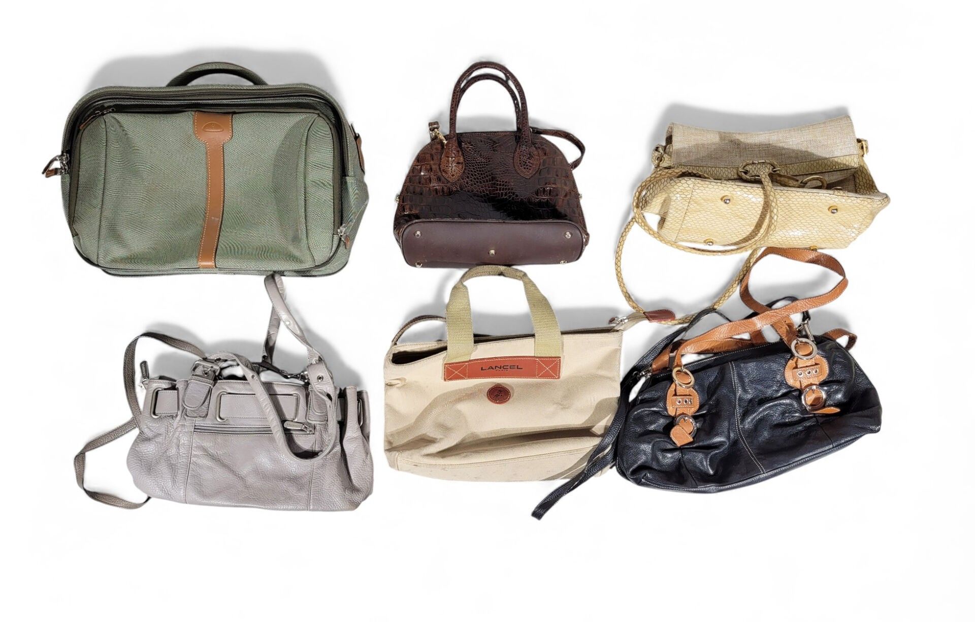 A collection of vintage handbags including: SAMSONITE, RUSSEL & BROMLEY, SABRINA, LANCEL for Roland Garros...