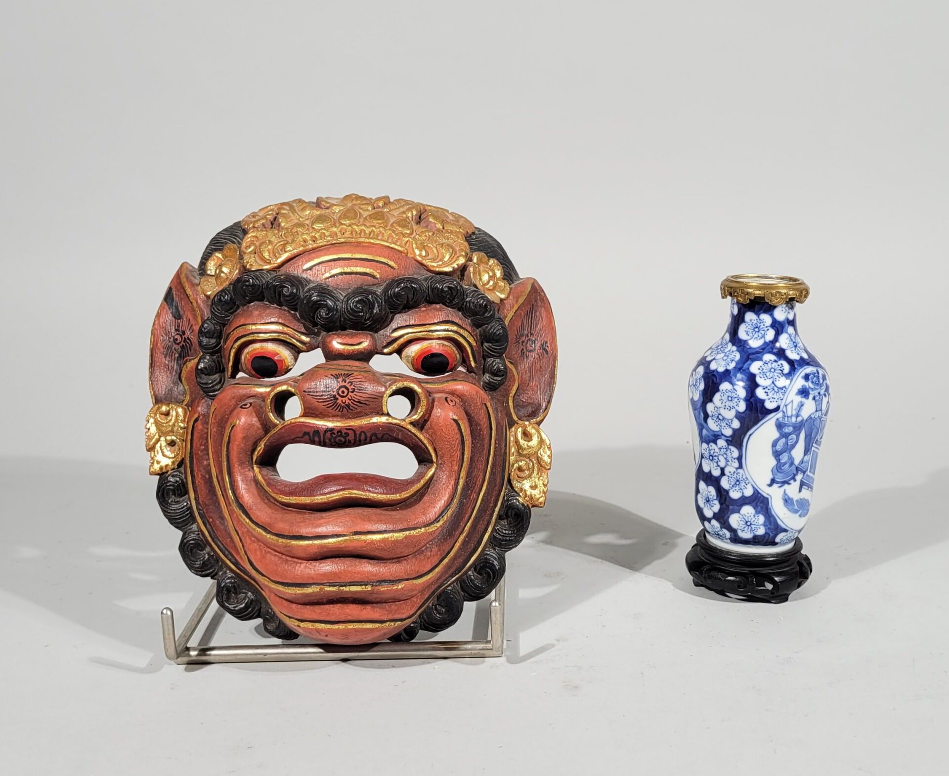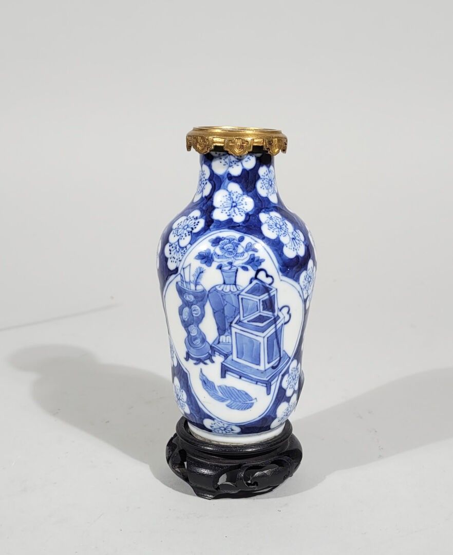 A small porcelain vase with white-blue decoration of literary objects in cartouches, the neck with a gilt bronze mounting. Mark under the base. On a wooden base.