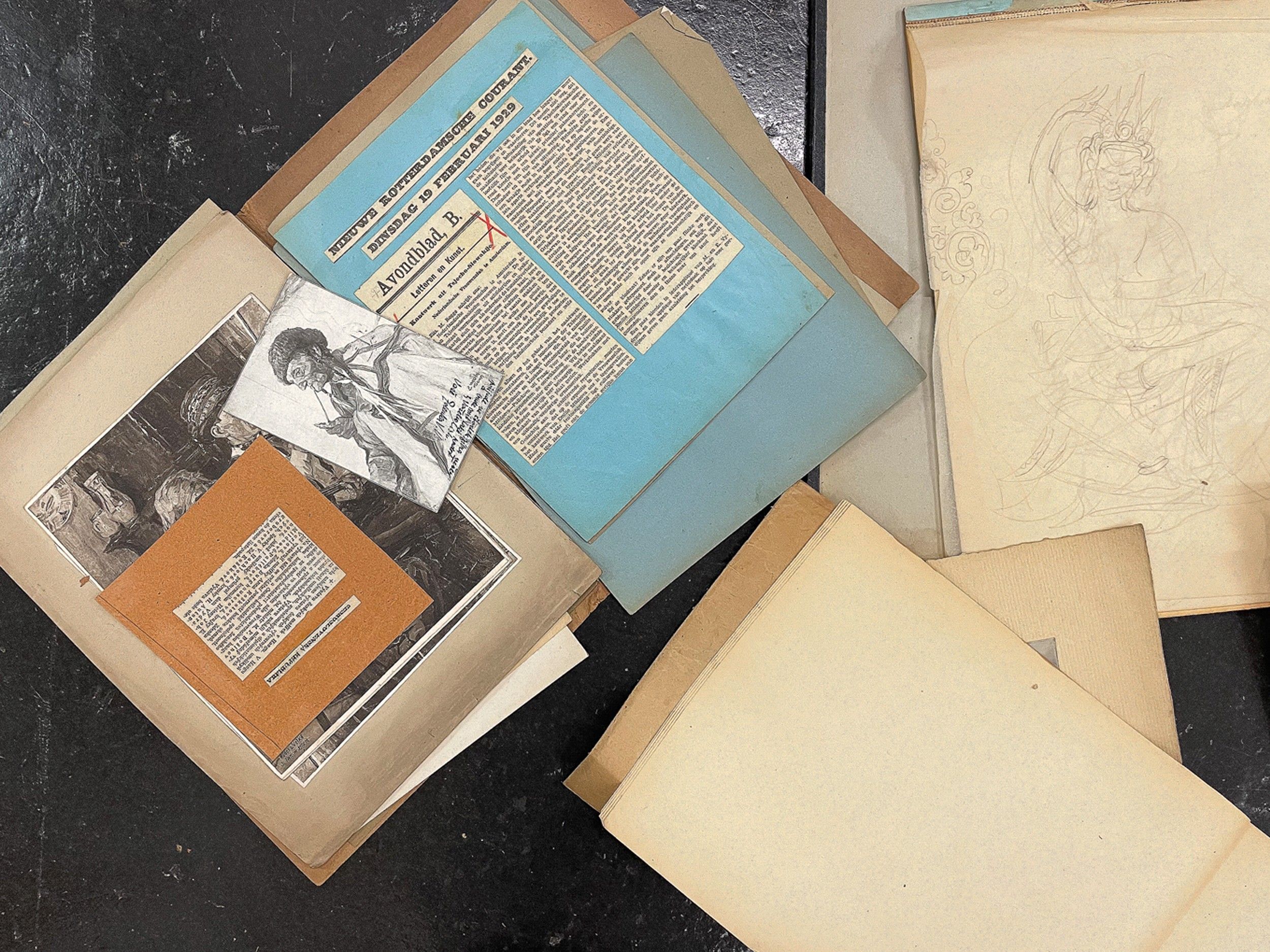 Collection of sketches, photos, and newspaper clippings