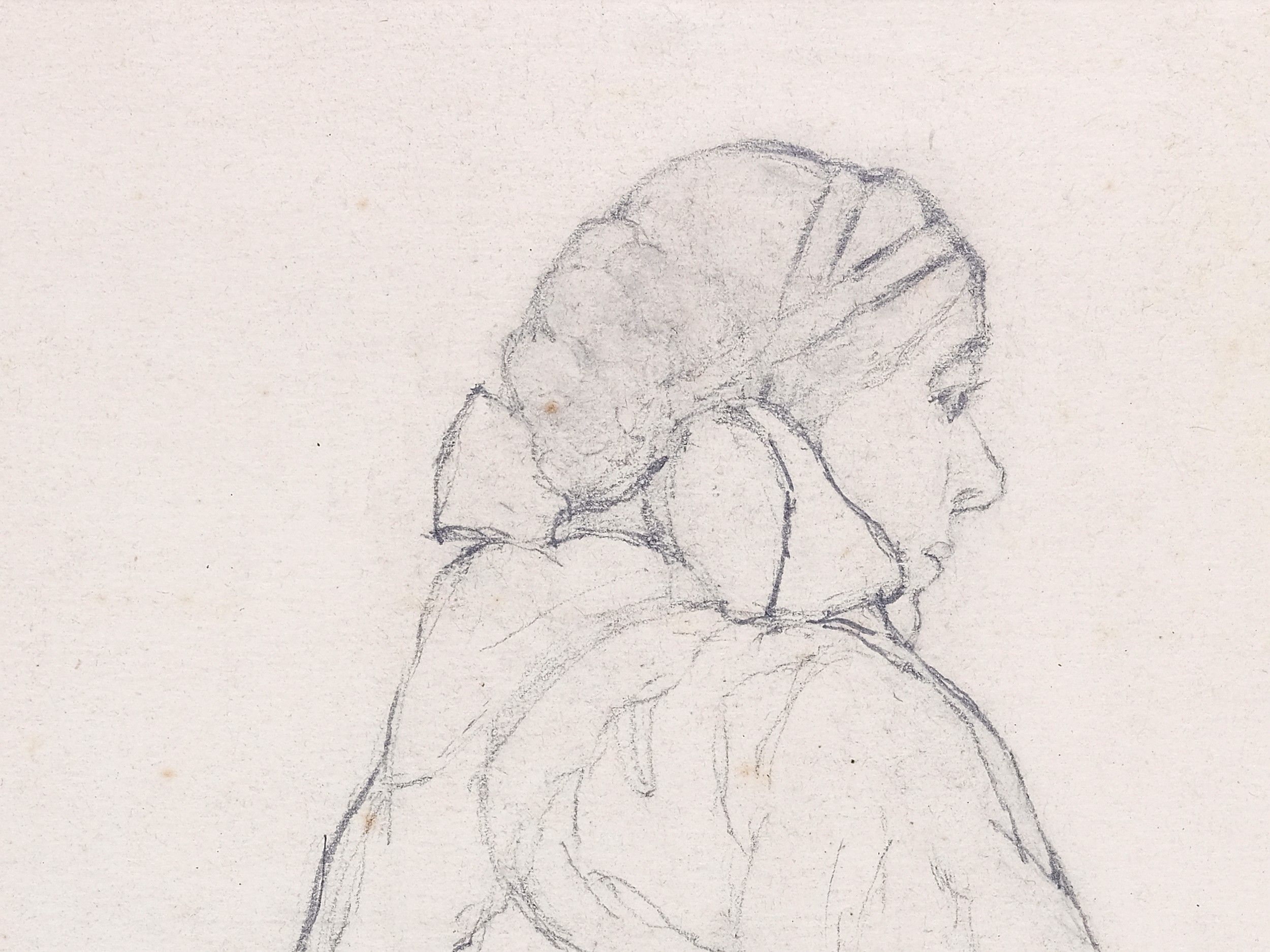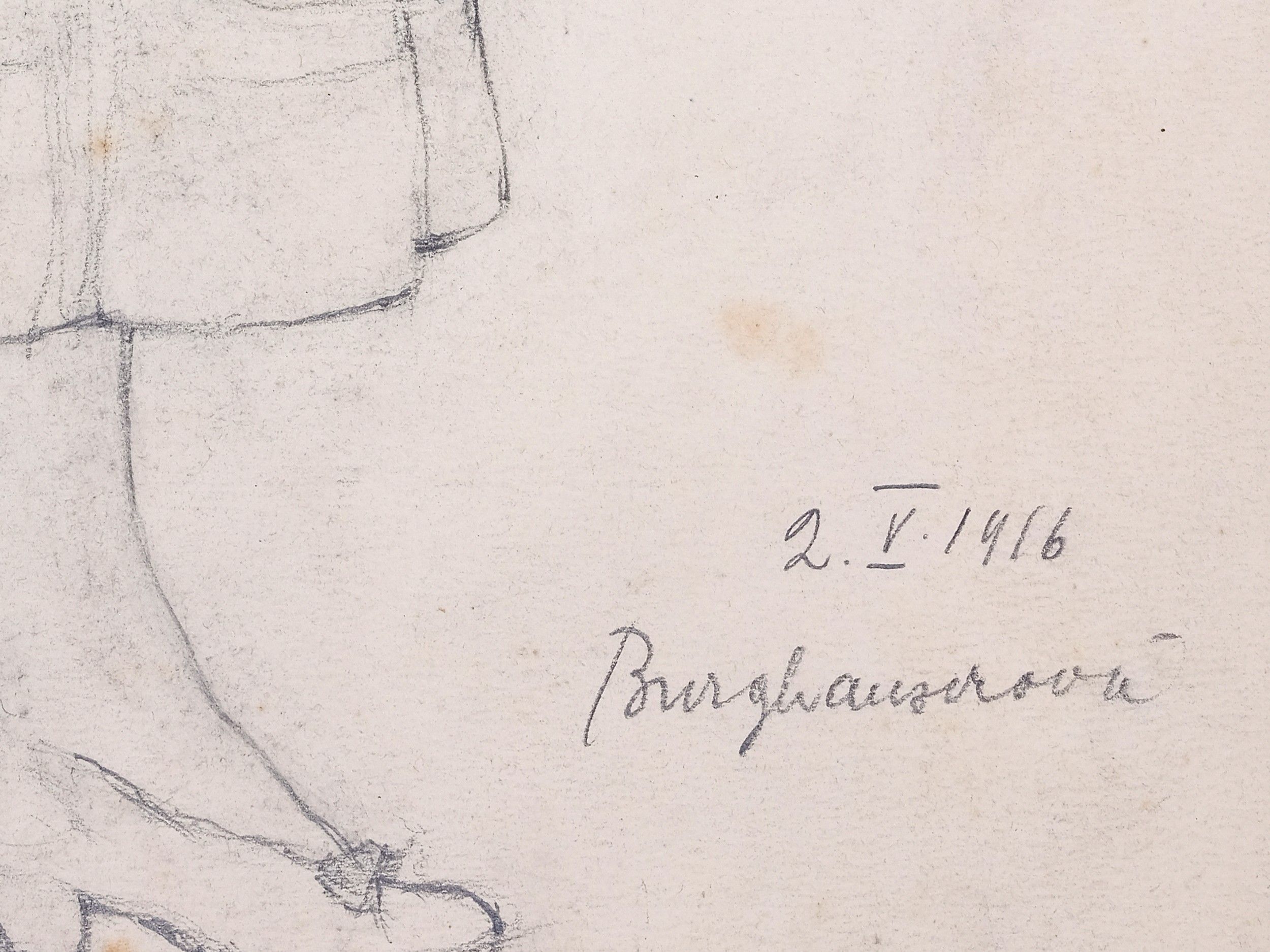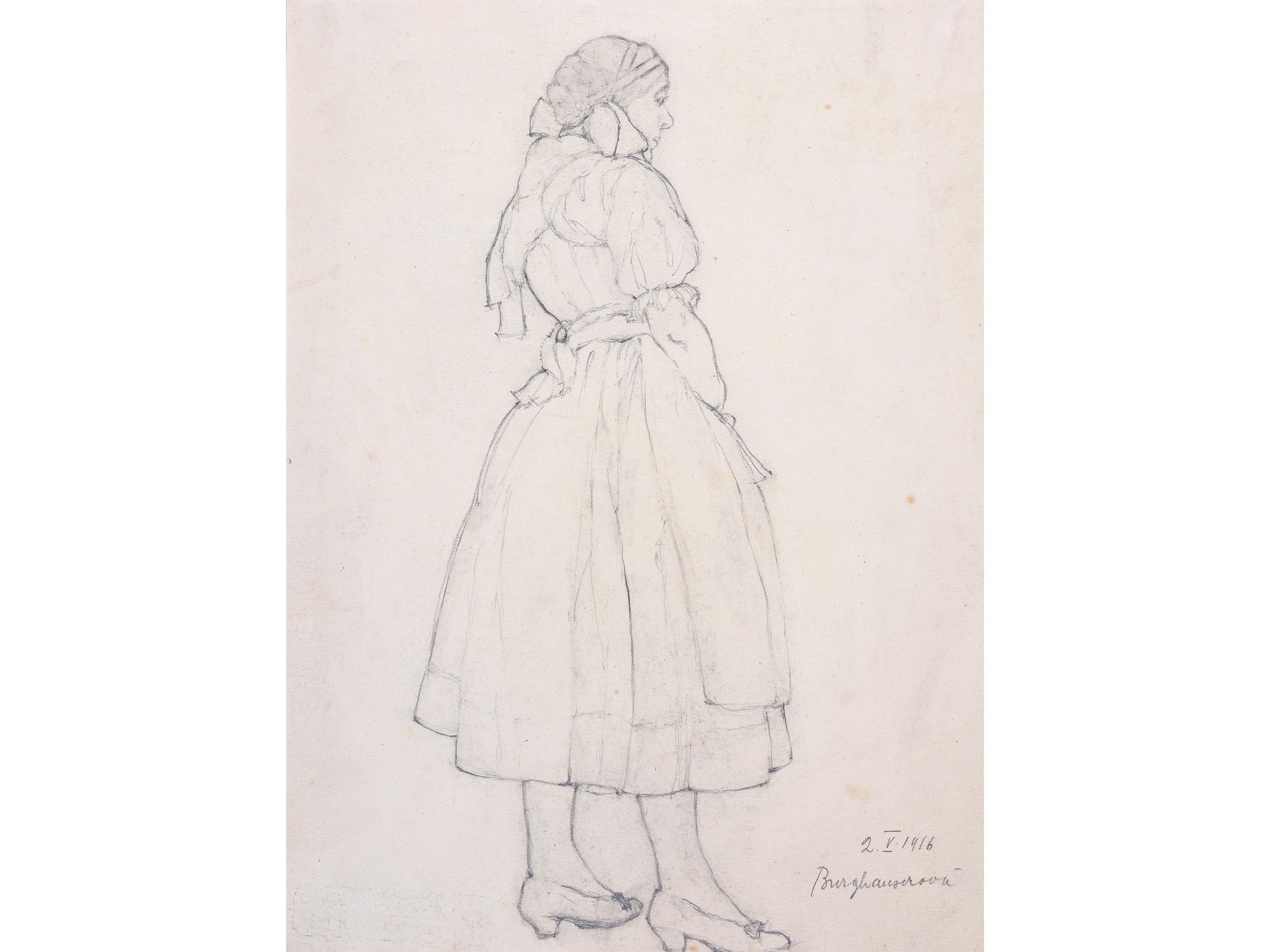 Zdenka (Jarmila) Mokrá-Burghauserová Chrudim 1894 - 1960 Prague Study sheet Pencil drawing on paper 36.5 x 26.8 cm Signed & dated 1916 lower right Zdenka (Jarmila) Mokrá-Burghauserová (1894–1960) was a Czech painter, graphic artist, and educator. After studying at the School of Applied Arts in Prague, she taught in Plzeň and Prague, while at the same time creating a diverse body of artistic work that attracted considerable attention, especially during the Second World War. She undertook numerous study trips to Southern and Western Europe, Egypt, Lebanon, and Syria. In 1920, she was one of the founding members of the Circle of Women Artists (Kruh výtvarných umělkyň) and was strongly committed to raising the international profile of Czech women artists in the late 1920s. Her correspondence documents in particular her decisive role in the exhibitions held in Amsterdam and The Hague in 1929. Despite personal crises and a temporary ban on exhibitions from 1948 to 1957, she made an important contribution to the artistic emancipation of women and the cultural representation of the young Czechoslovakia.