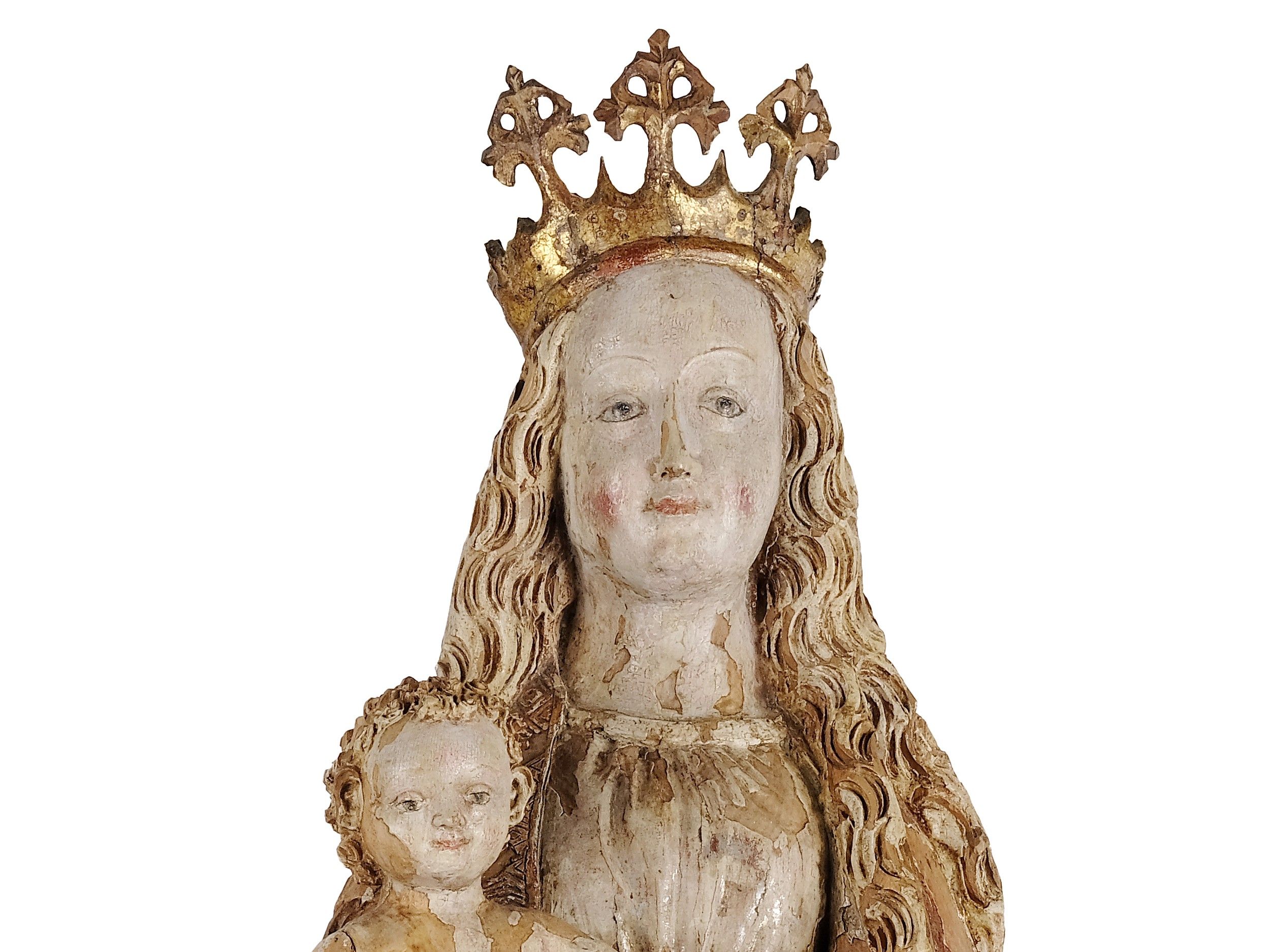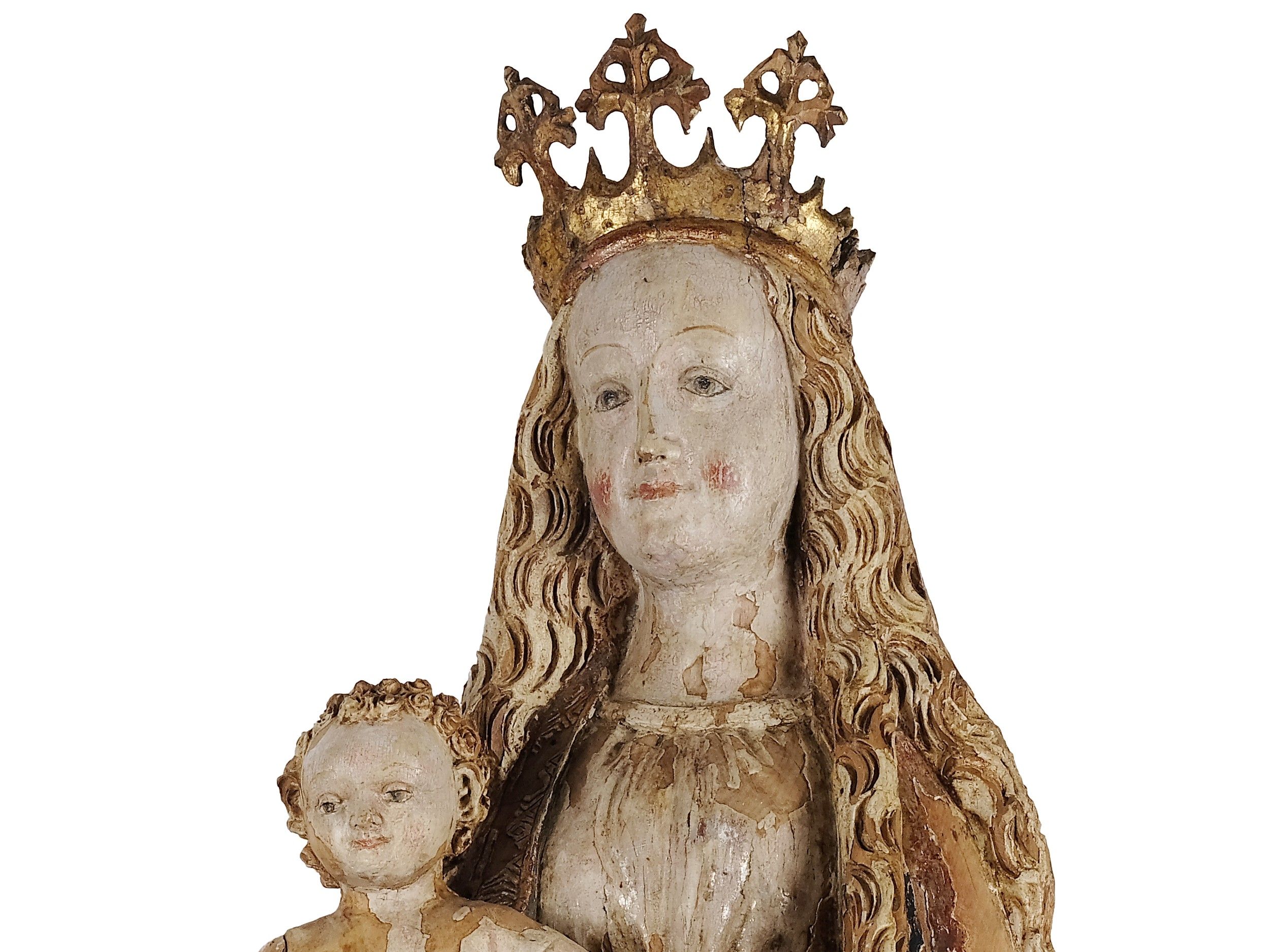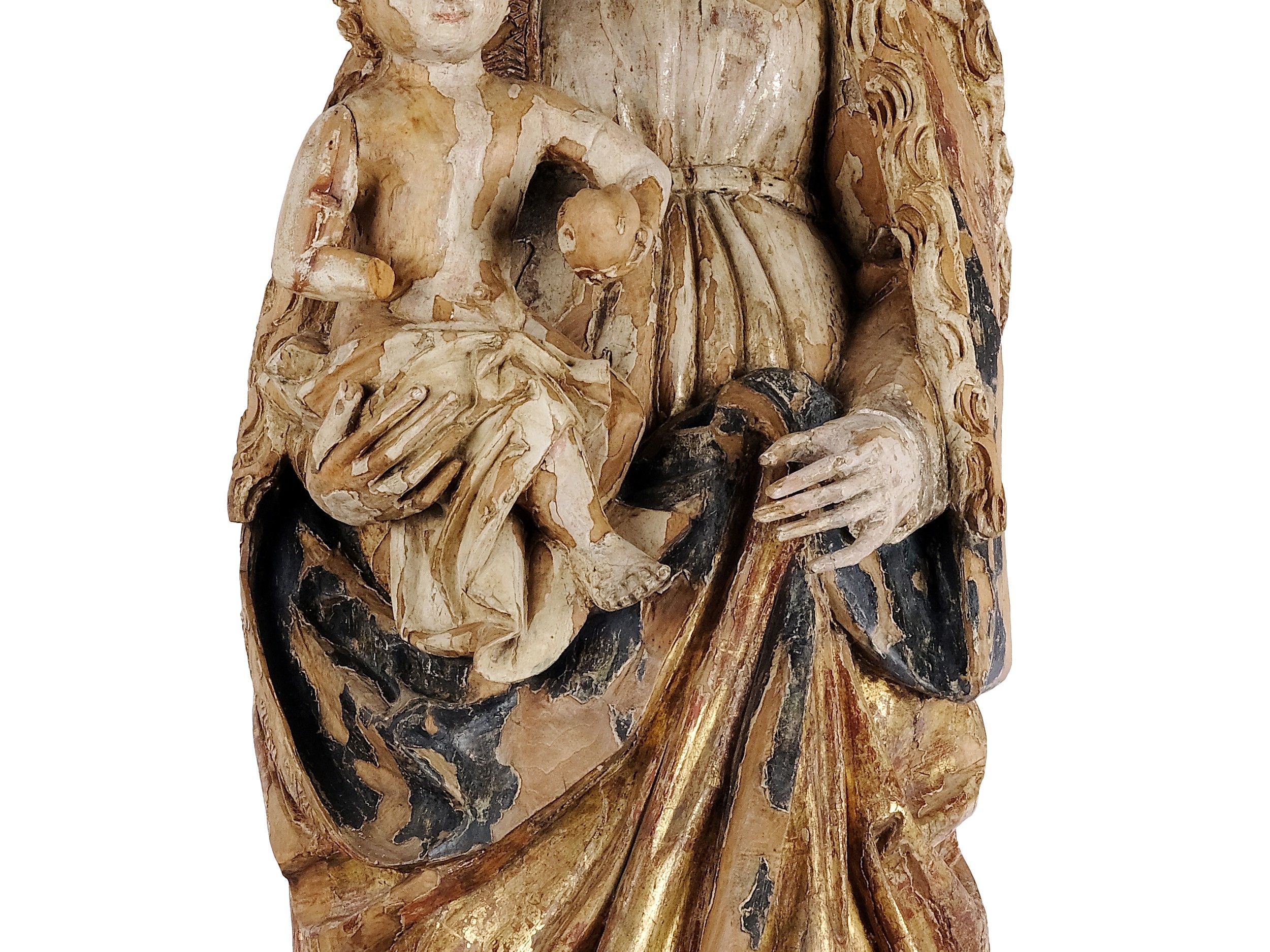 This Madonna reflects the unmistakable craftsmanship of late Gothic sculptors, who combined devotional symbolism with idealized beauty and detailed design. Mary is depicted not only as the gentle mother of Christ, but also as a majestic queen and apocalyptic victor, standing triumphantly on the crescent moon—a figure of heavenly grace and human warmth at the same time.