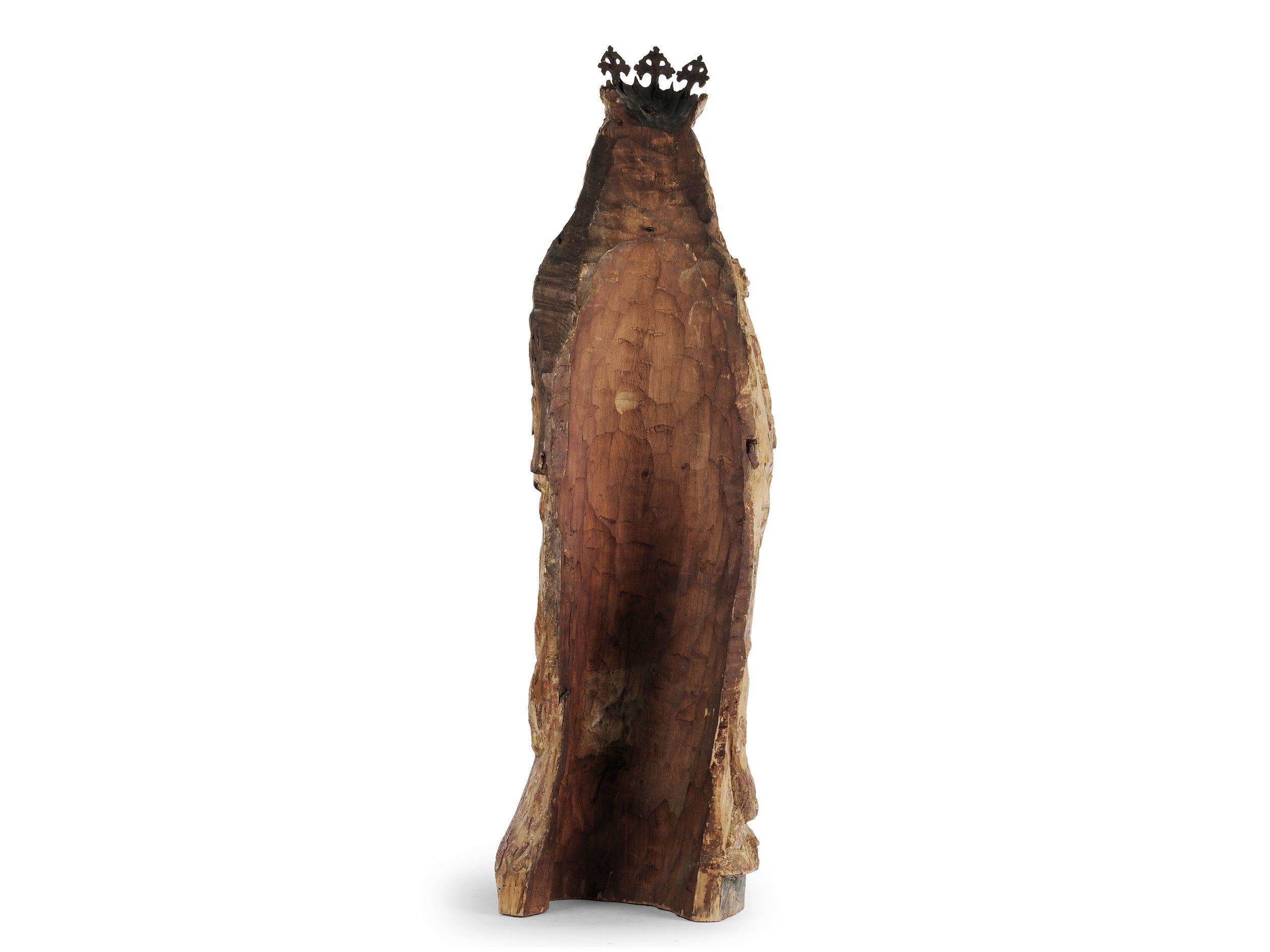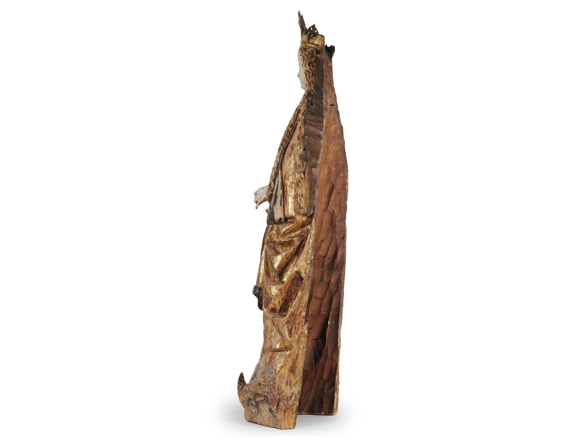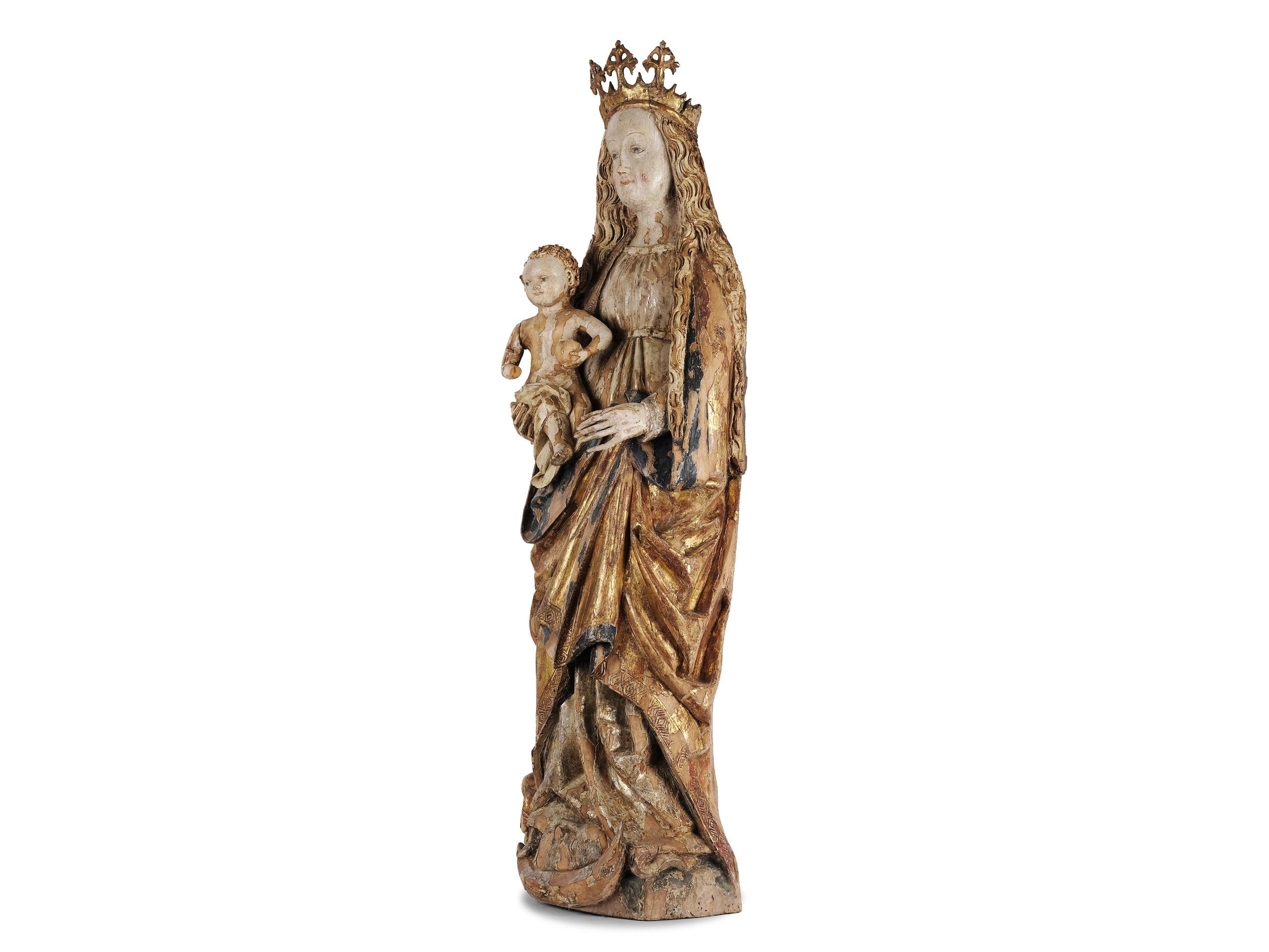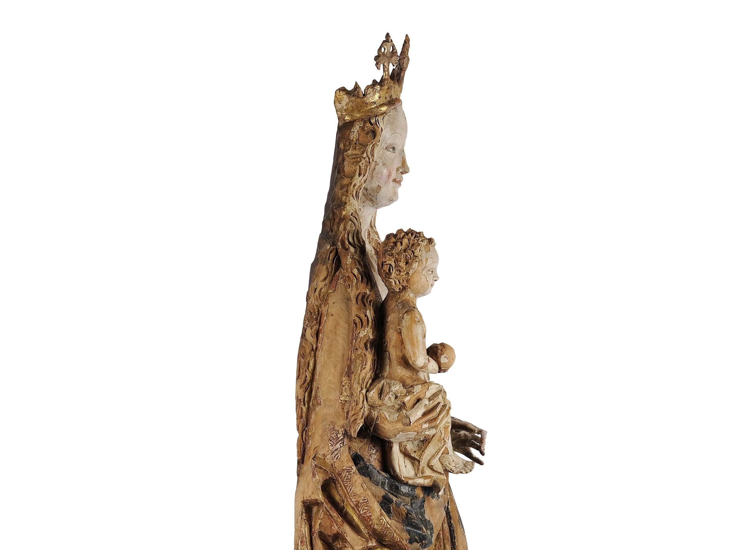 This Madonna reflects the unmistakable craftsmanship of late Gothic sculptors, who combined devotional symbolism with idealized beauty and detailed design. Mary is depicted not only as the gentle mother of Christ, but also as a majestic queen and apocalyptic victor, standing triumphantly on the crescent moon—a figure of heavenly grace and human warmth at the same time.