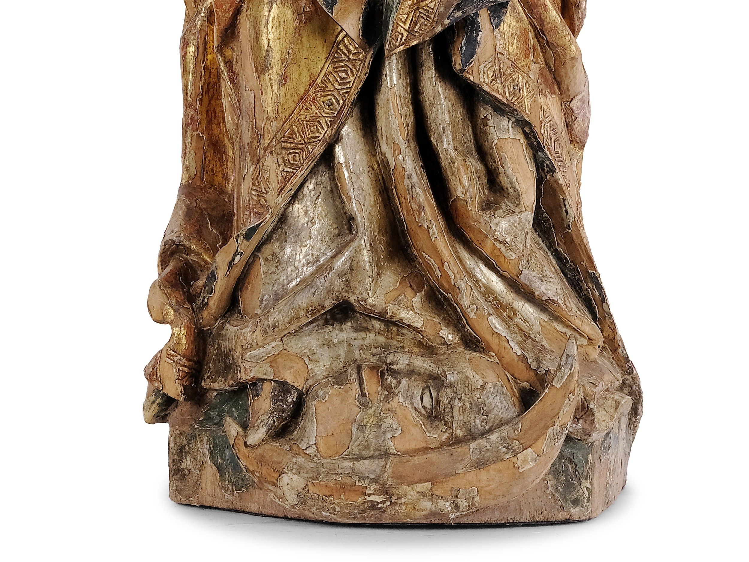 A defining element of this sculpture is the crescent moon beneath Mary's feet, a symbolic sign closely associated with Marian iconography and apocalyptic visions. The face in the crescent moon refers to the Book of Revelation (12:1): "And a great sign appeared in heaven: a woman clothed with the sun, with the moon under her feet and a crown of twelve stars on her head." This associates Mary with the woman of the Apocalypse, a figure of victory over darkness. Such representations were of particular significance to medieval audiences, who saw Mary not only as a loving mother but also as a powerful intercessor in the cosmic struggle between good and evil. According to popular belief, the face on the moon can also have a secular meaning, possibly capturing the image of the carver or a person in his workshop, thus immortalizing the creator in an otherwise divine context.