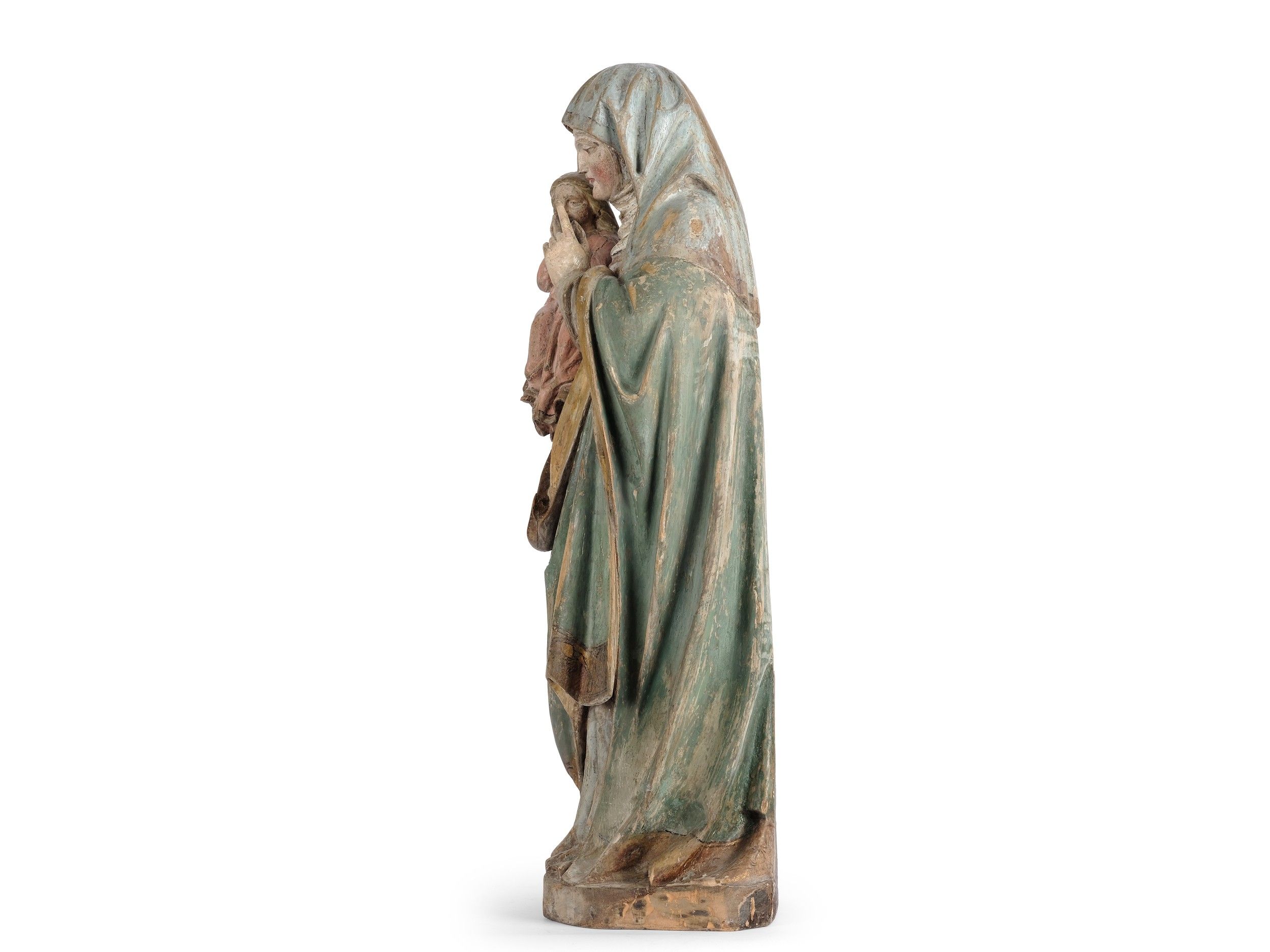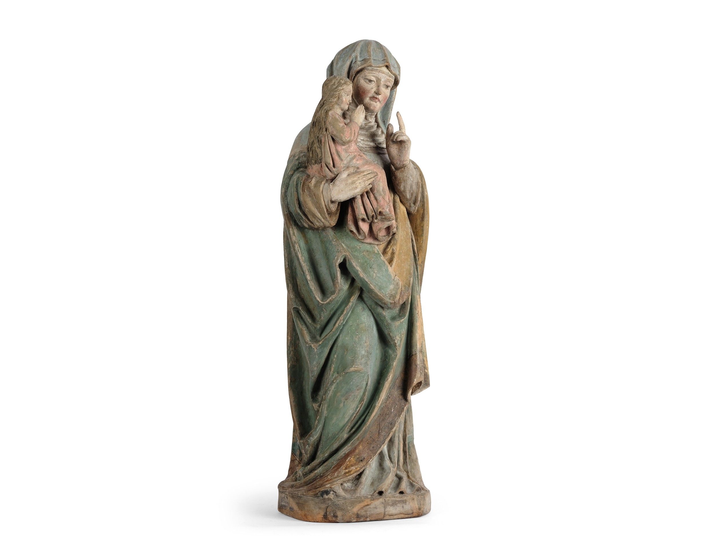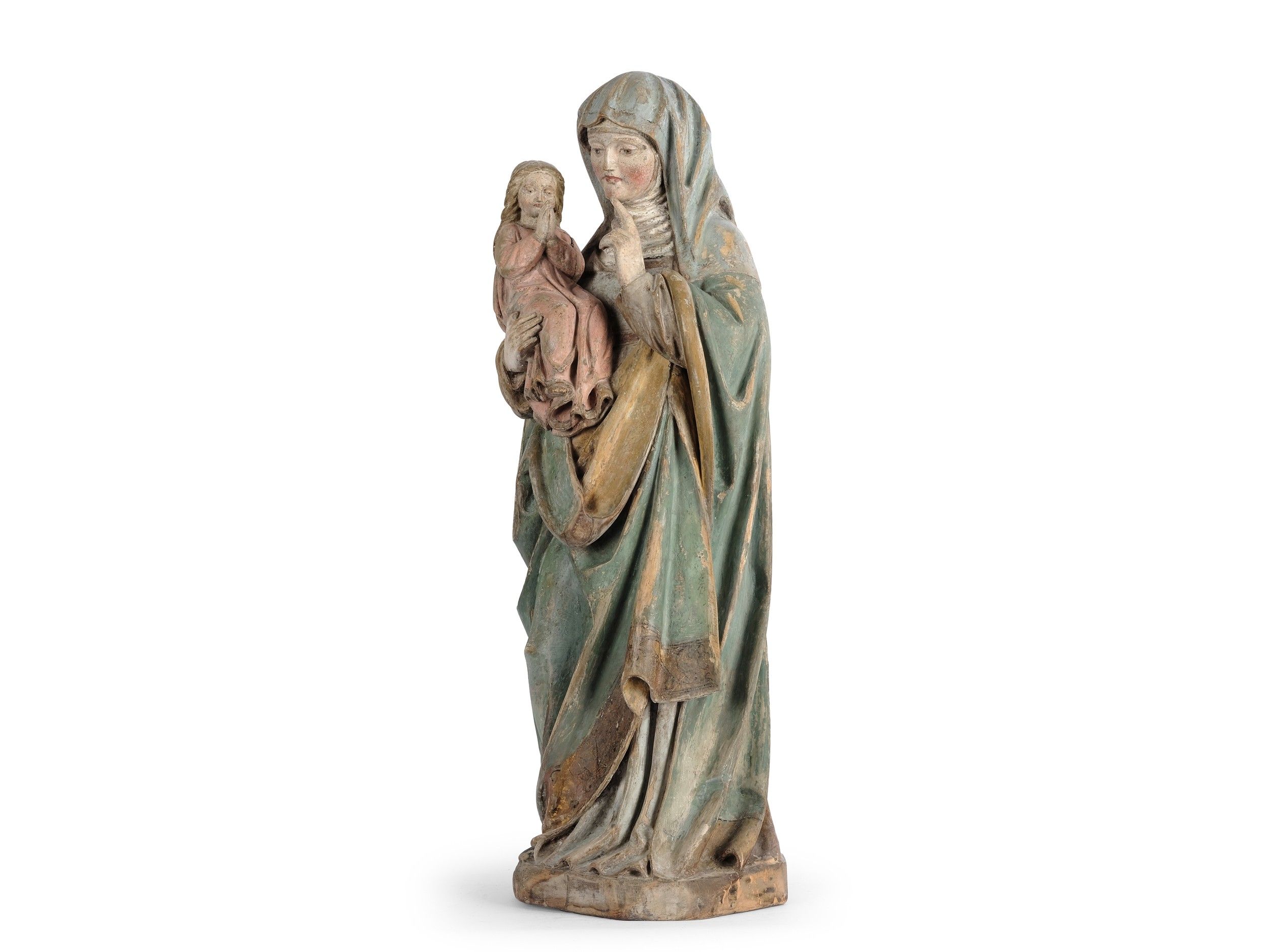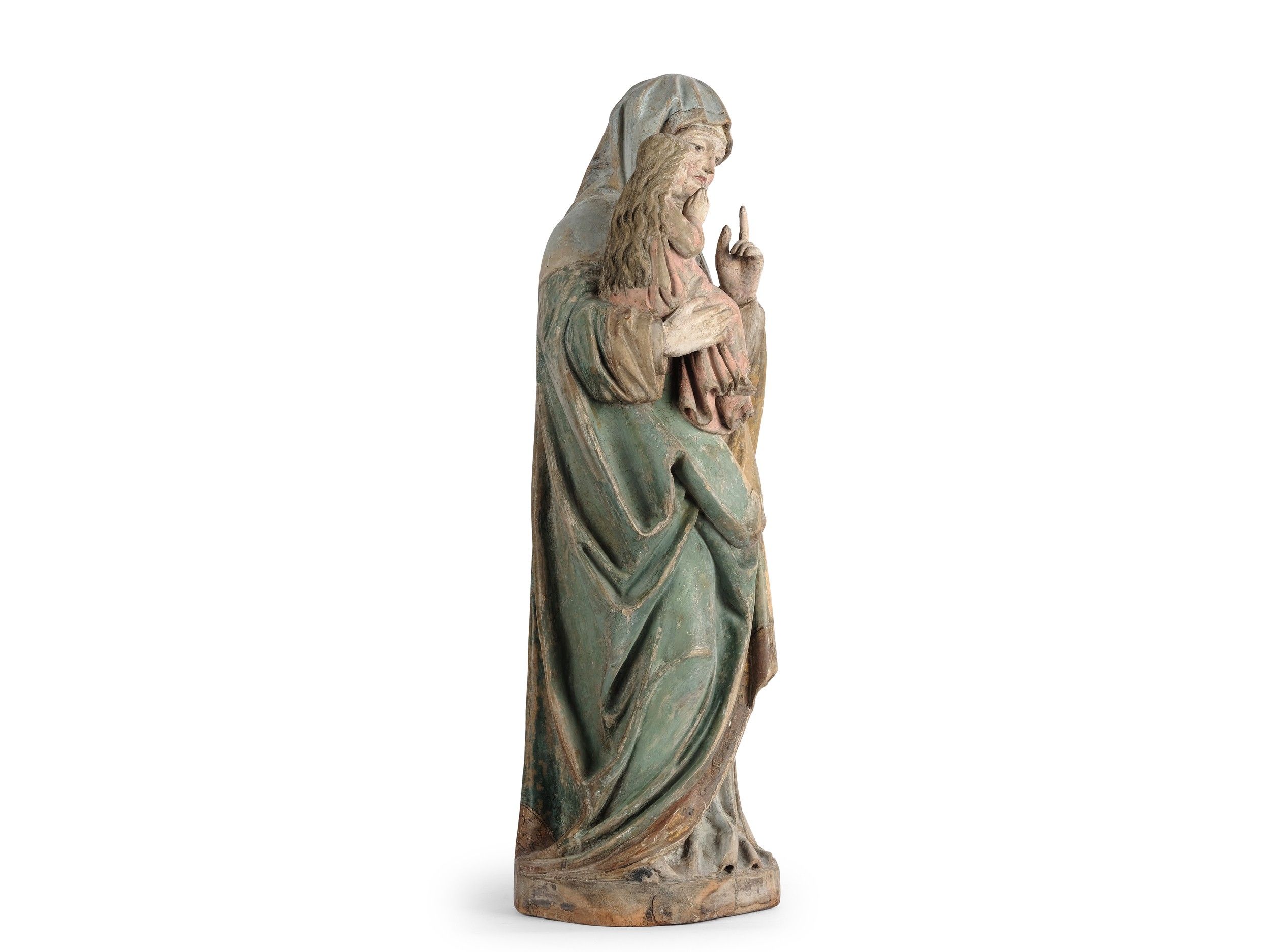 Particularly impressive is the stylistic elaboration of the faces and garments, which is rooted entirely in the formal language of the period around 1500. Anna's sharp eyebrows, almond-shaped, alert eyes, small pointed nose, and dimpled mouth give the figure a striking presence characteristic of late Gothic imagery. The masterful tubular folds in Mary's dress beneath Anna's hand and the striking V-shaped bowl folds at the side also testify to the artist's high level of carving skill. Finally, small, finely applied folds spread out at the hem of Anna's robe, lying almost manneristically on the base plate and already revealing a striving for increased elegance. Such details reveal how late Gothic elements were combined with the increasingly playful sense of form of the early Renaissance – very similar to the early works of Daniel Mauch, the important Ulm woodcarver who gained prominence at the beginning of the 16th century for his realistic conception of figures and complex drapery. The figure is therefore comparable to the circle of his workshop, especially in the bulging folds and the clear distinction between close-fitting and more voluminous folds.