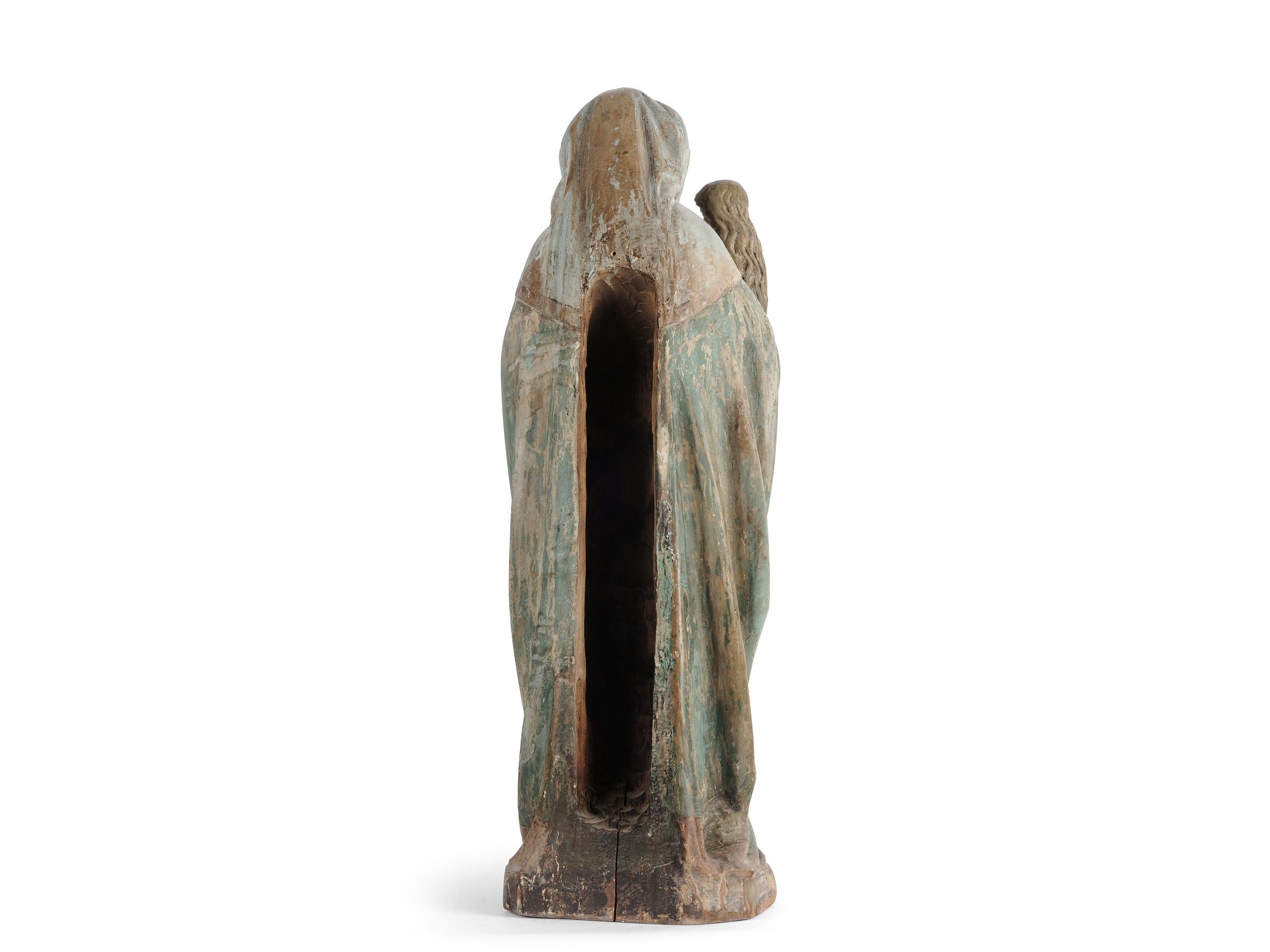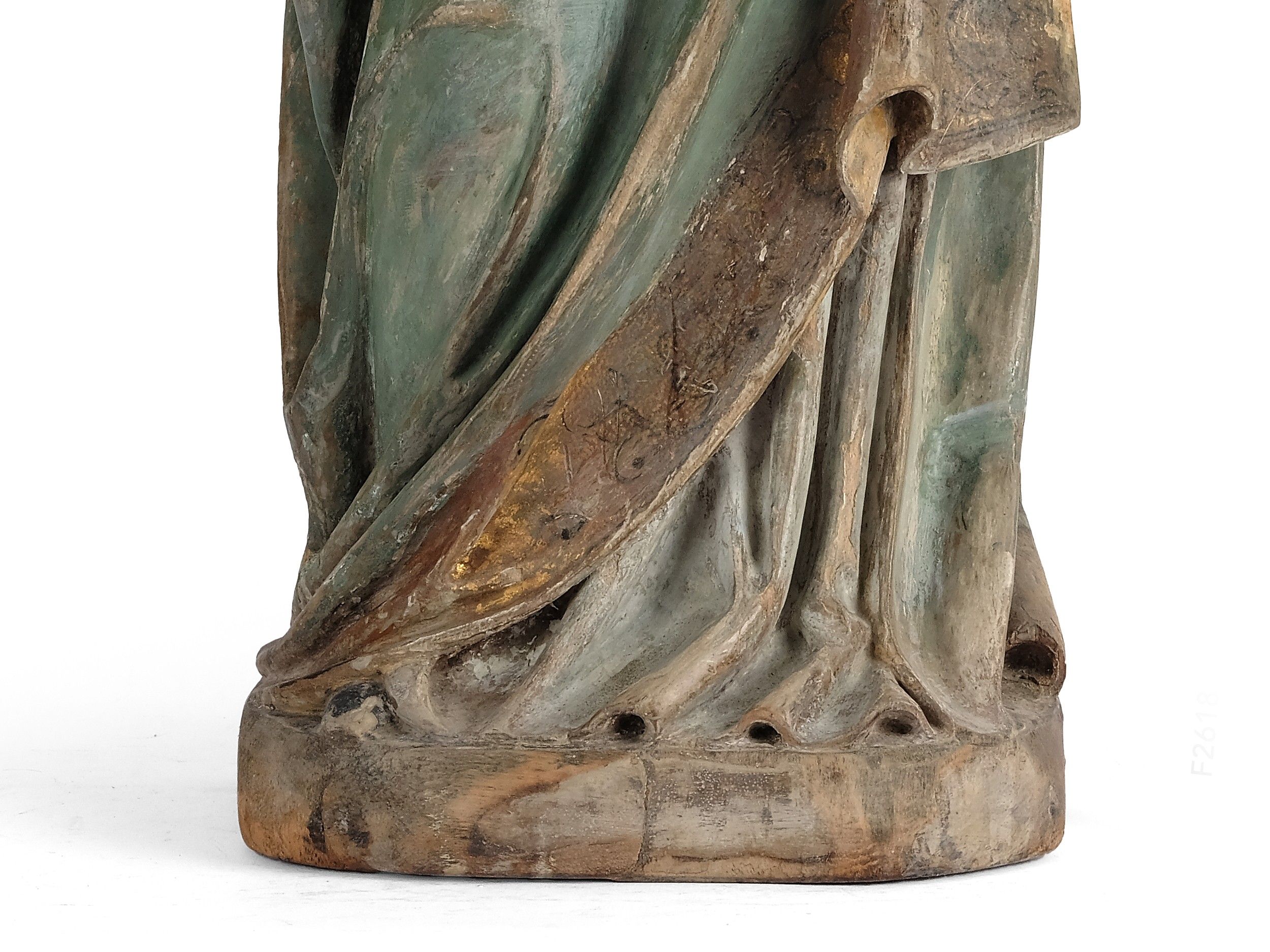 Another noteworthy aspect is the hollowed-out back of the figure. This technique not only served to save material and weight, but also prevented the wood from warping too much and cracking. It also refers to the original placement in an altar or niche shrine, where the back was not visible.