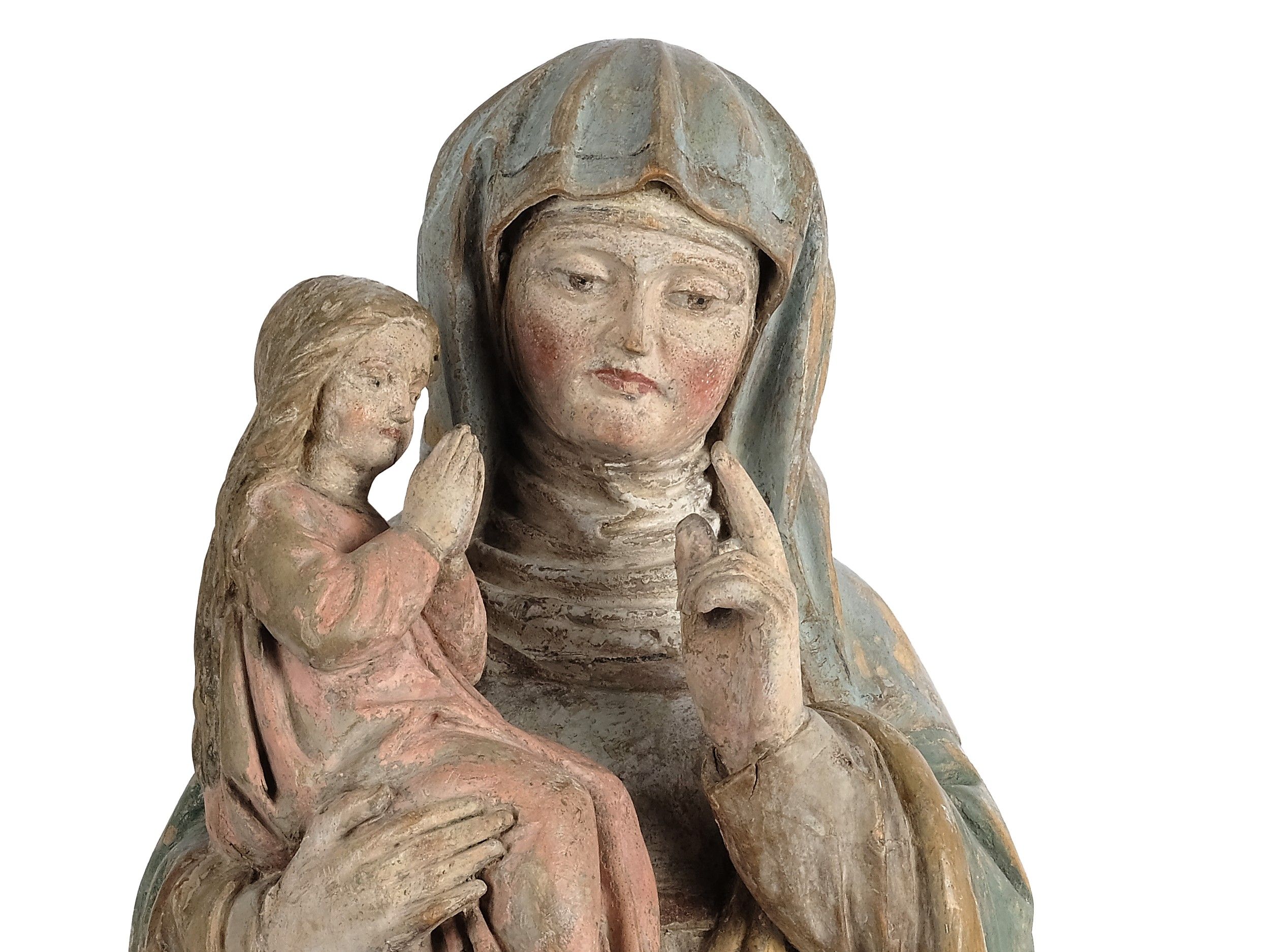 The popularity of the theme is closely linked to contemporary piety: the "Anna Selbdritt" motif and its variants were an expression of veneration that focused on family closeness and religious education. The group of figures depicting Anna and Mary already anticipates the relationship between Mary and Jesus – both in the intimate mother-child motif and in the gestures of instruction and devotion. The sculptor thus not only designed an appealing scene between mother and daughter, but also a preview of the events of salvation history that take shape through Mary and Jesus.