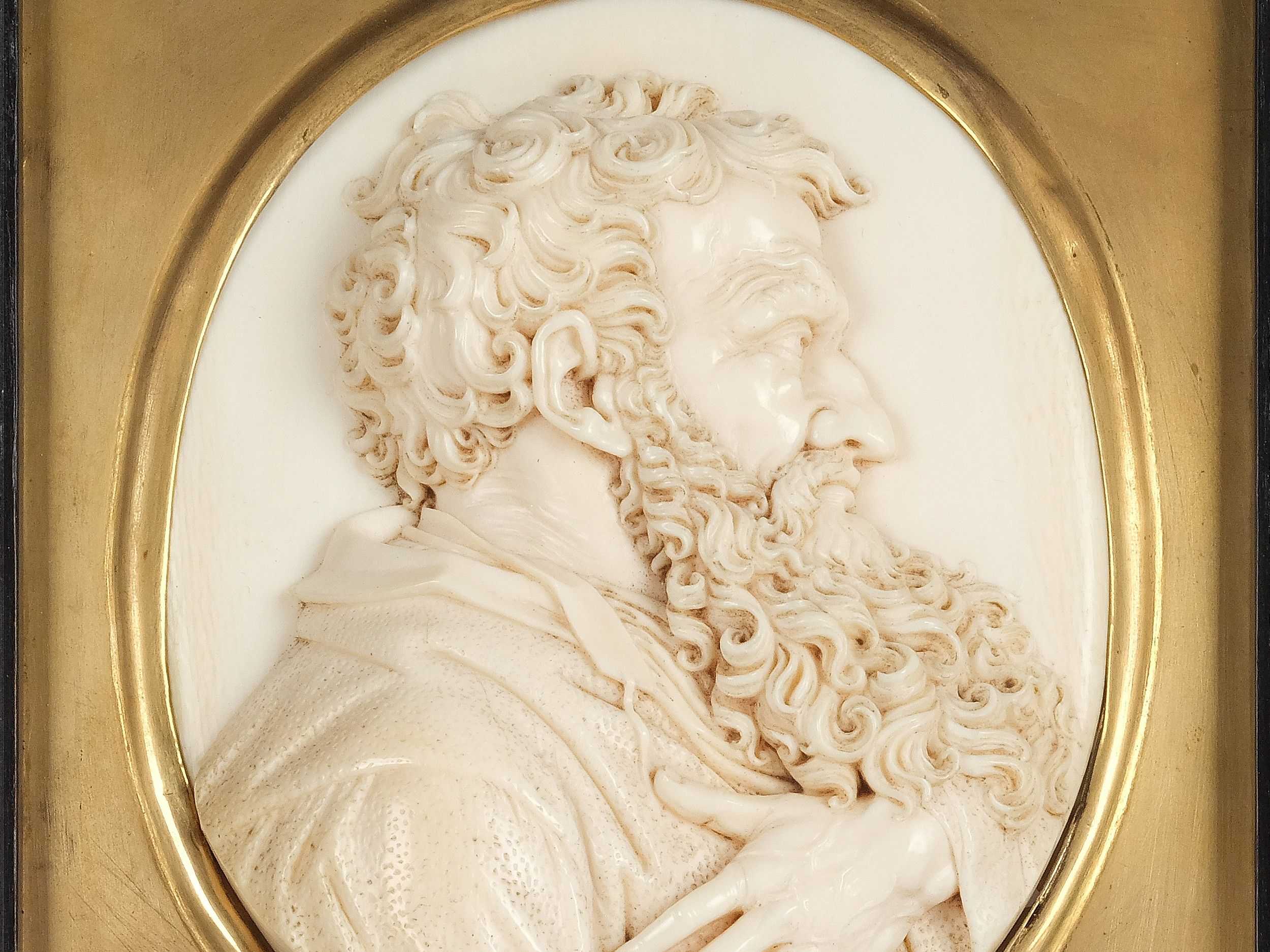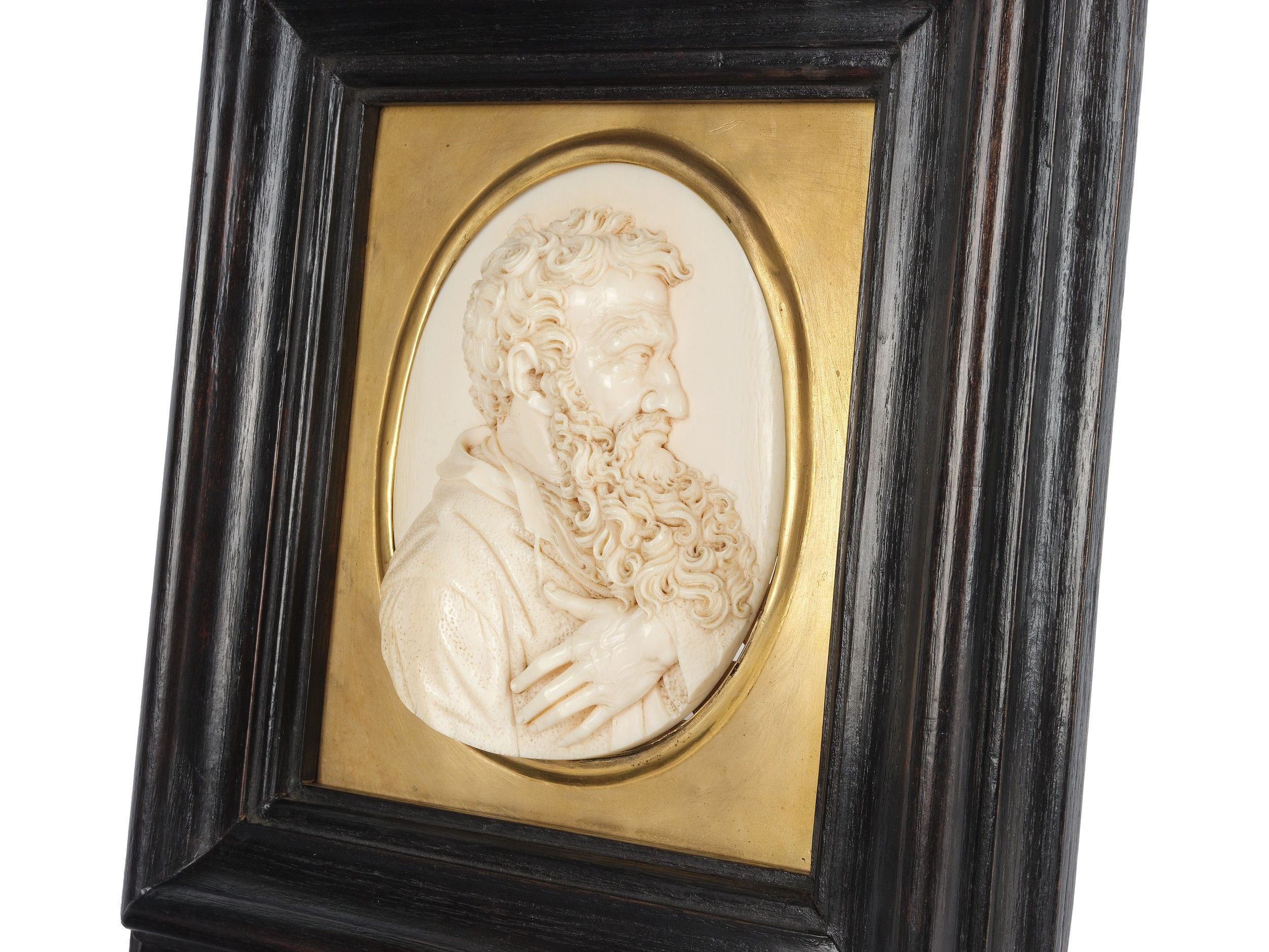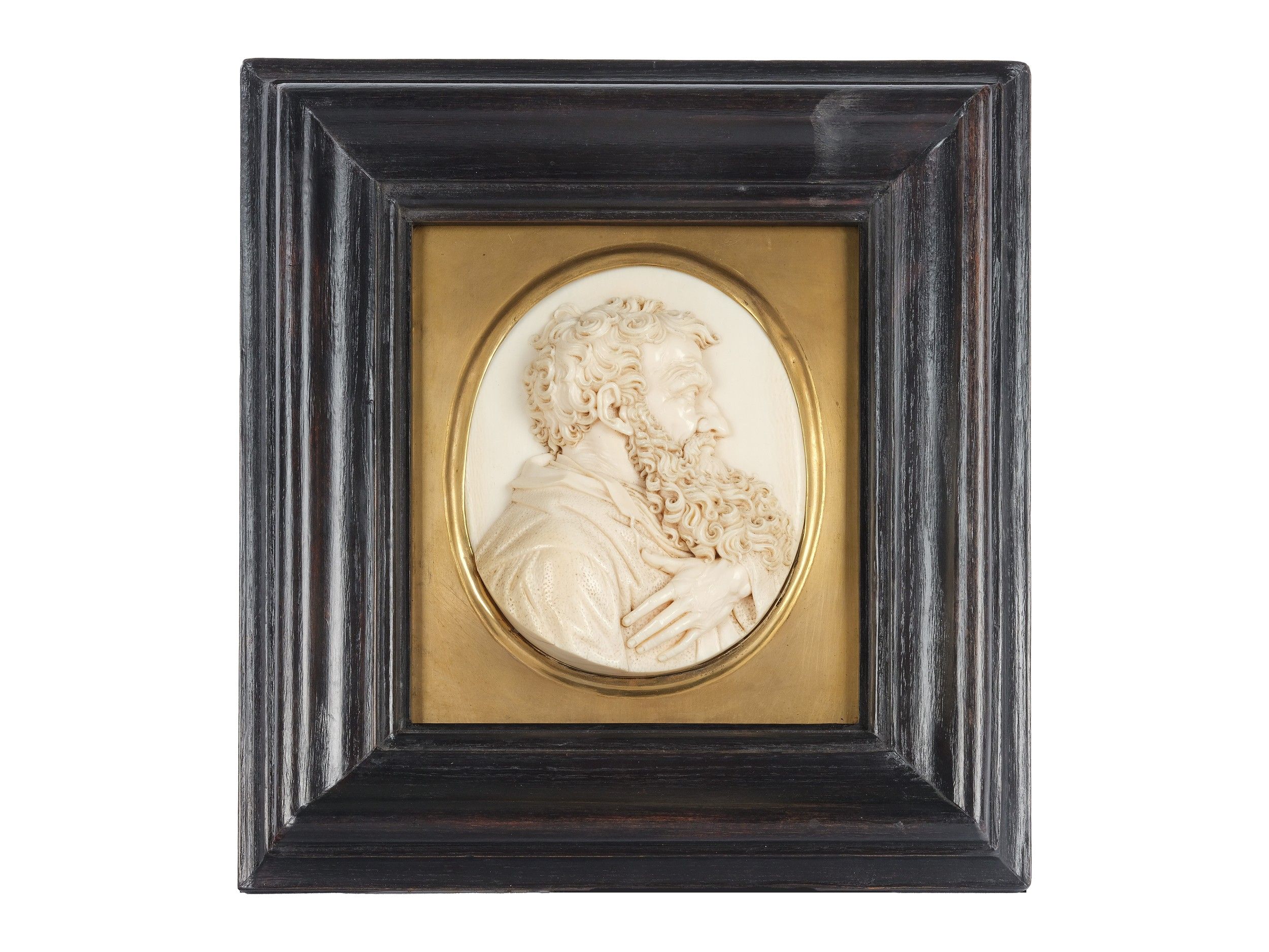 This exquisite relief of St. Paul, created by Leonhard Posch, is an outstanding work in the genre of ivory carving. Posch, a versatile sculptor, medallist and wax modeller, was born in Fügen in 1750 and died in Berlin in 1831. He is best known for his finely crafted and detailed portrait formats. His training and artistic development in Vienna and Berlin led to a remarkable oeuvre of more than 200 portrait models, with which he revolutionized the genre of iron art casting.