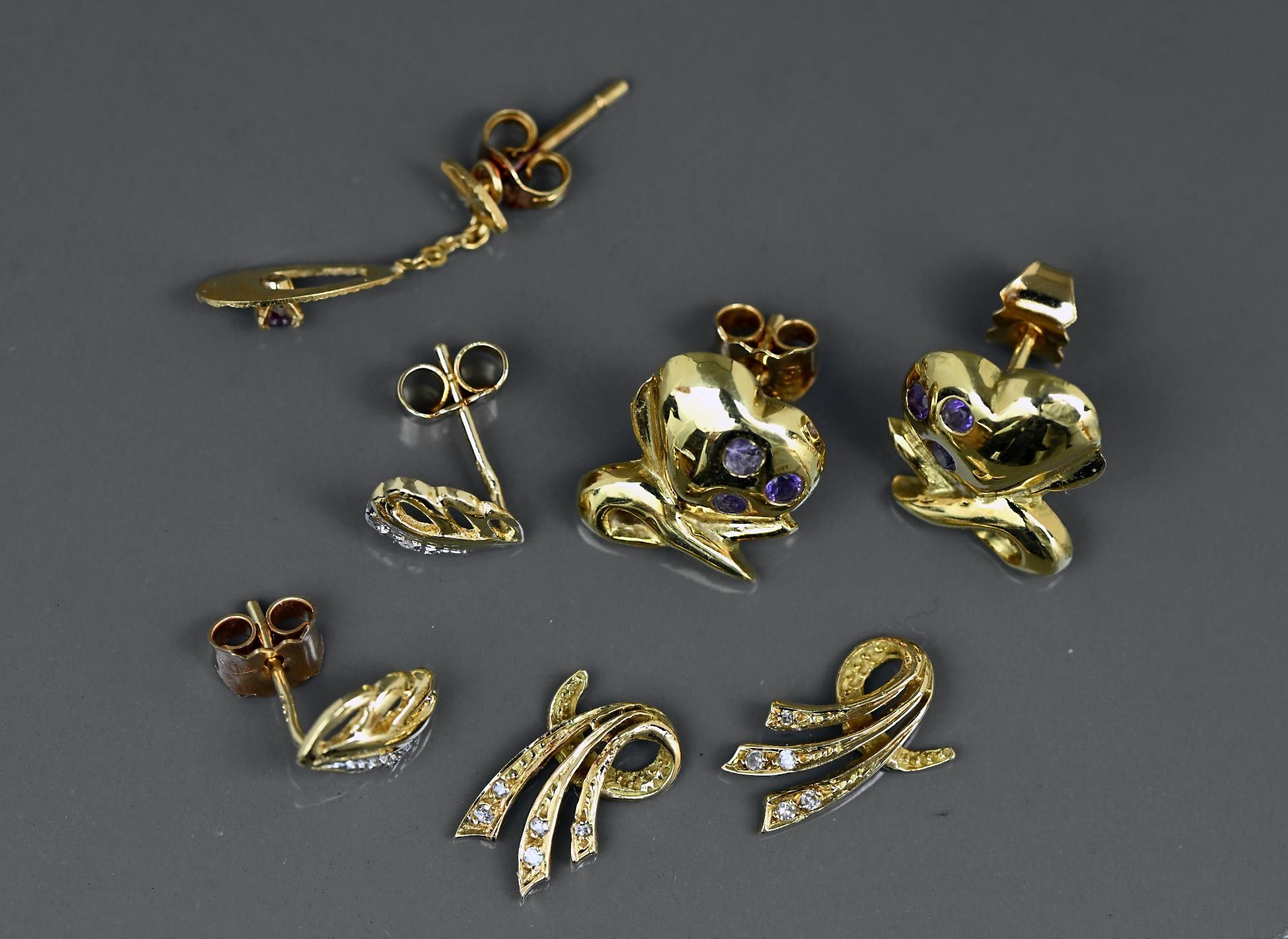 Two pairs of 18k gold earrings. An earring pendant and two charms are included. Weight 6.5g gross.