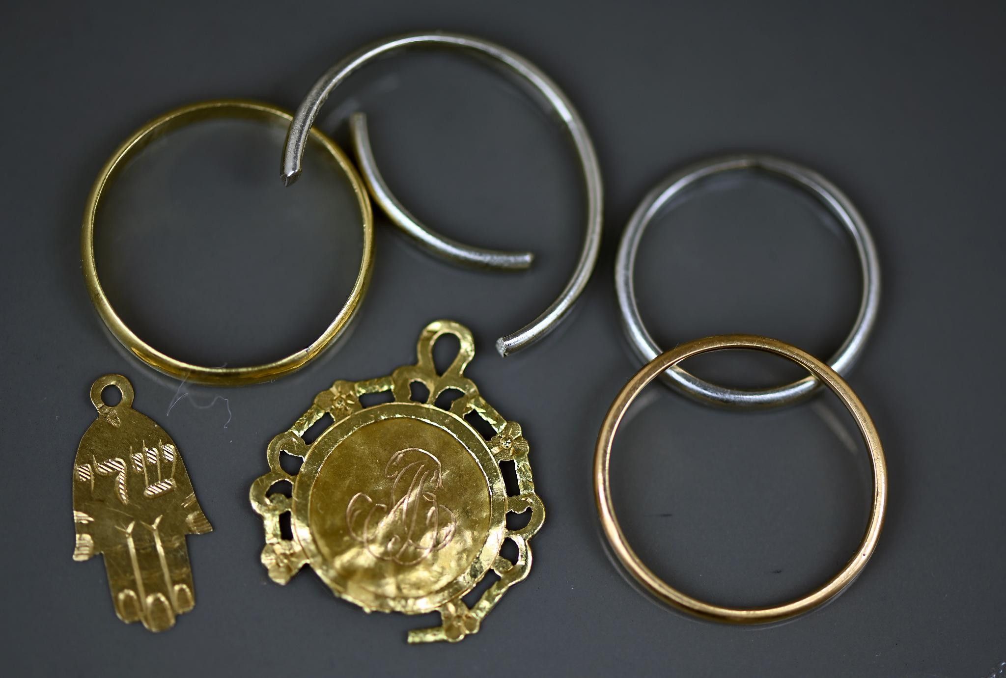 Set of 4 wedding rings and two pendants in different shades …