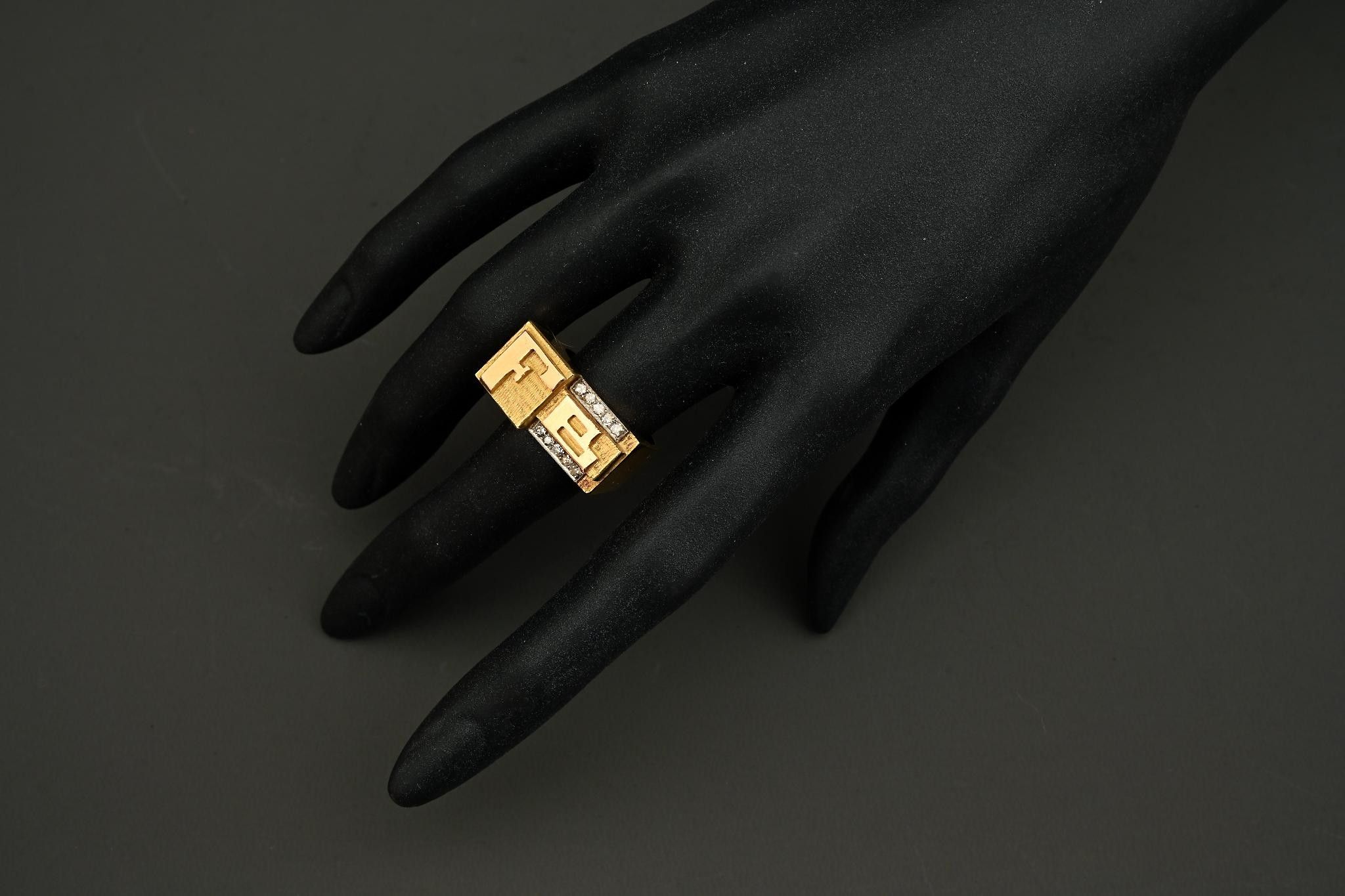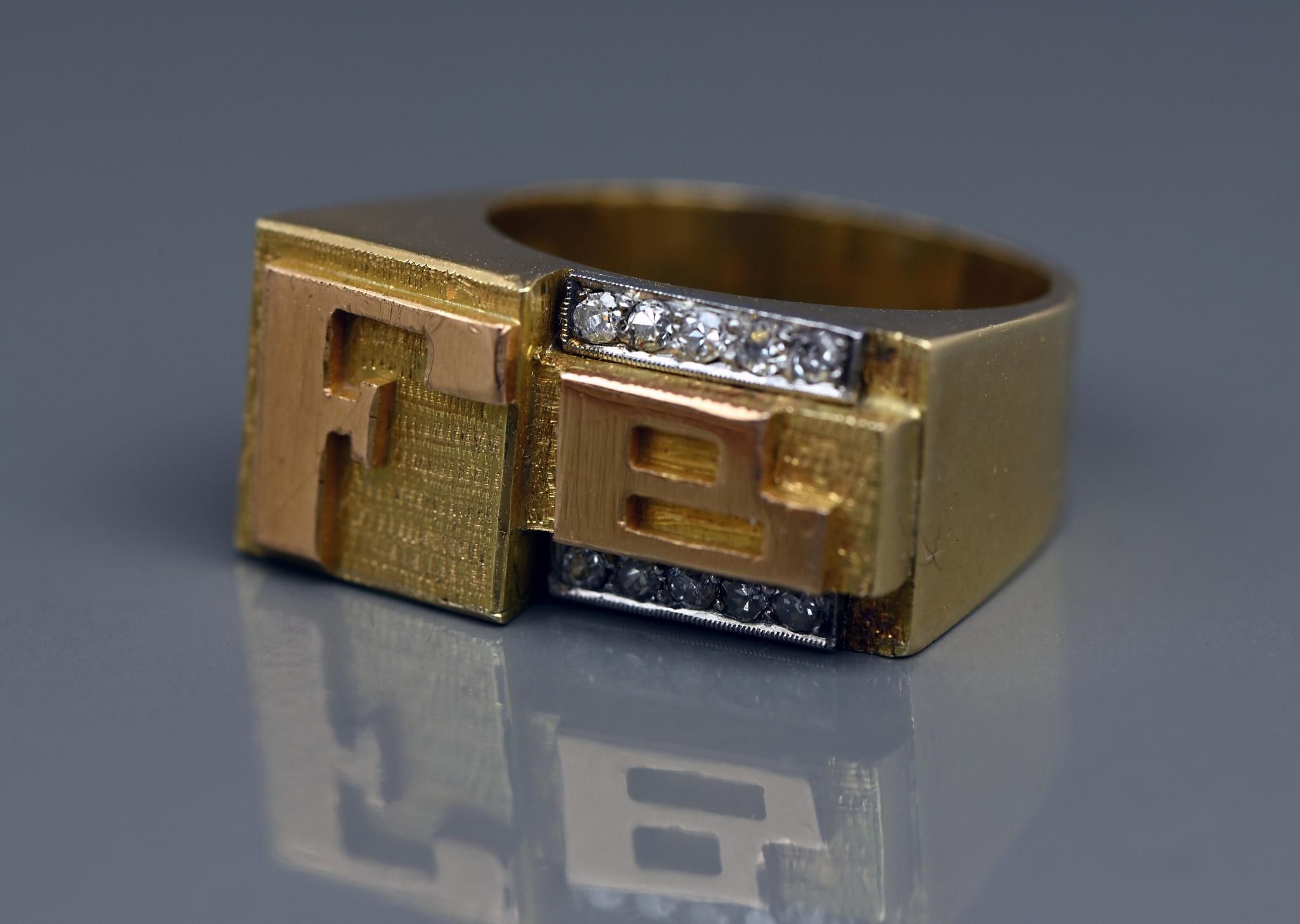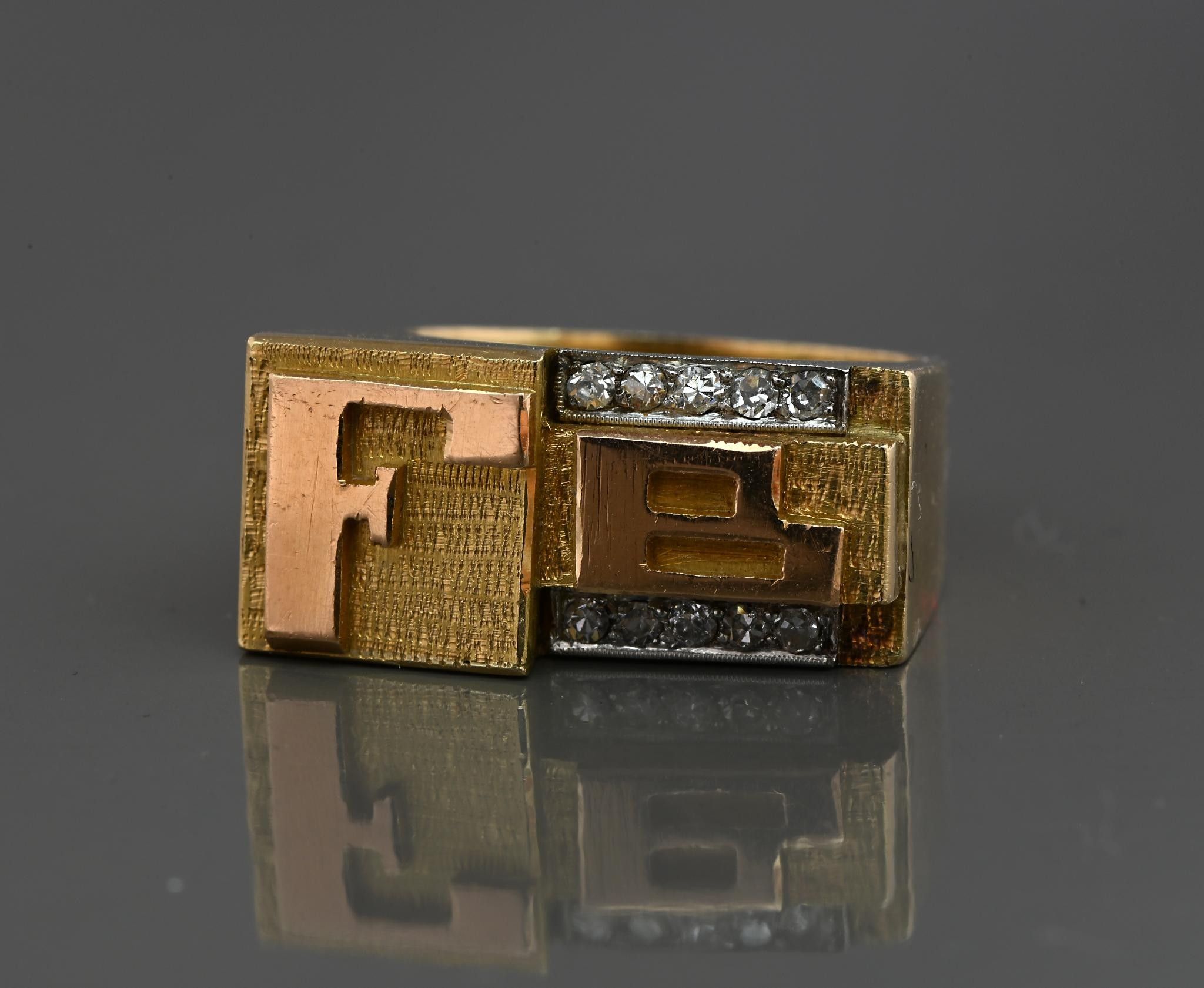 Chevalière in 18k three-tone gold, engraved FB on a guilloch…