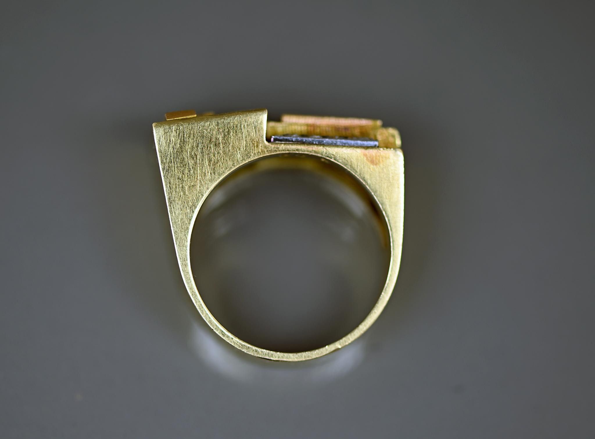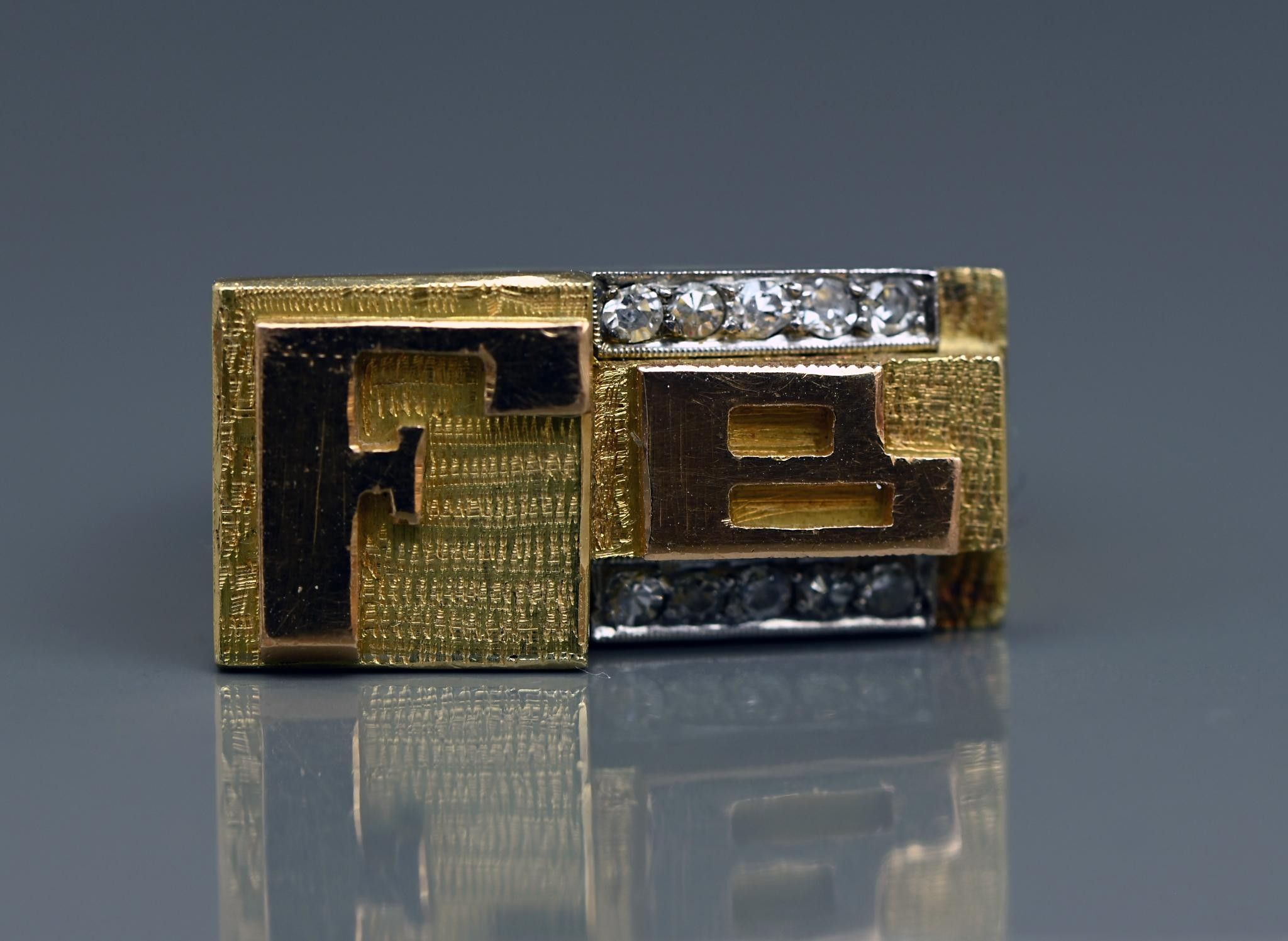 Chevalière in 18k three-tone gold, engraved FB on a guilloché background and set with 10 8/8 diamonds. Size 58/59. Gross weight: 10.75g.