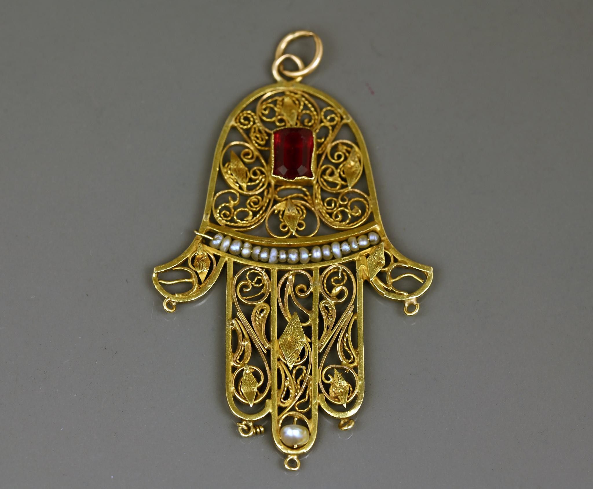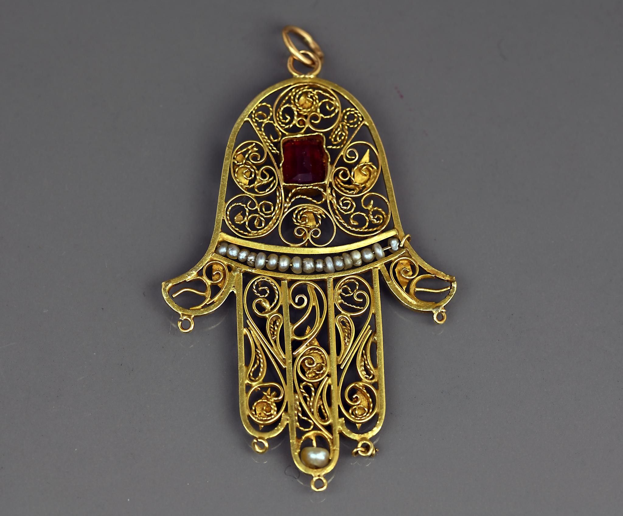 Large Fatma hand in filigree 18k yellow gold, set with a rectangular Verneuil ruby and small pearls. Hooks for charms. Total height: 5.3 cm. Width: 3.2 cm. Gross weight: 4.97g.