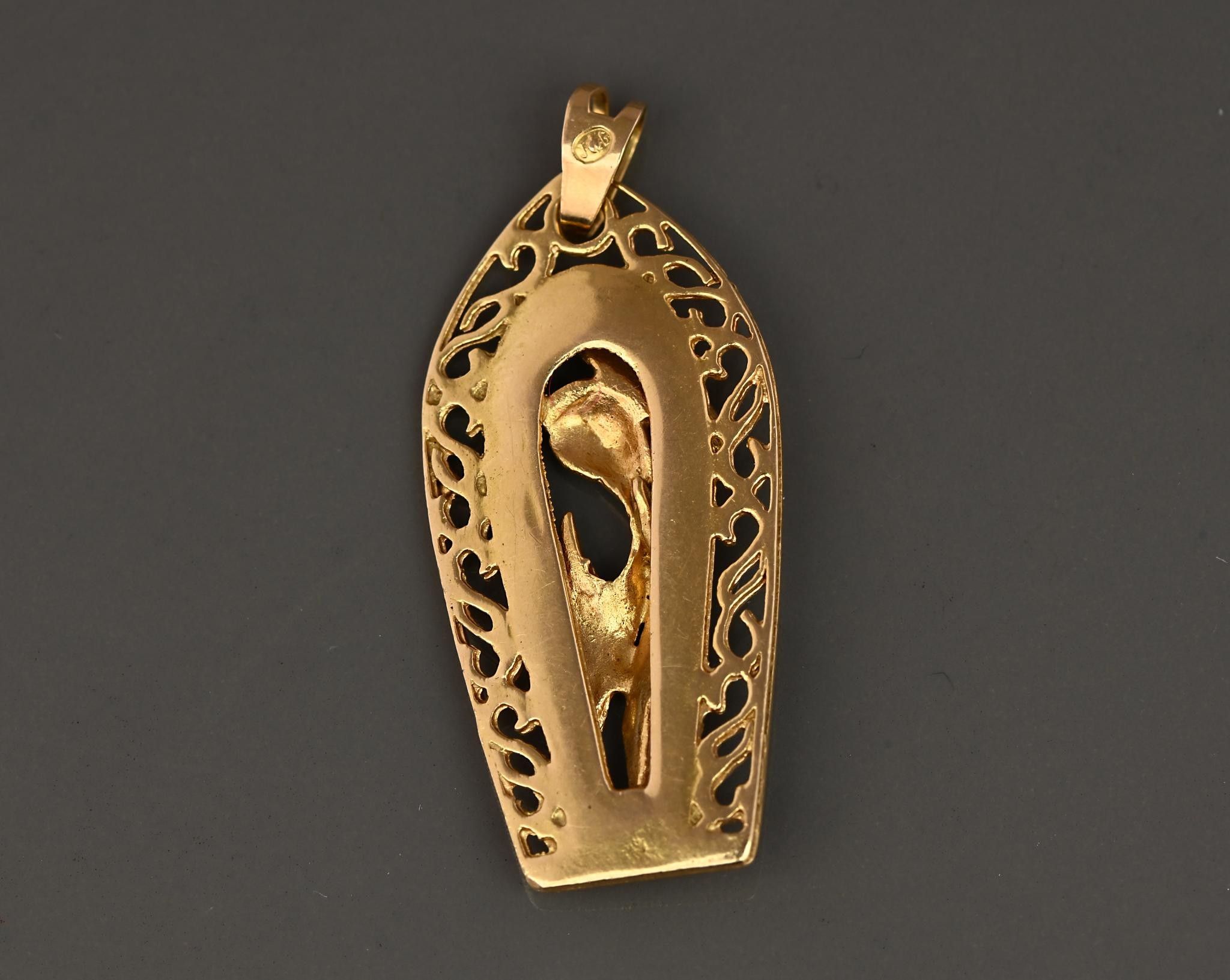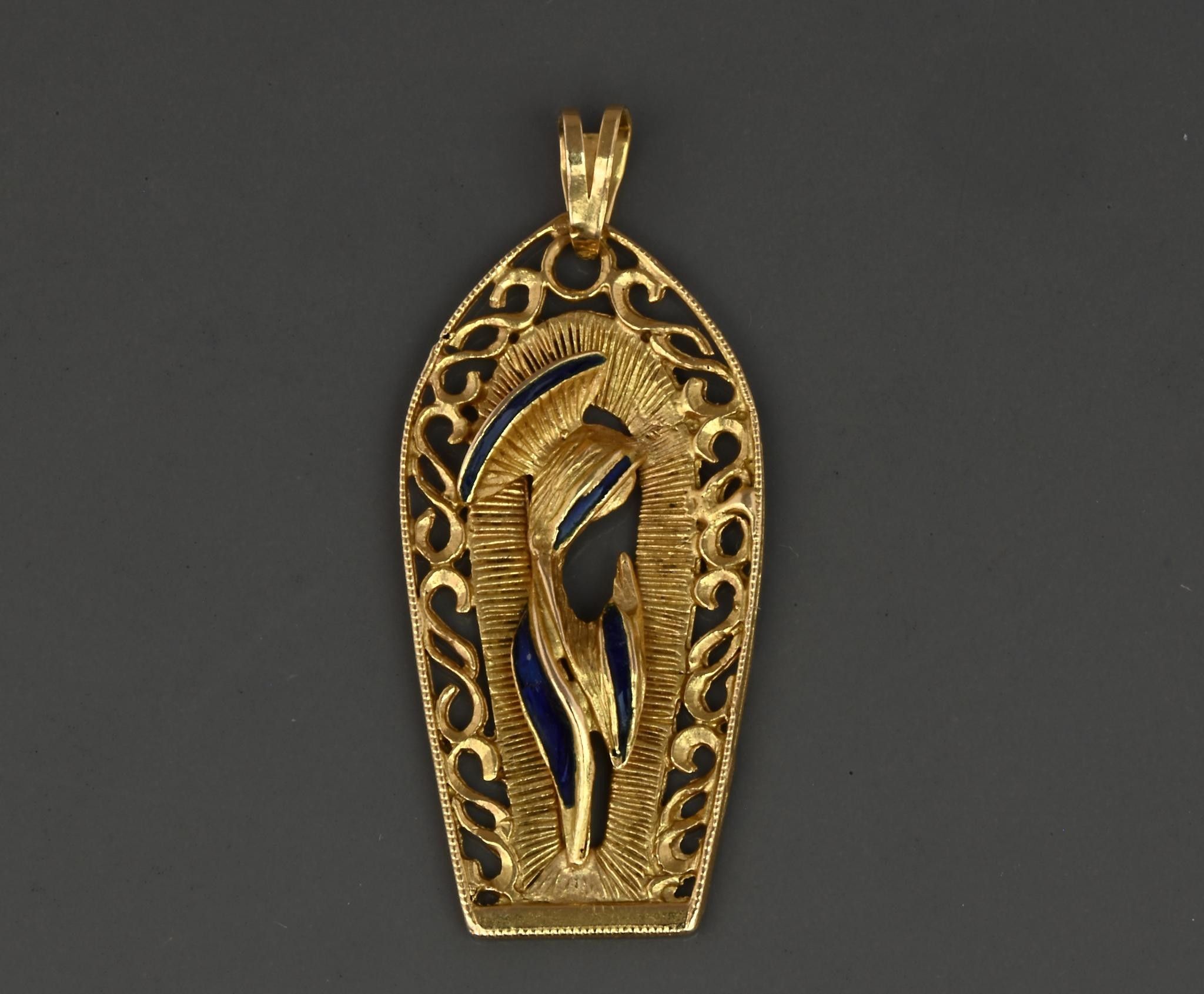 Medal of the Virgin Mary in openwork 18k yellow gold and blue enamel. Marked with an eagle's head. Length 3.6 cm. 3,52 g.