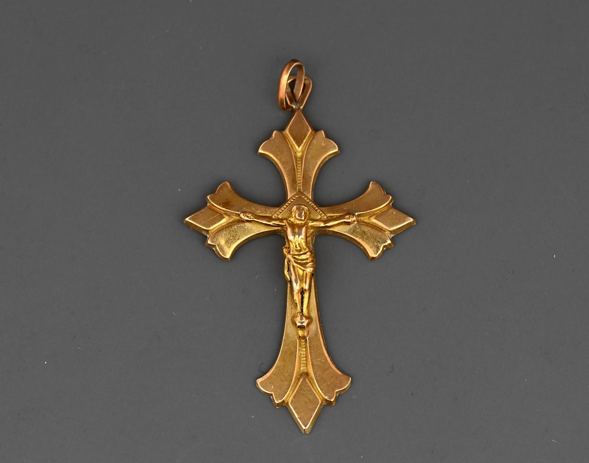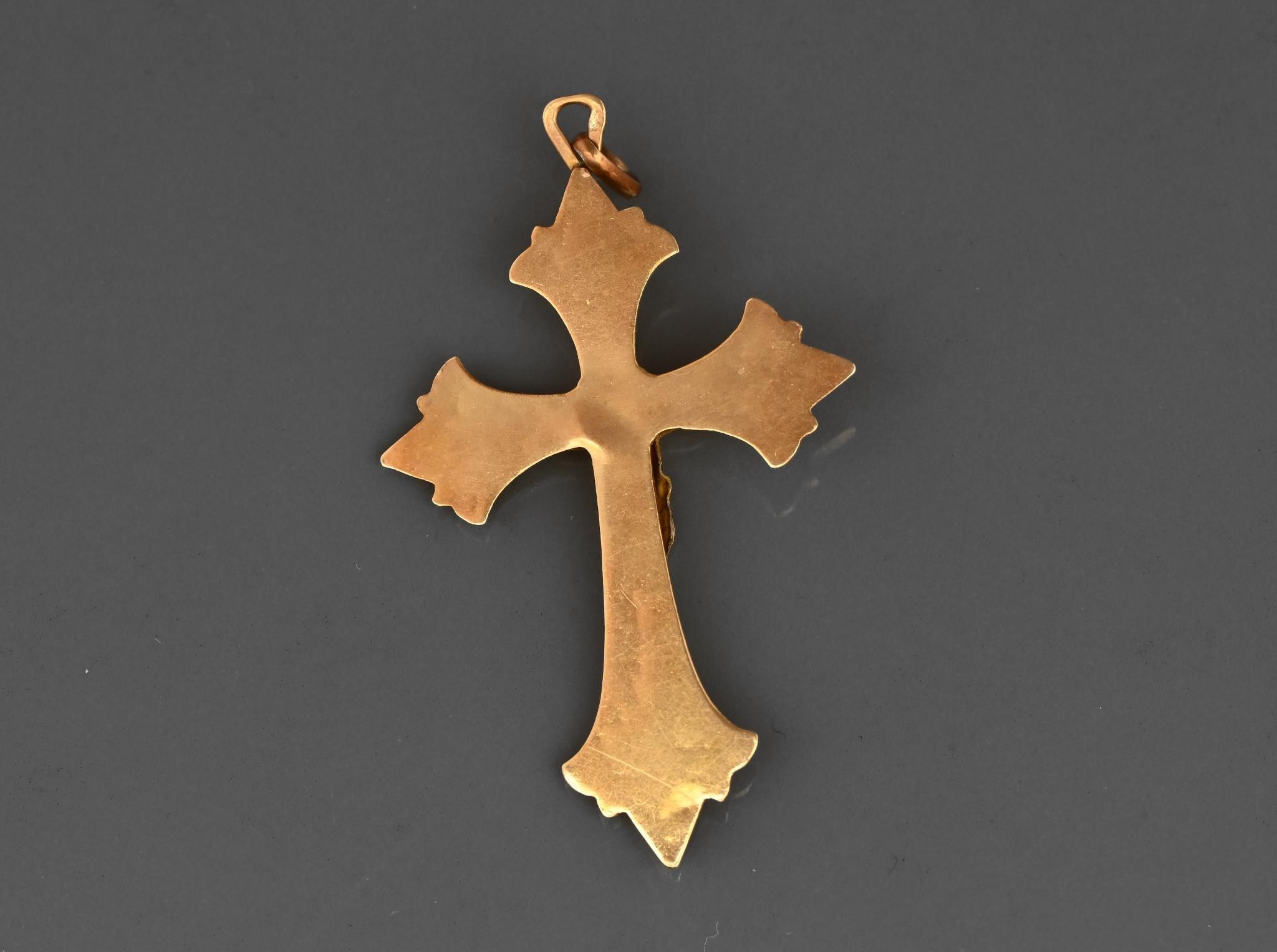 Openwork 18k yellow gold and blue enamel cross. Marked with an eagle's head. Total length 4.3 cm. 1,41 g.