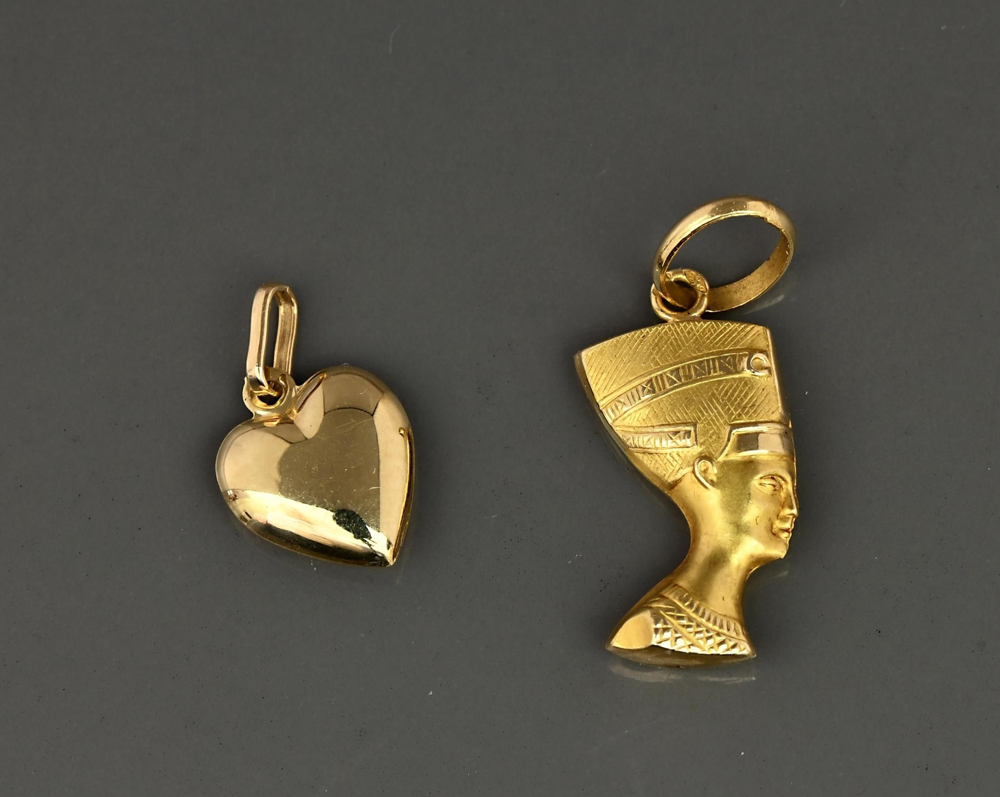 Heart pendant and Nefertiti pendant in 18k yellow gold. Eagle head hallmark on the bust pendant. Total heights 15 and 23 mm. 1,16g.