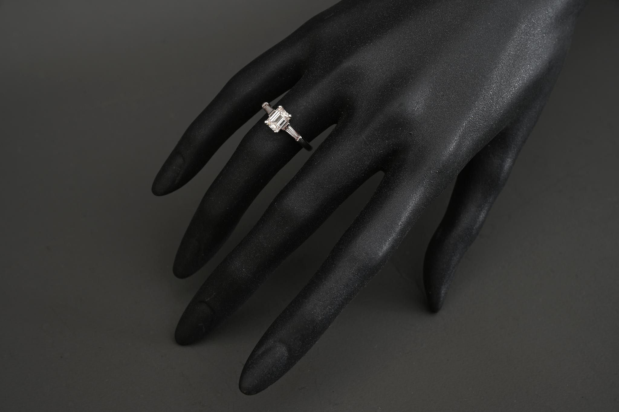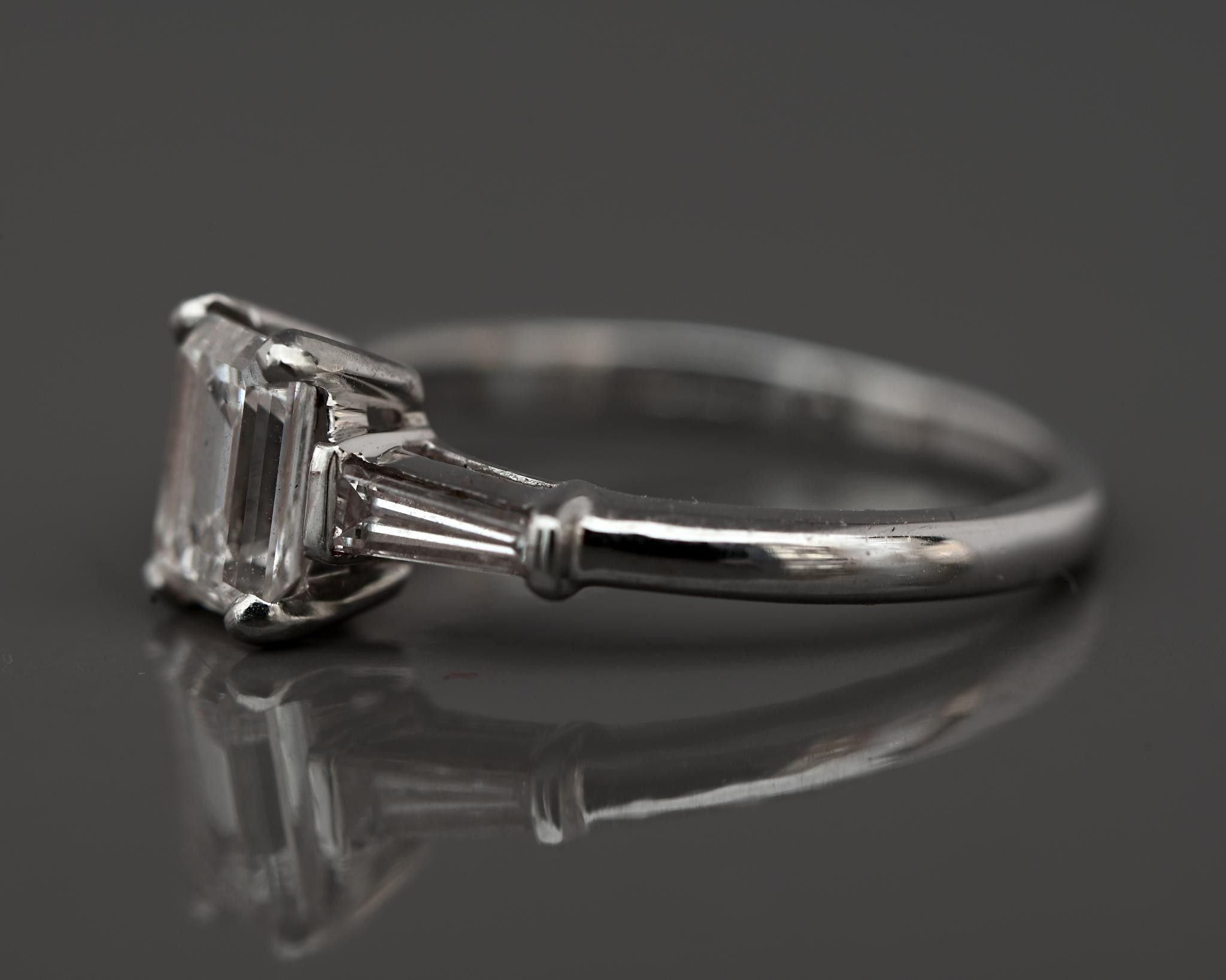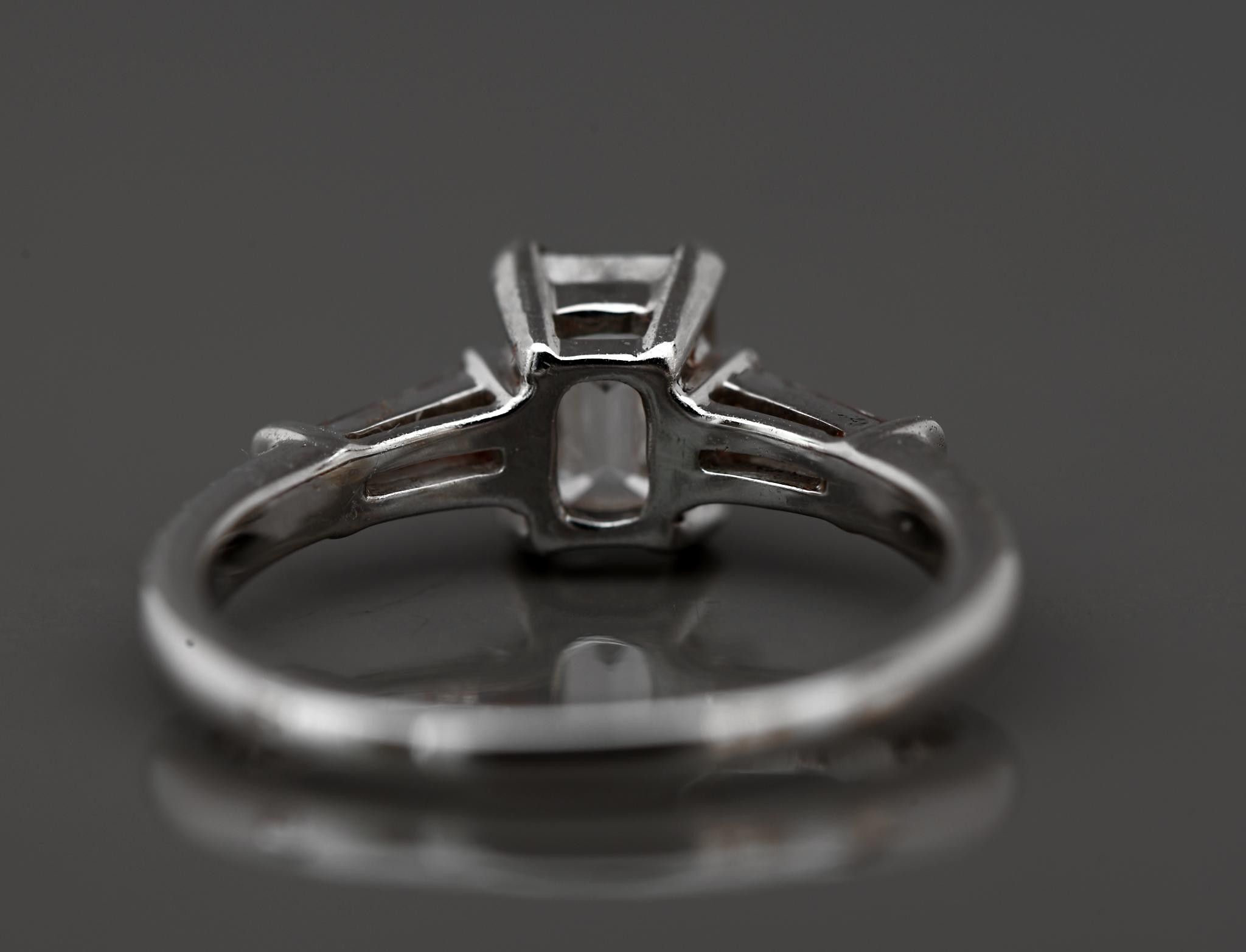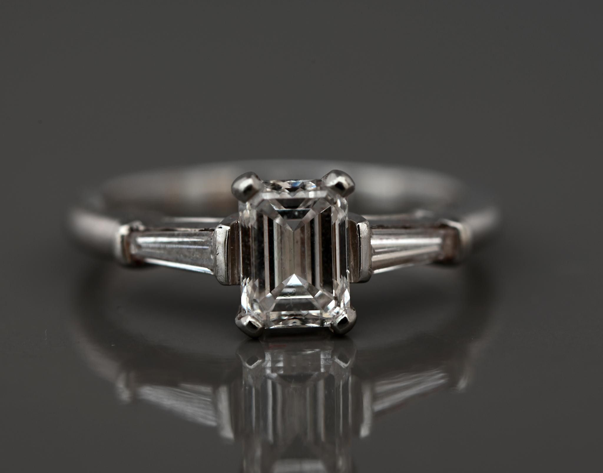 1ct emerald cut diamond, GIA certified (H/SI1) mounted on platinum and shouldered with 2 tapers. T51 . Weight 3.95 g.