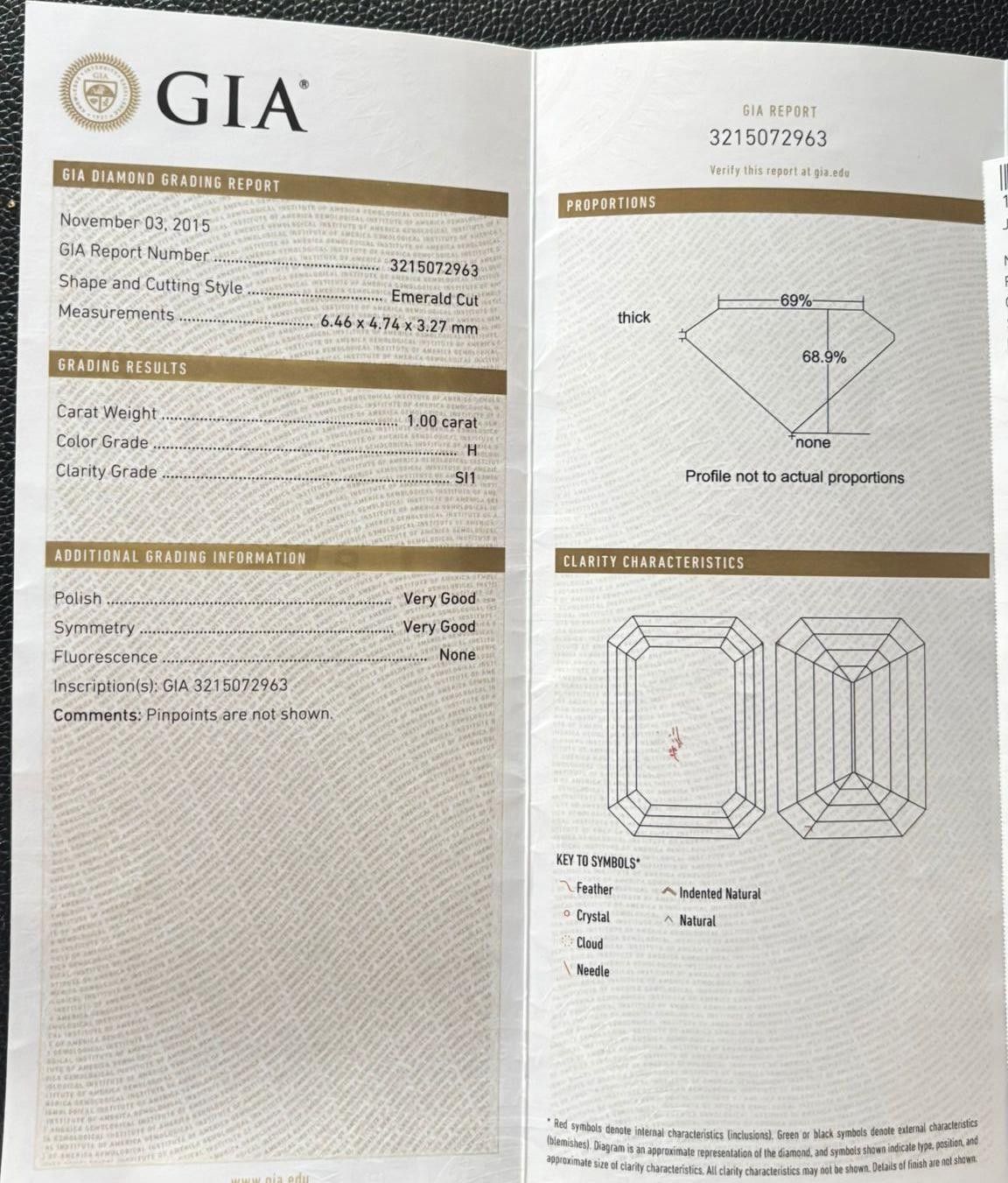 1ct emerald cut diamond, GIA certified (H/SI1) mounted on pl…