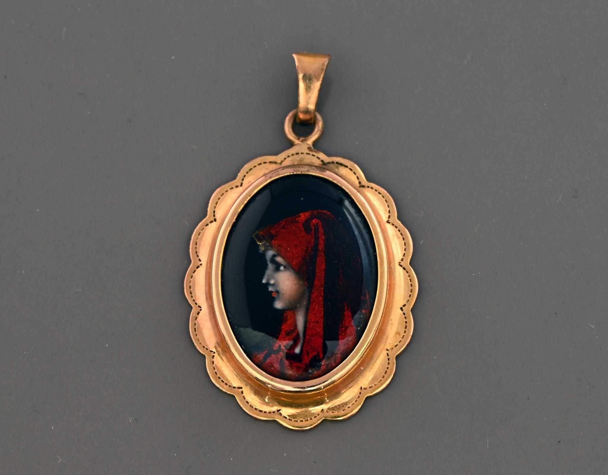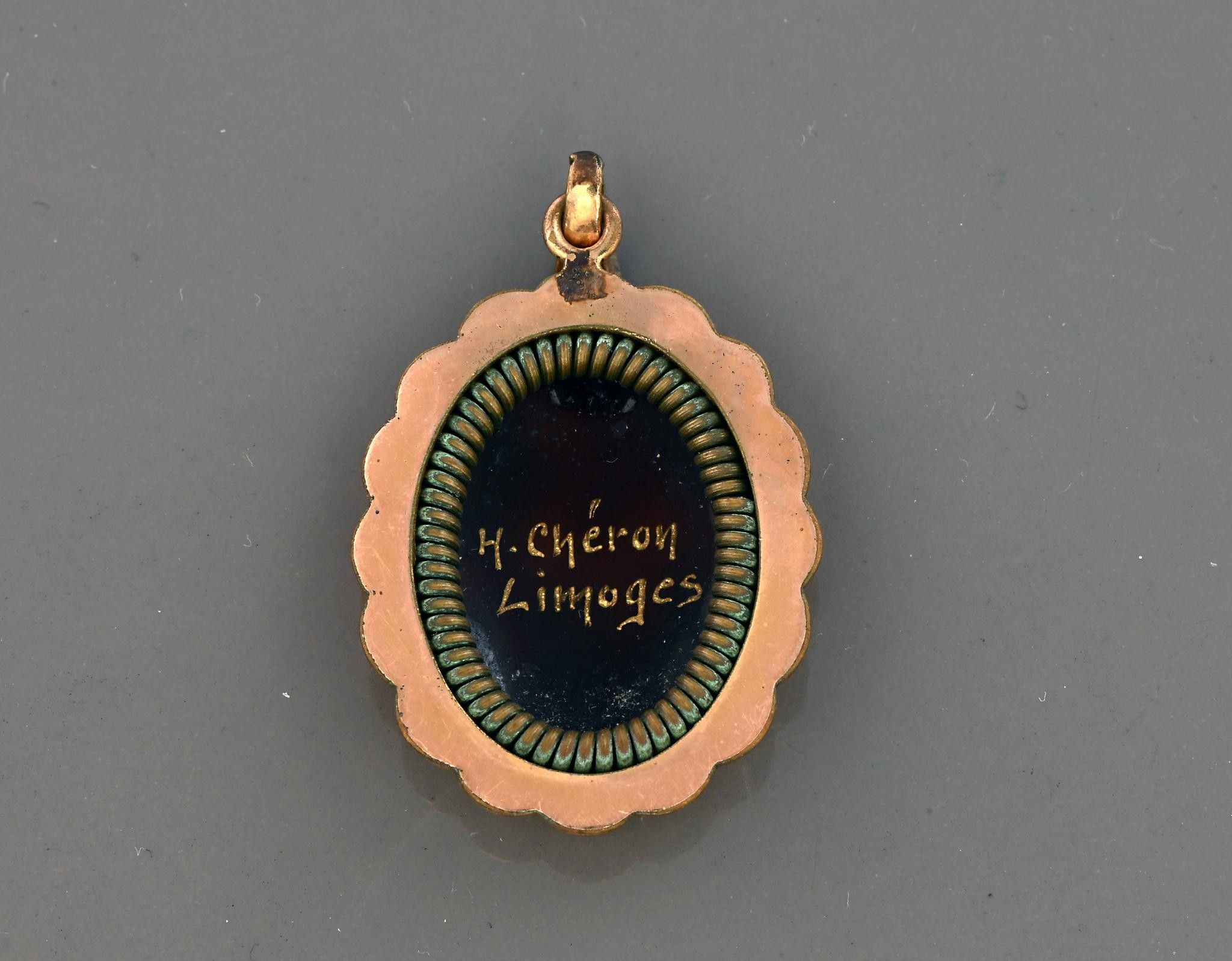 Gilt metal pendant with Limoges enamel depicting Fiona the Roman. Signed H. Chéron. Total height 35 mm.