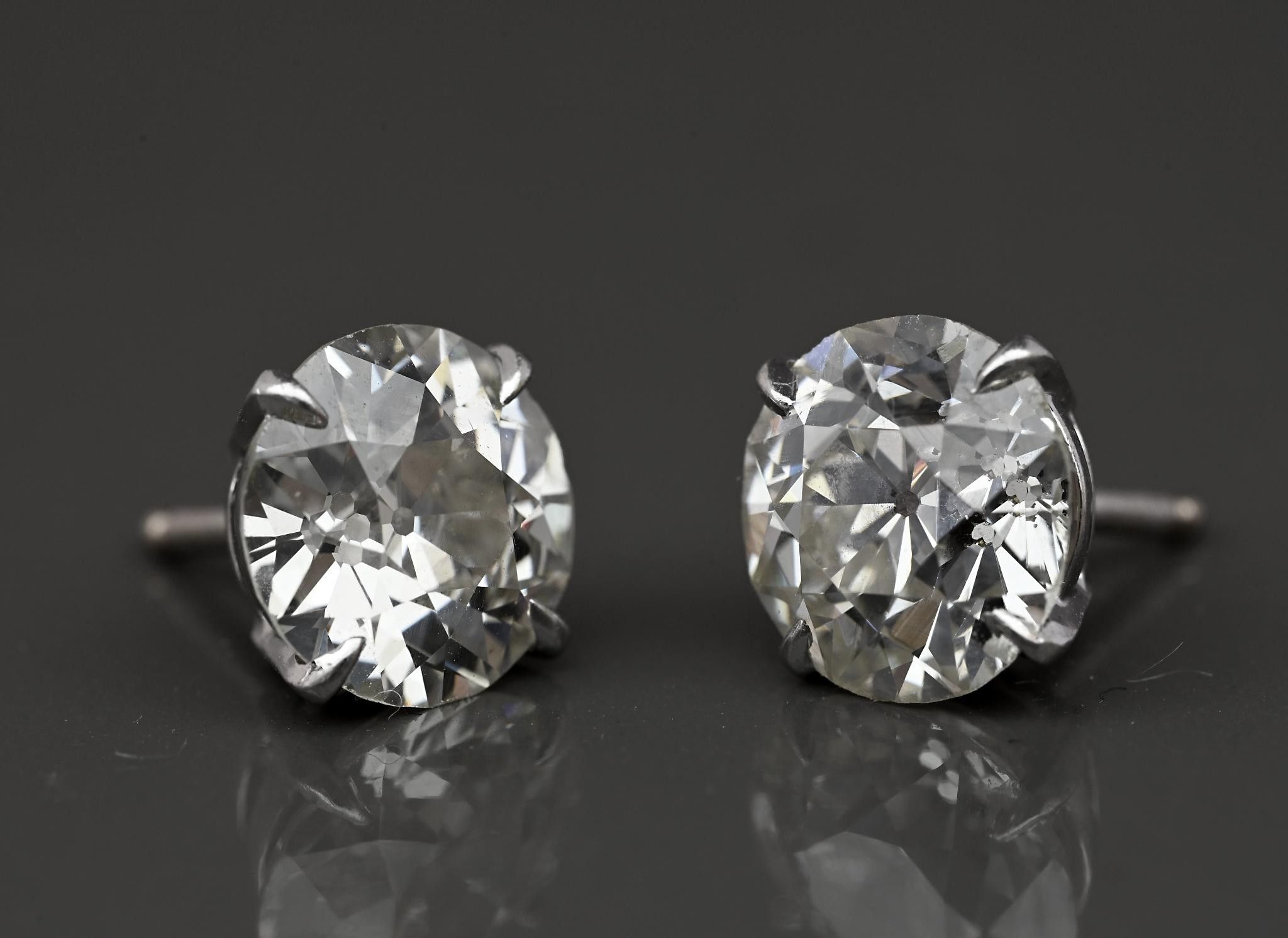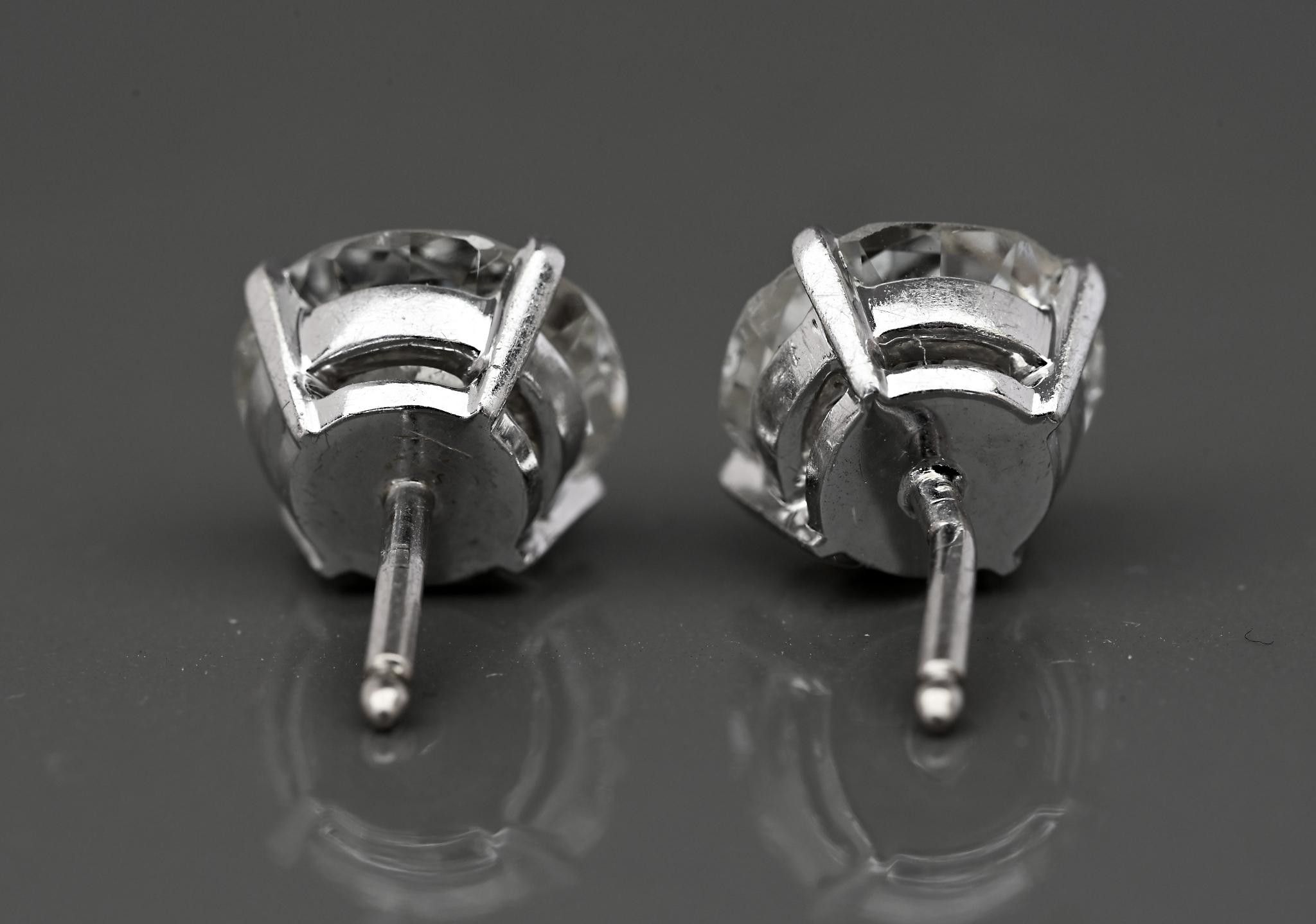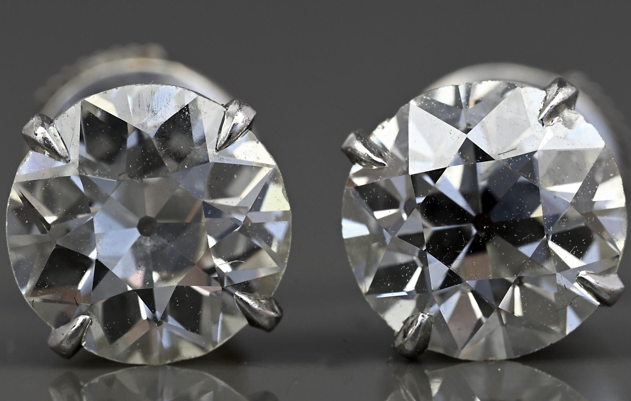 Pair of earrings in white gold set with old-cut diamonds of approximately 2.1cts each, Alpa fastening system. Colour estimated IJ, clarity estimated SI. Diameter approx. 8.1 mm. Weight 3.2g. Small chip near a claw.