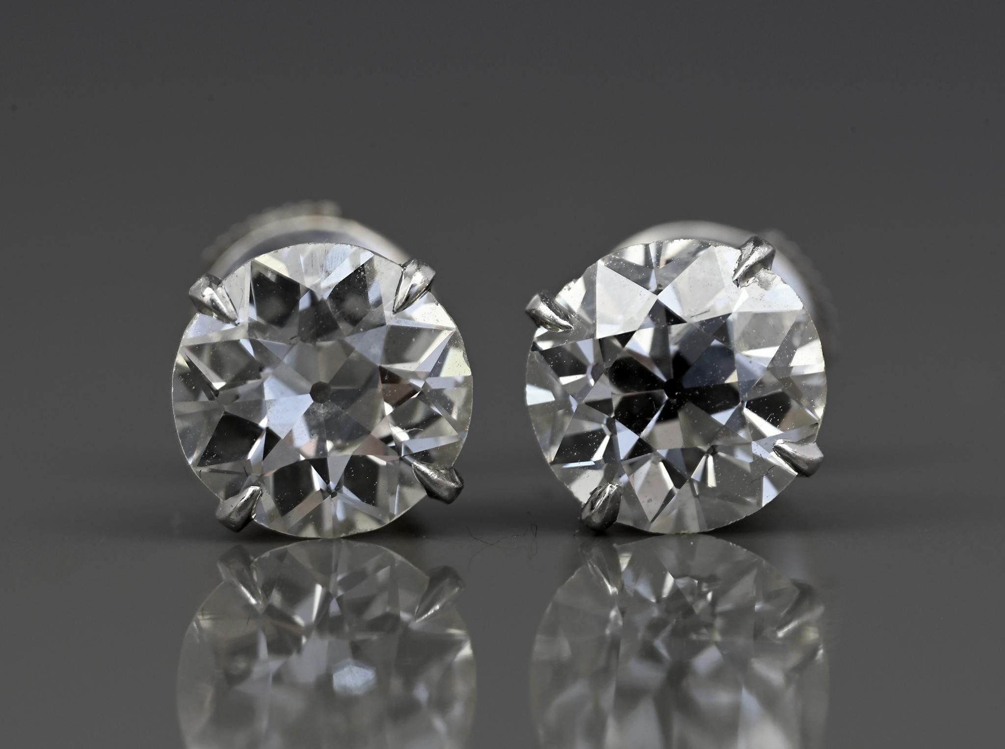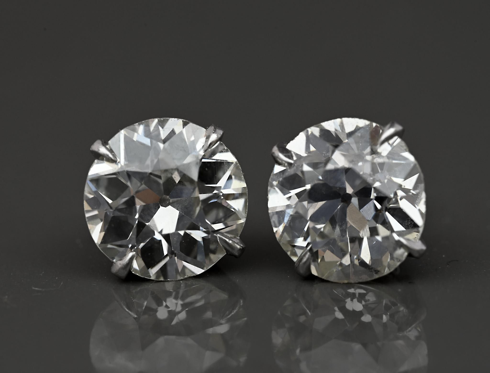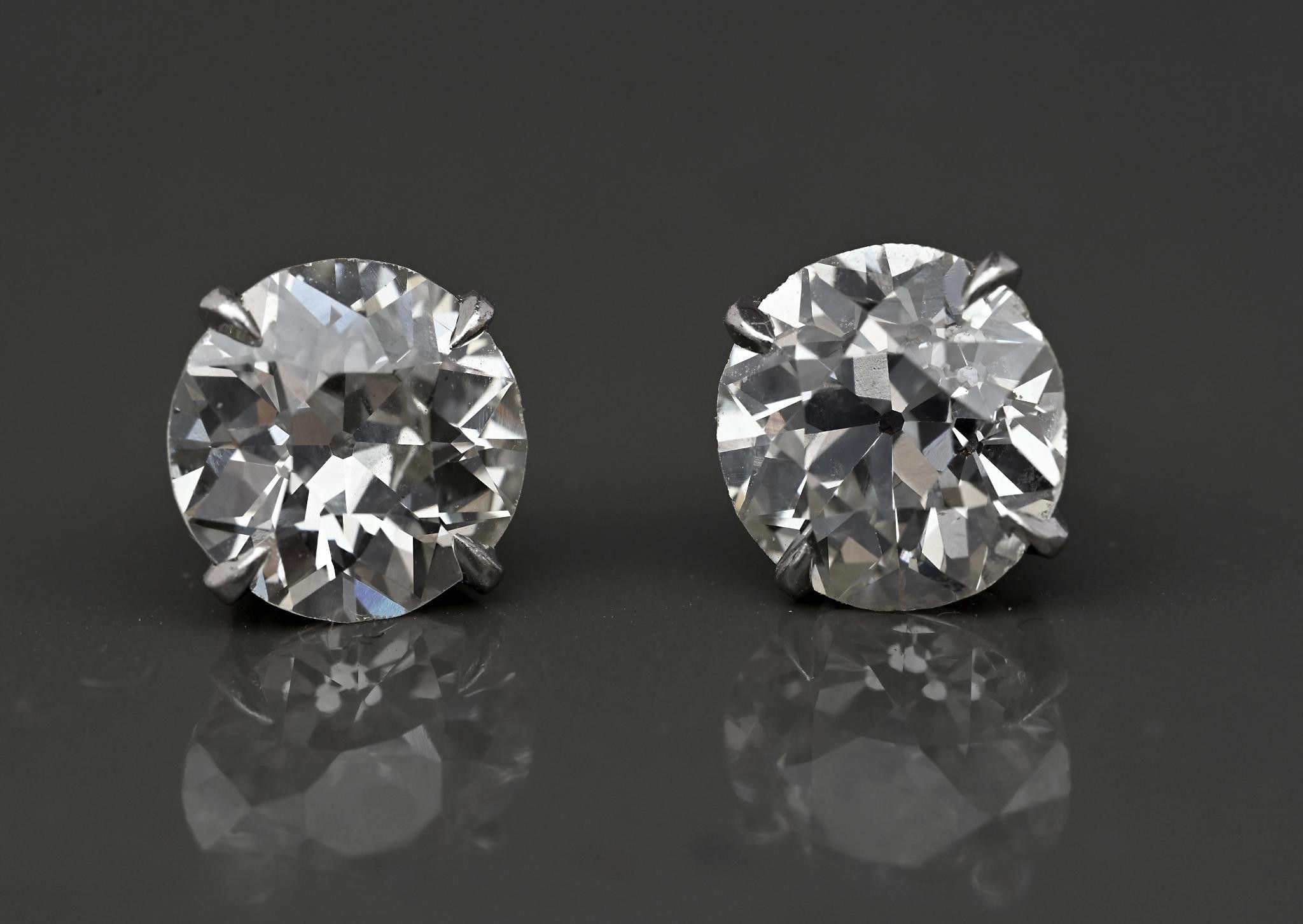 Pair of earrings in white gold set with old-cut diamonds of approximately 2.1cts each, Alpa fastening system. Colour estimated IJ, clarity estimated SI. Diameter approx. 8.1 mm. Weight 3.2g. Small chip near a claw.