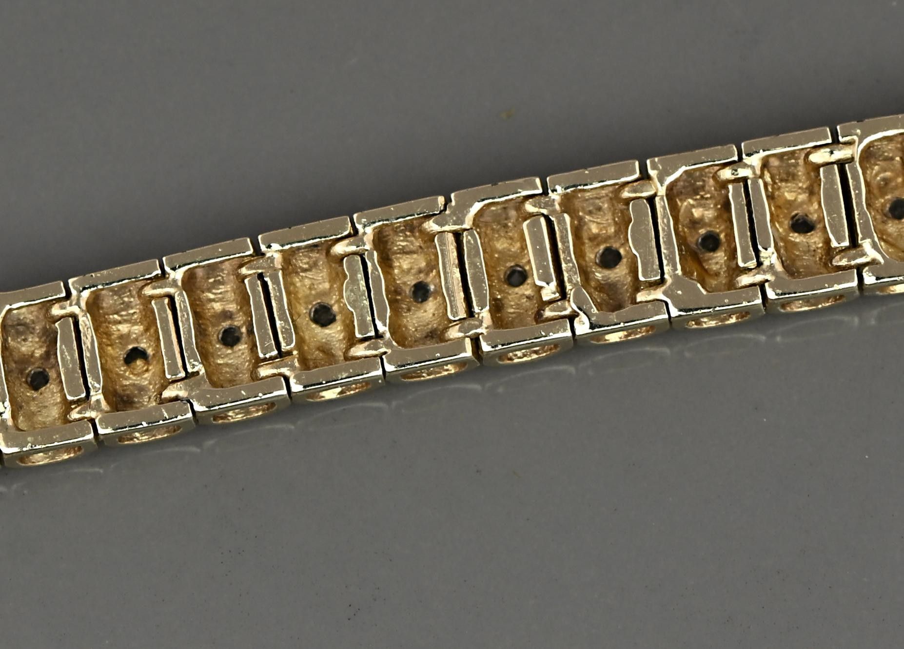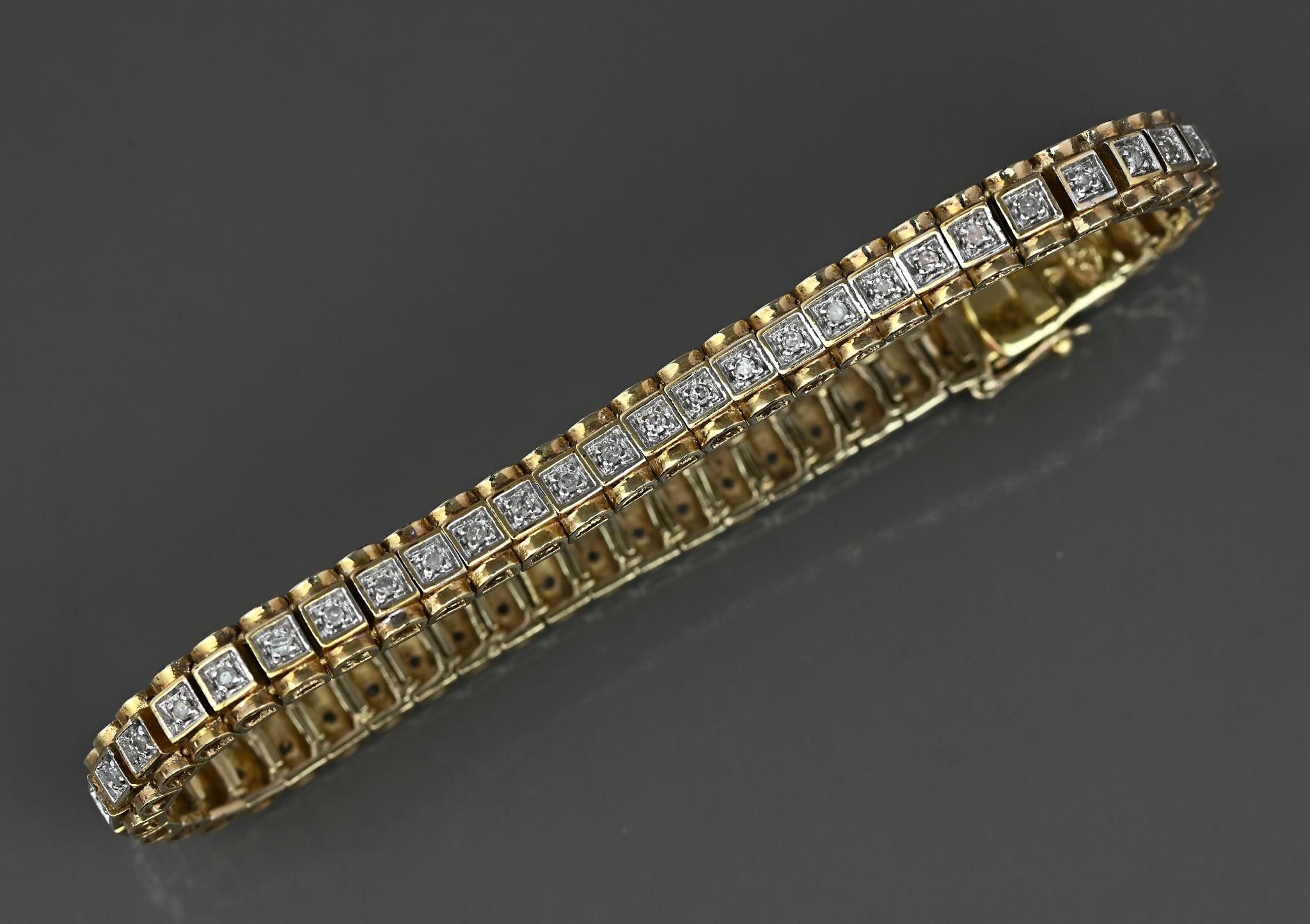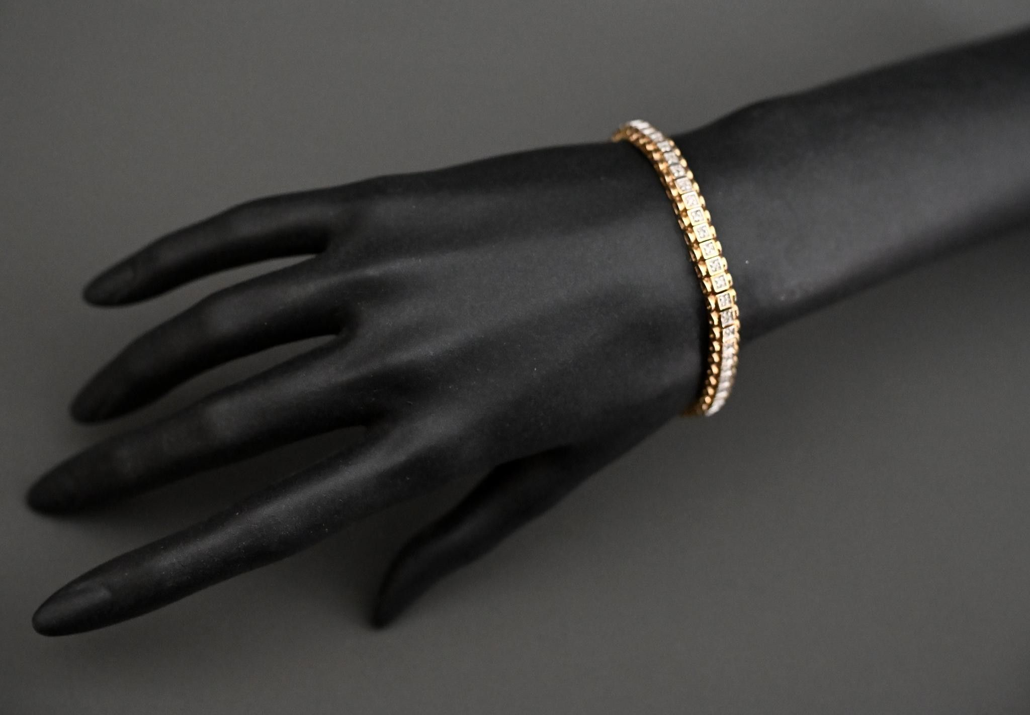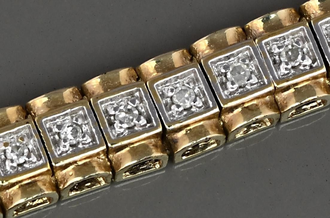 Articulated line bracelet in two-tone 9K gold set with small 8/8 diamonds. Length: 18.2 cm. Double 8 safety. 17,25 g.