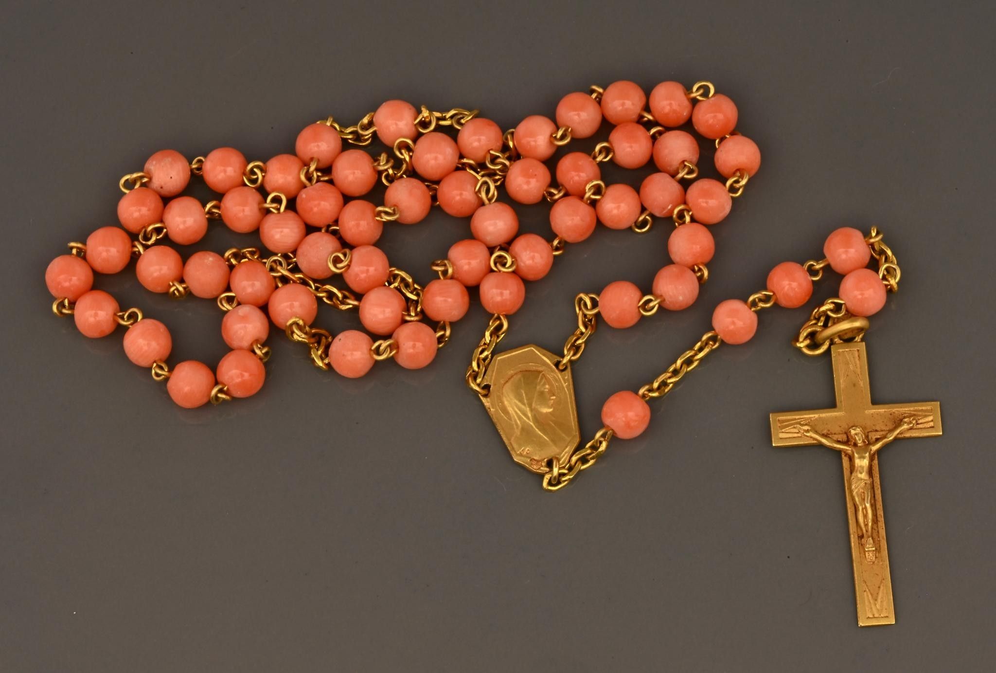Rosary in yellow gold and coral pearls. 12.19g gross.