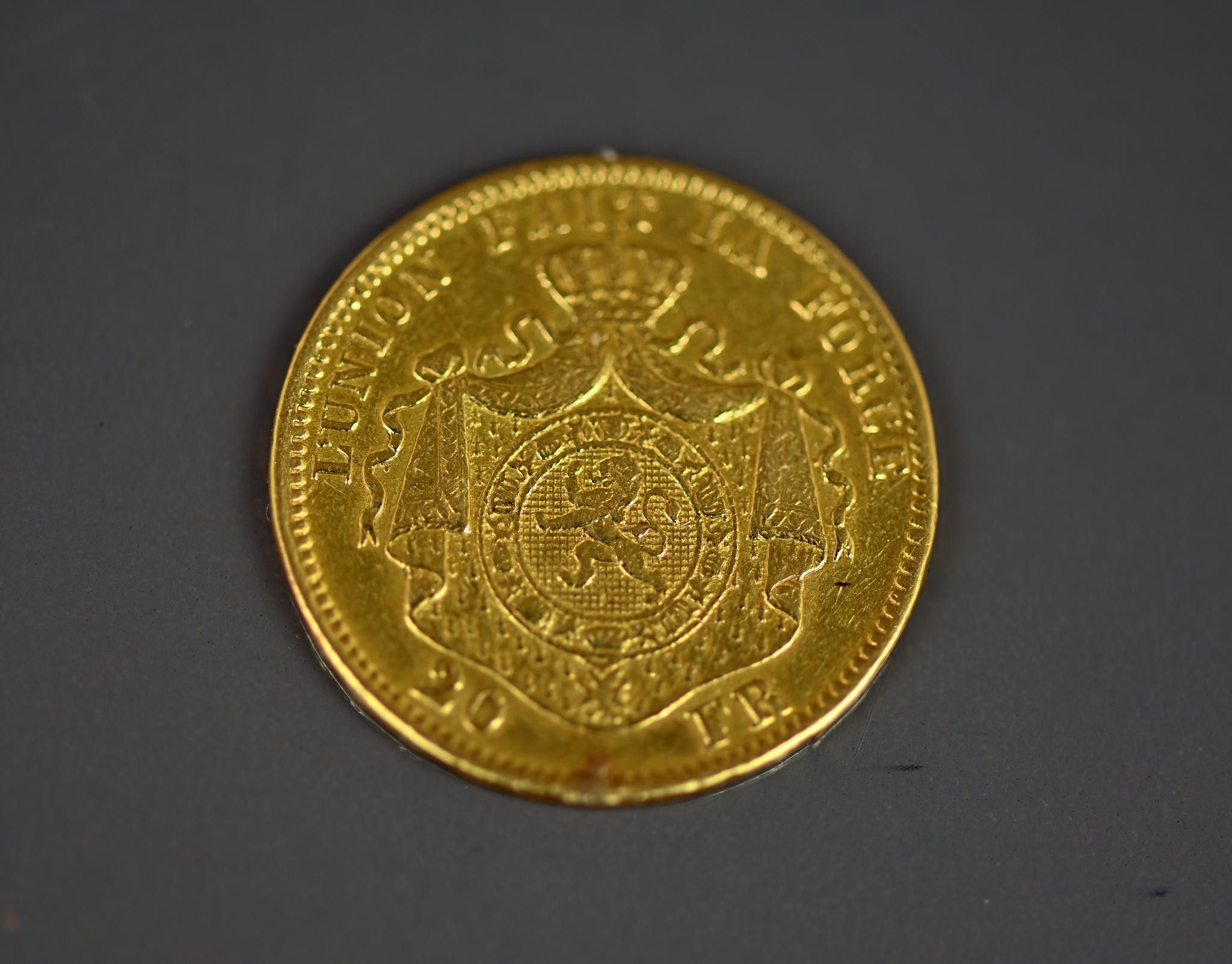 Leopold II 20F gold coin, 1871. Engraver: LW. 6,39g.