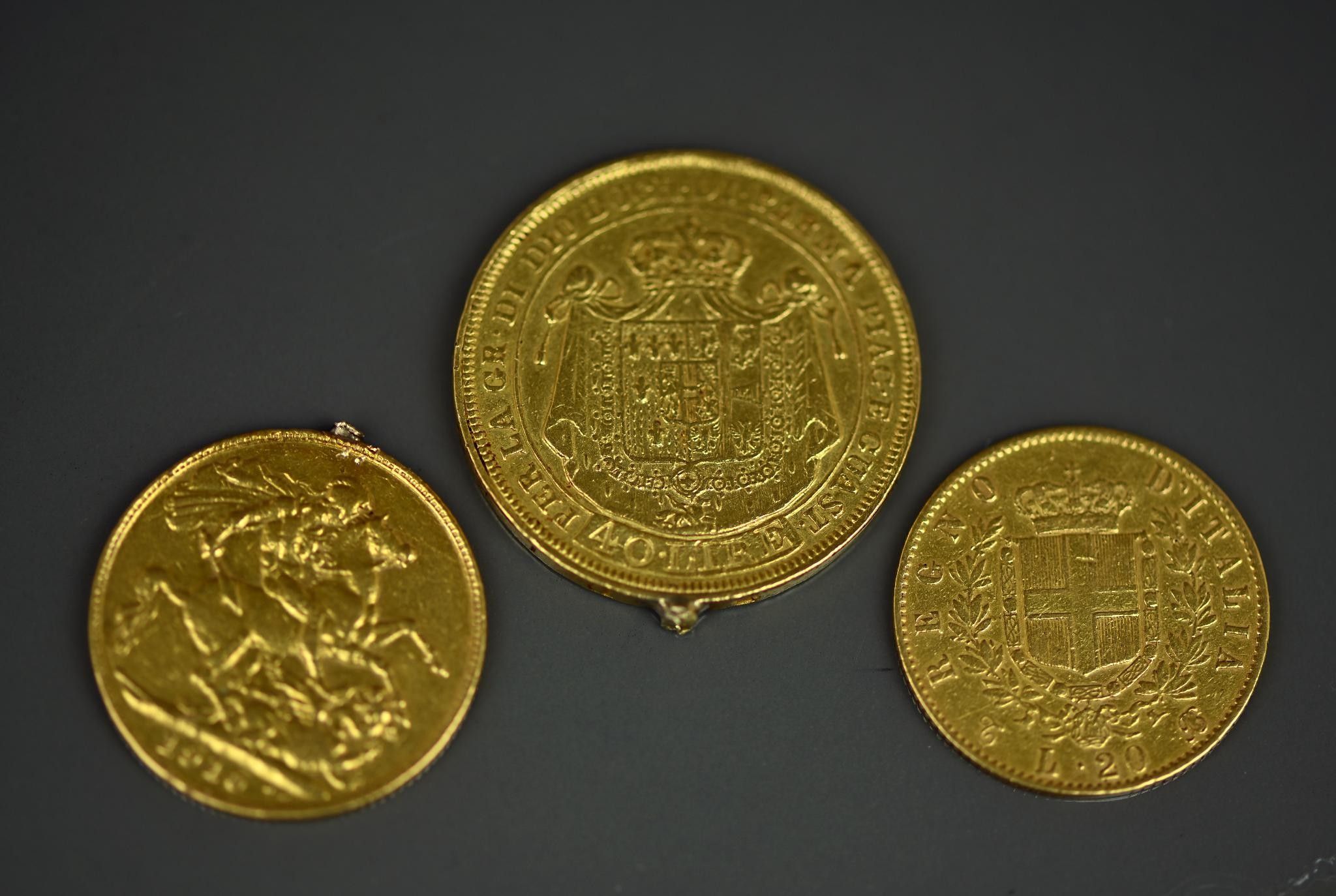 Lot of 3 gold coins: 20 Lira (1865 filed), 40 Lira (1815) and Sovereign (1910). Formerly mounted. 27,23g.