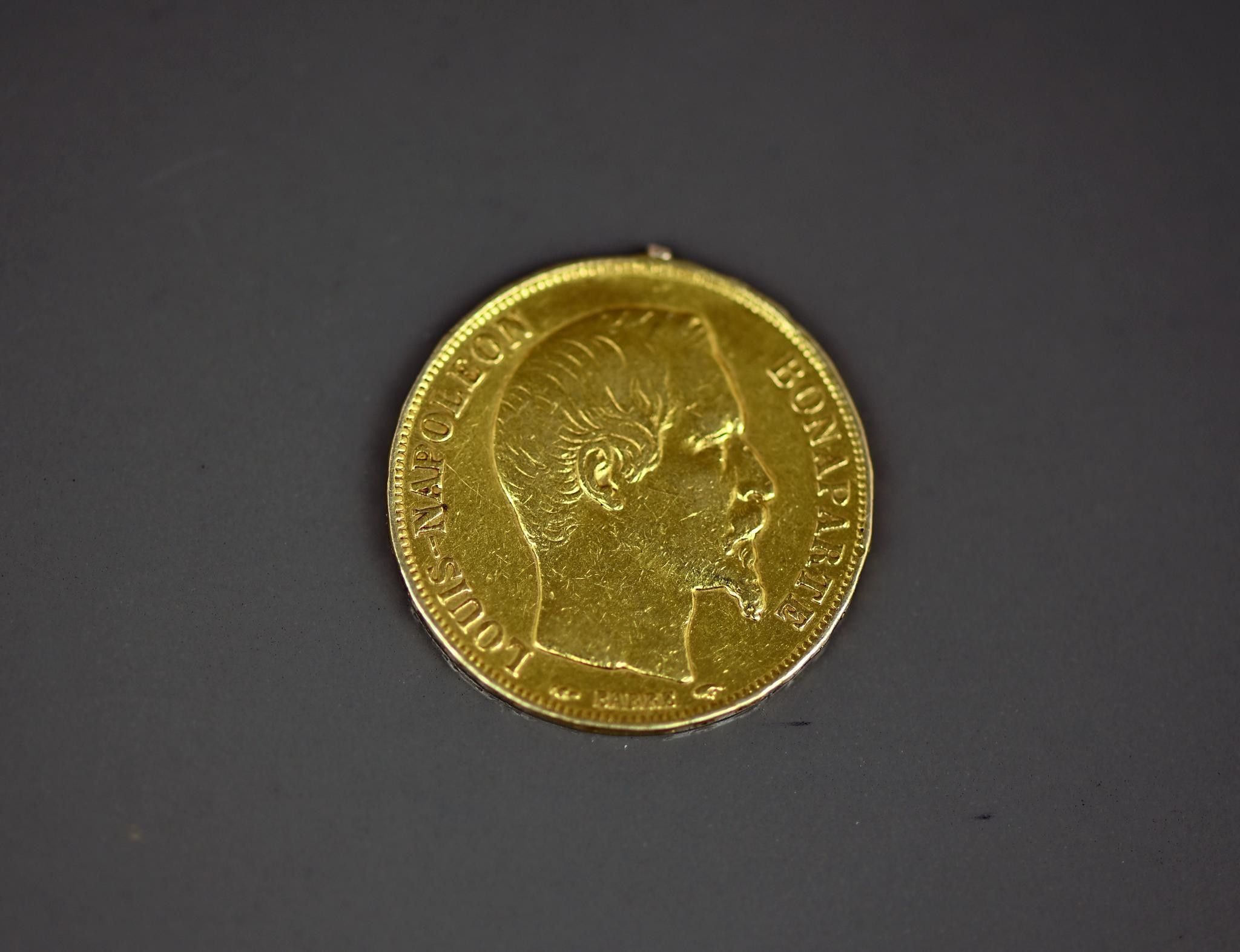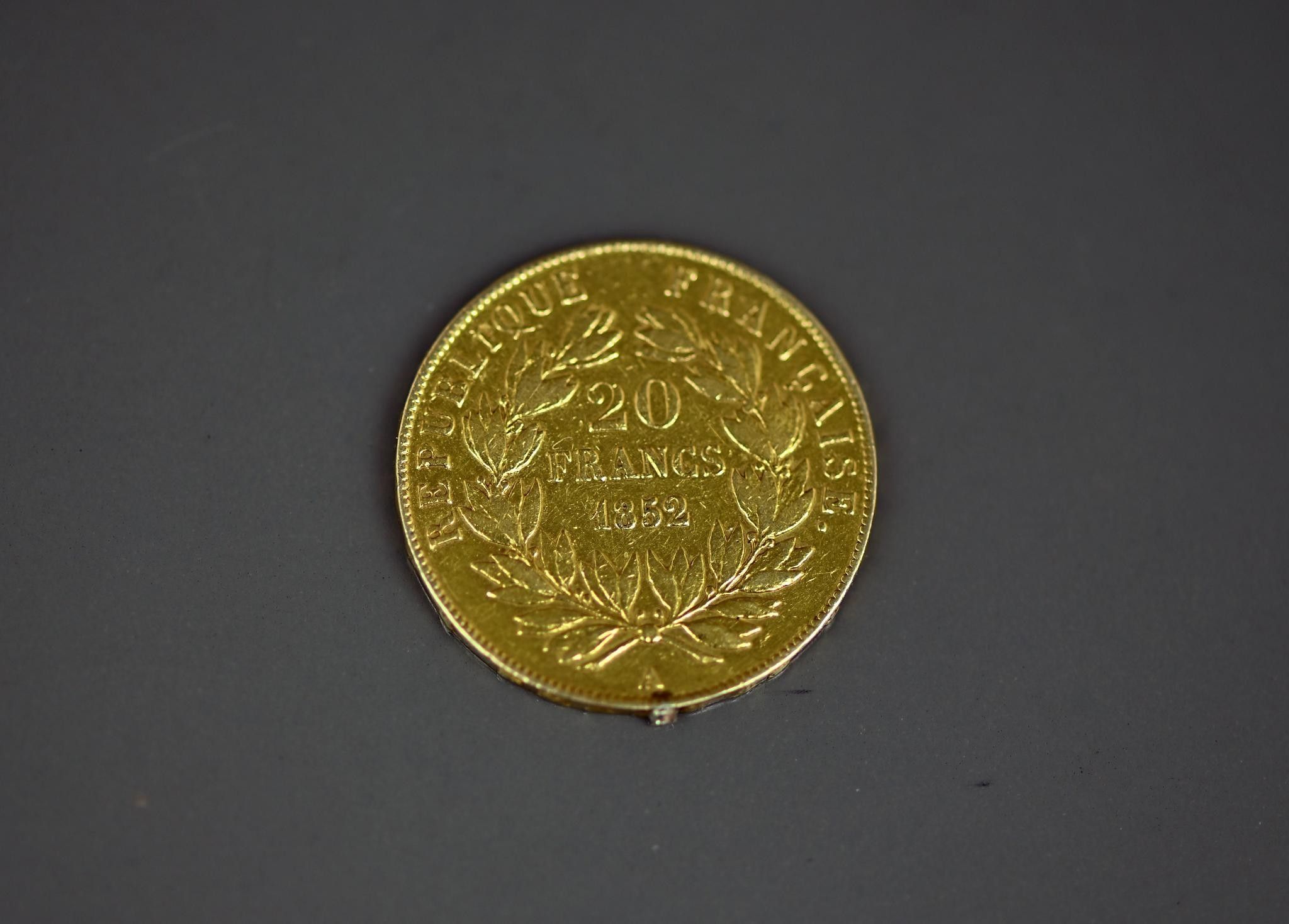 20F gold coin Napoléon III bare head, 1852 A. Engraver: BARRE. Formerly mounted (trace of soldering), weight 6.34g.