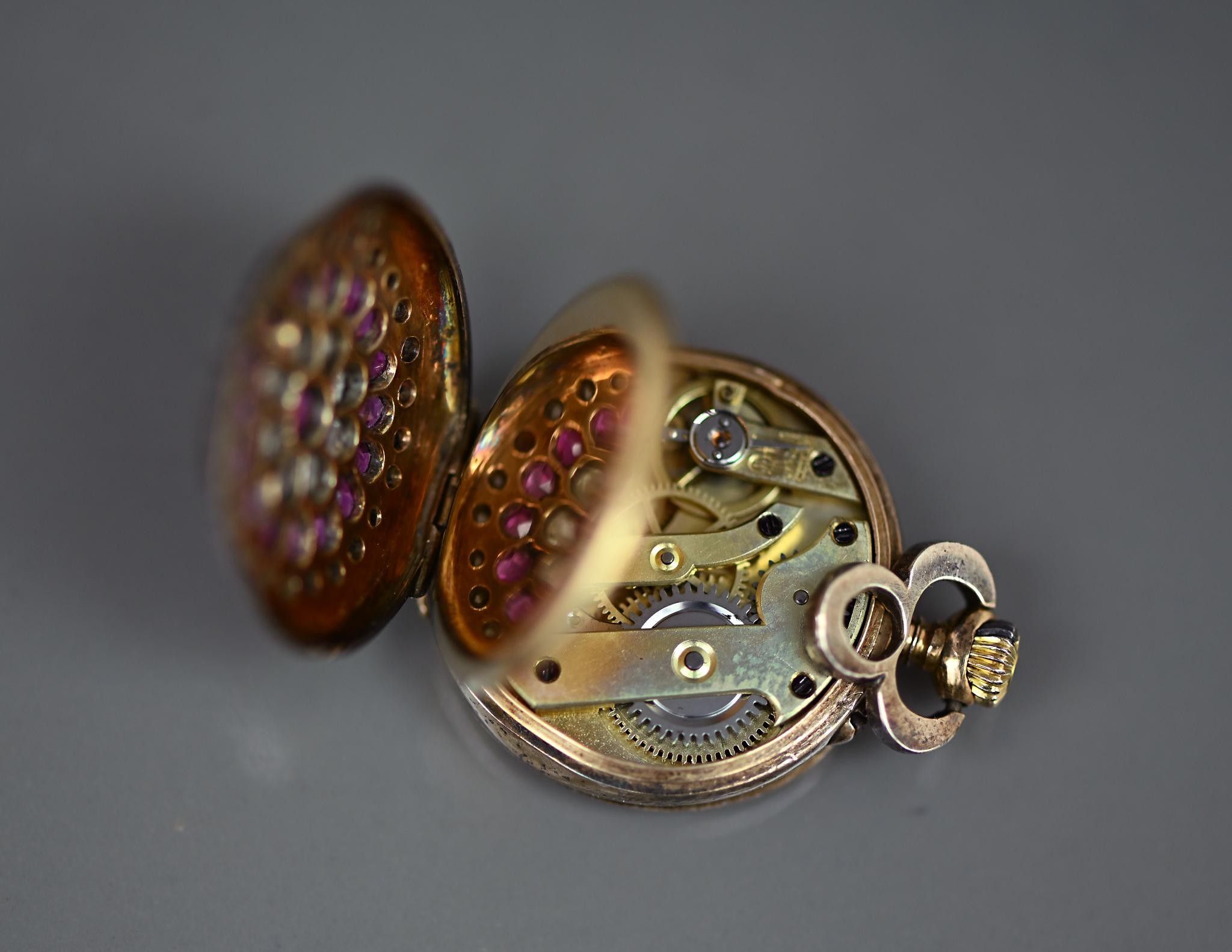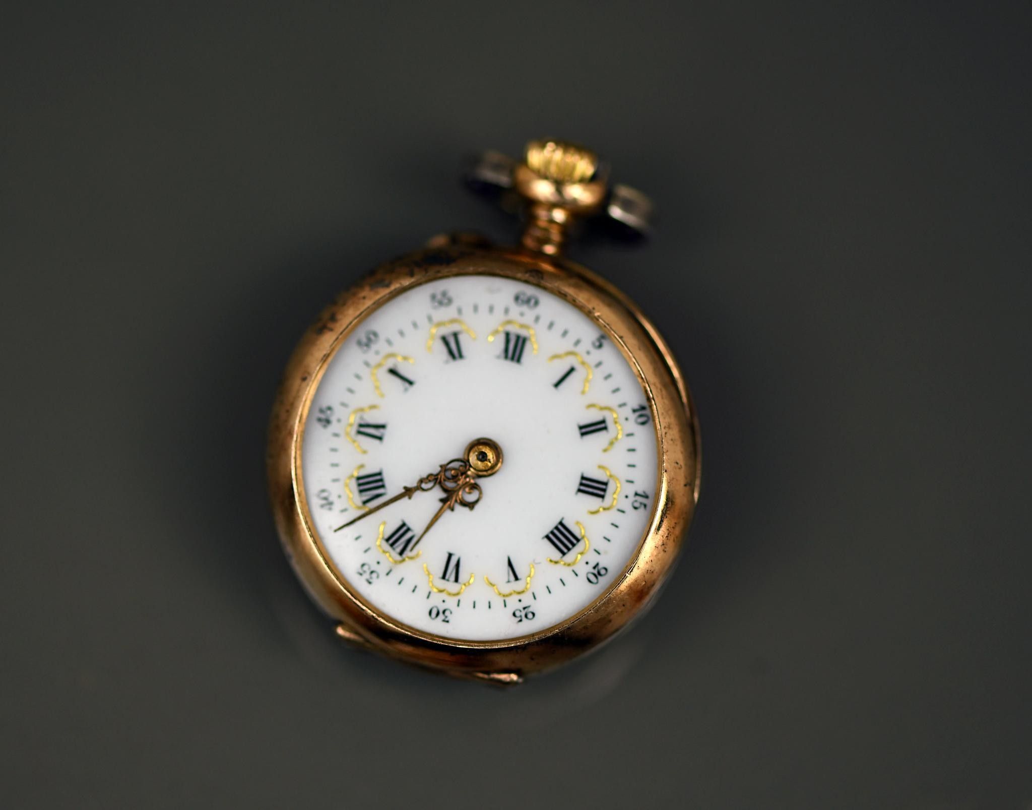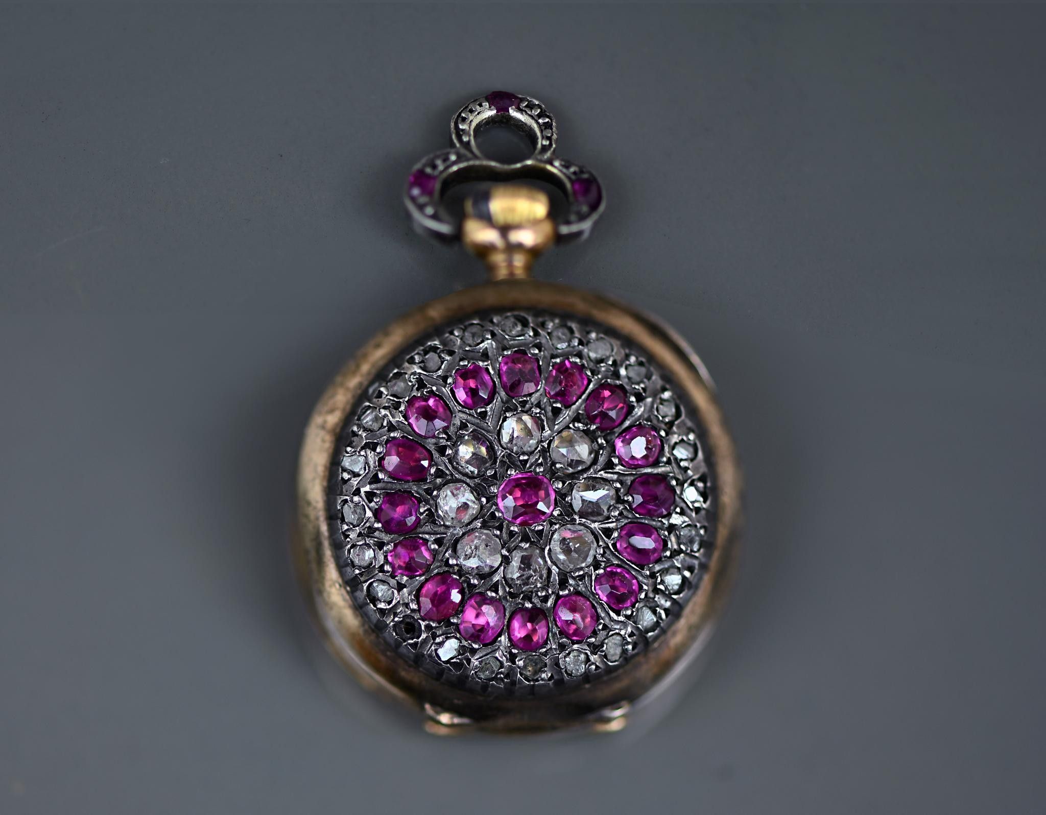 Small collar watch in 18k yellow gold and silver, set with rose-cut diamonds (missing 1) and rubies, including on the three-lobed hoop. Diameter: 22 mm. No glass. Horsehead hallmark. 13.01g gross.