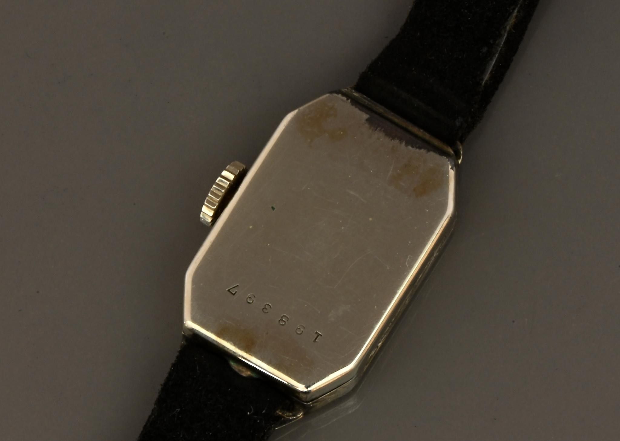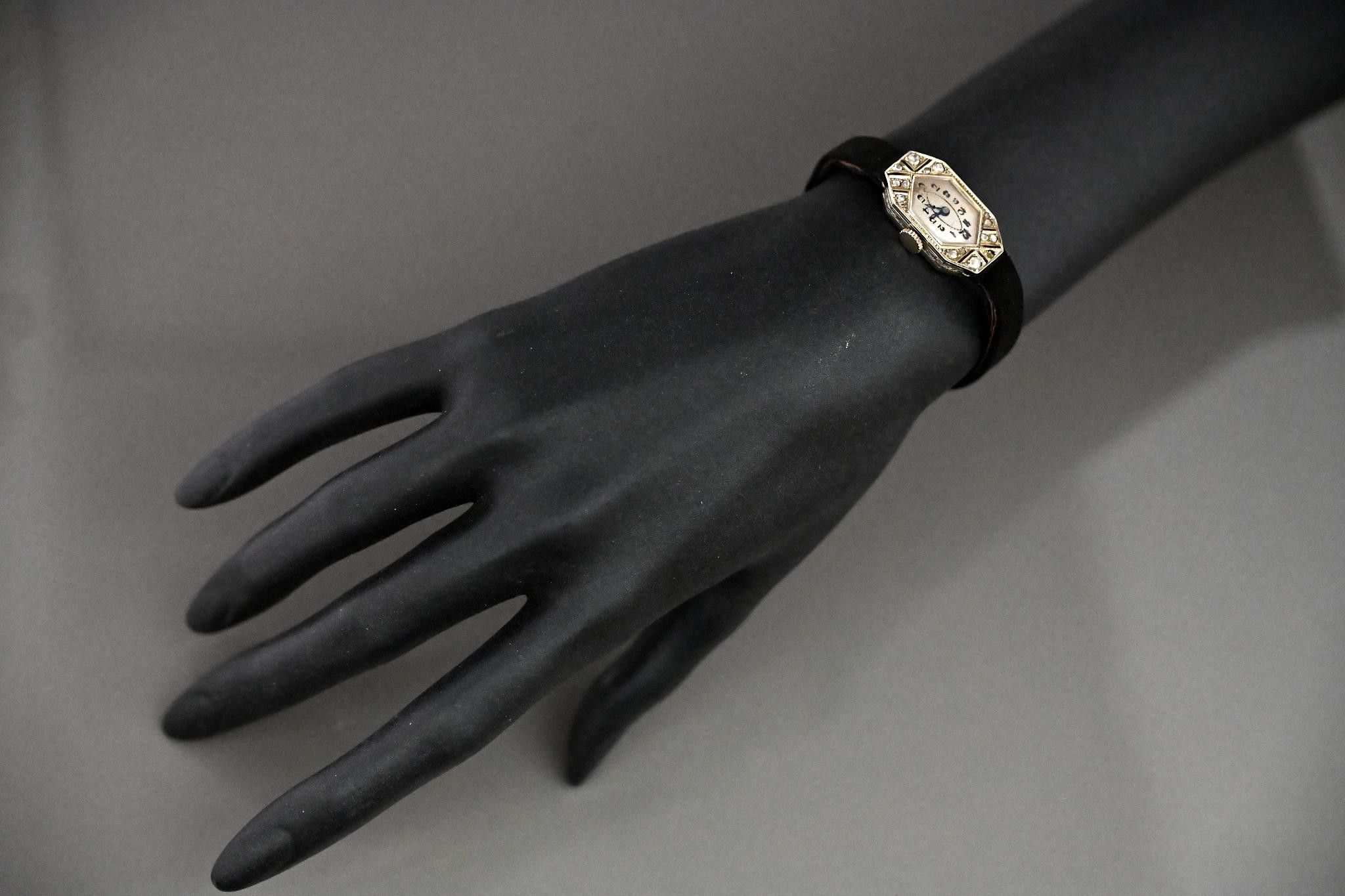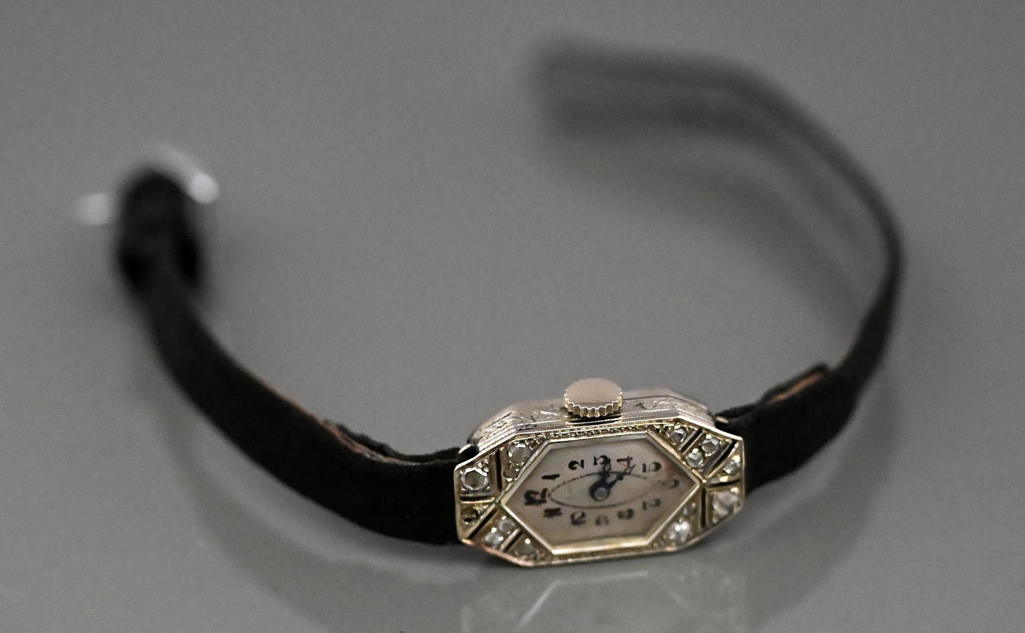 LIP Art-Deco ladies' watch in 18k white gold set with rose-cut diamonds. Marked with an eagle's head. Case: 25 x 14 mm. Works on start-up. 11.20g gross.