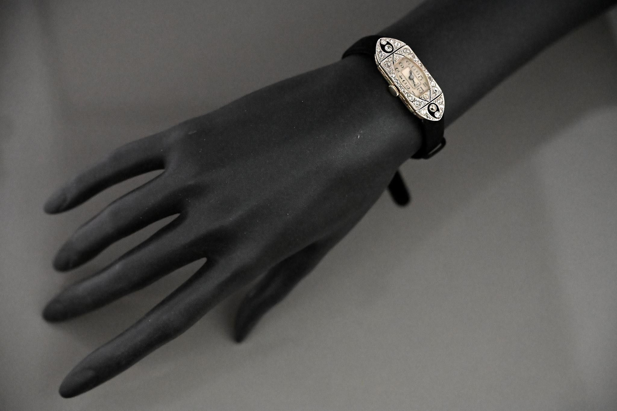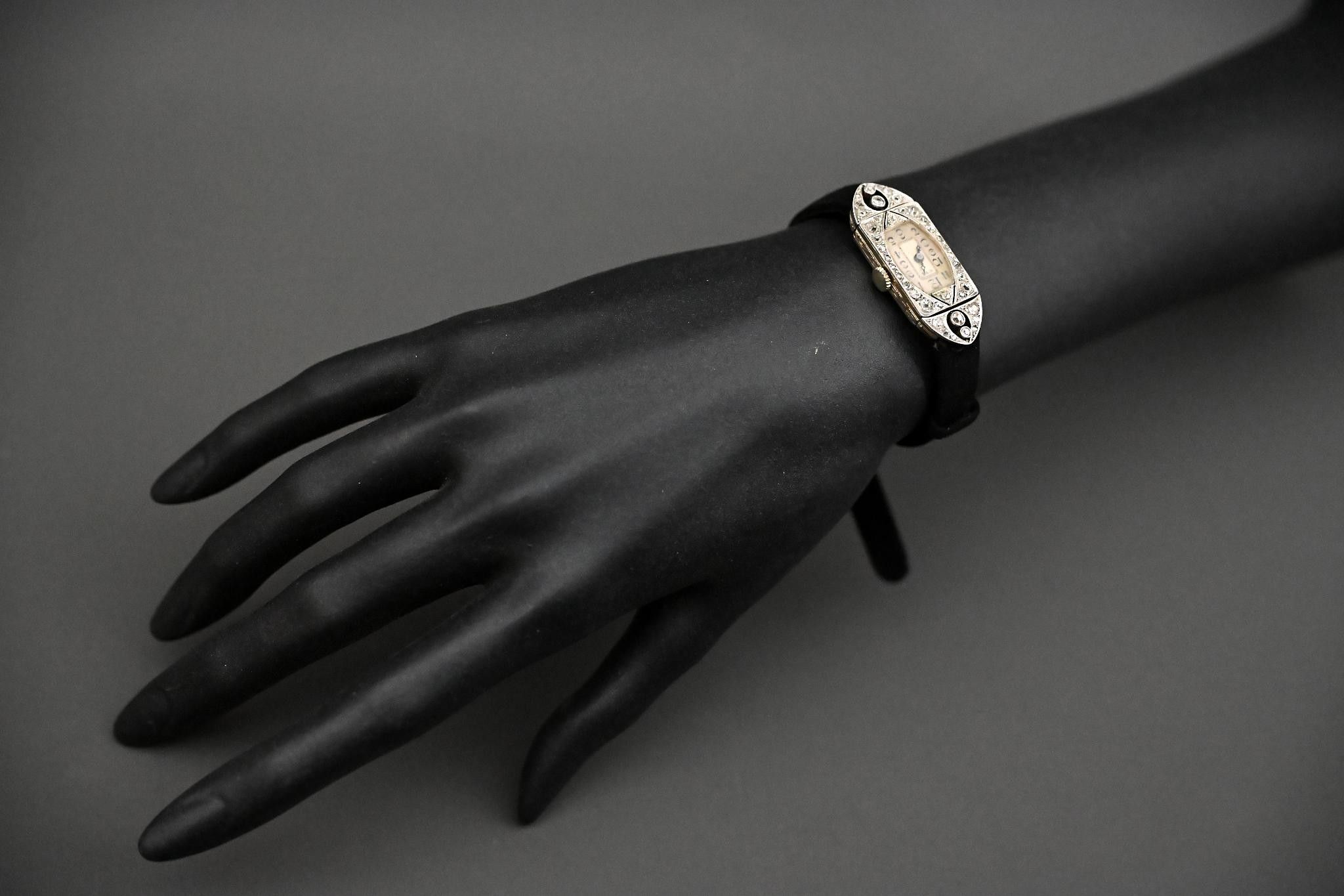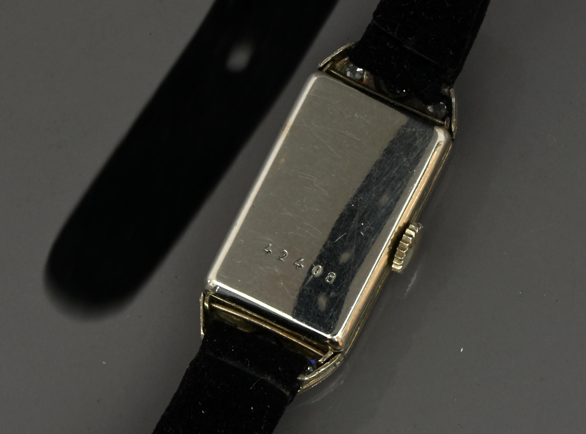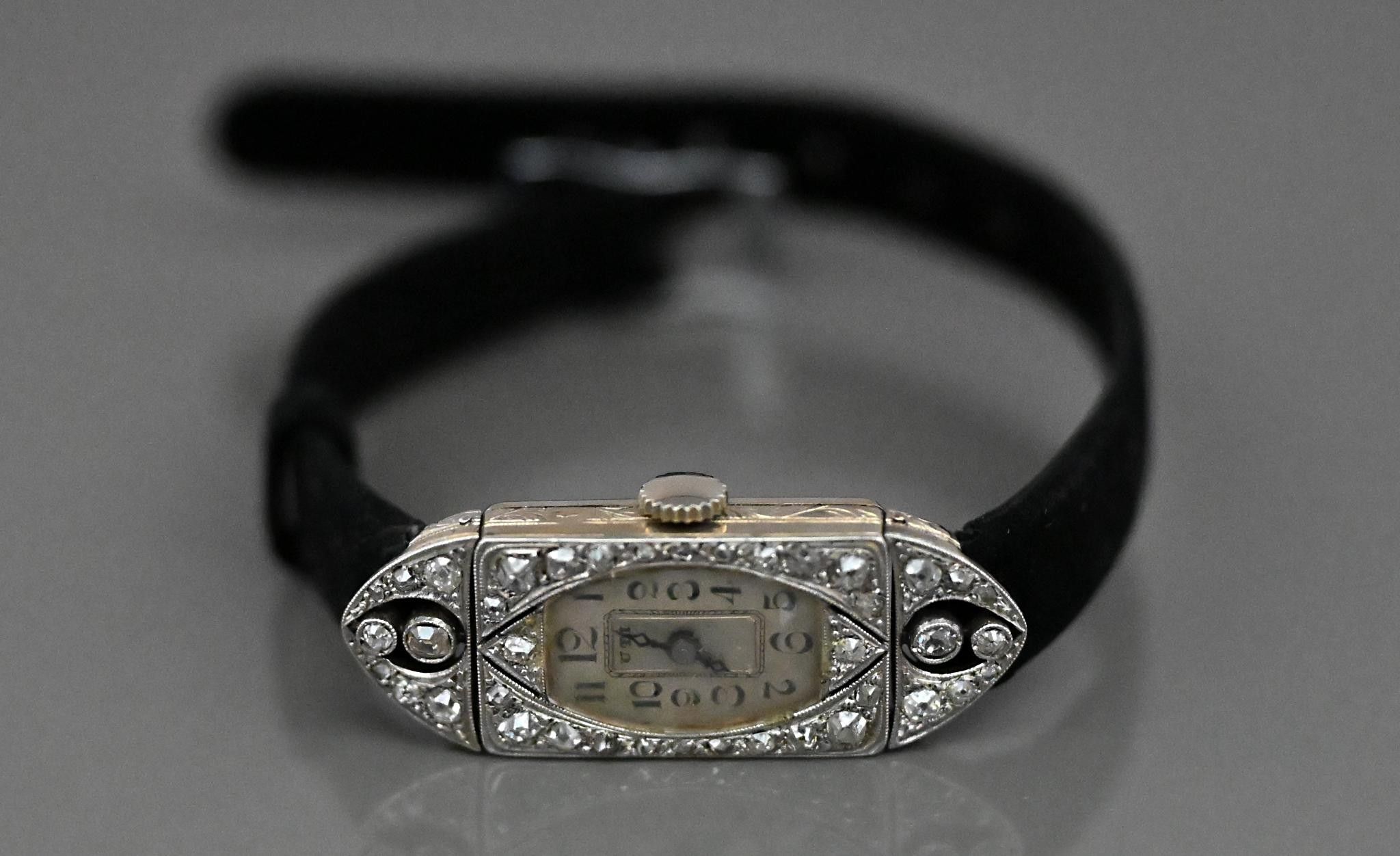 Uti Art-Deco ladies' watch in 18k white gold set with old-cut diamonds. Marked with an eagle's head. Case: 38 x 14 mm. Works on start-up. 13.56g gross.