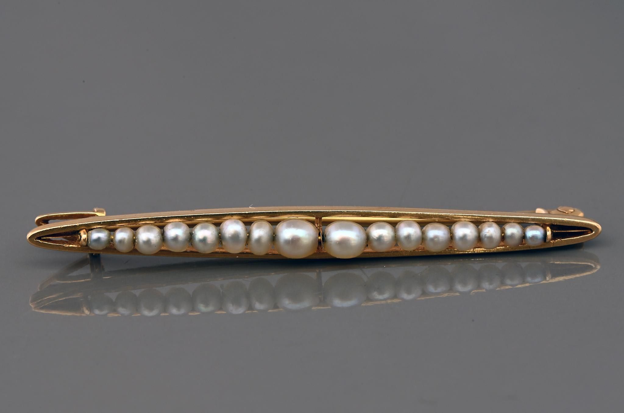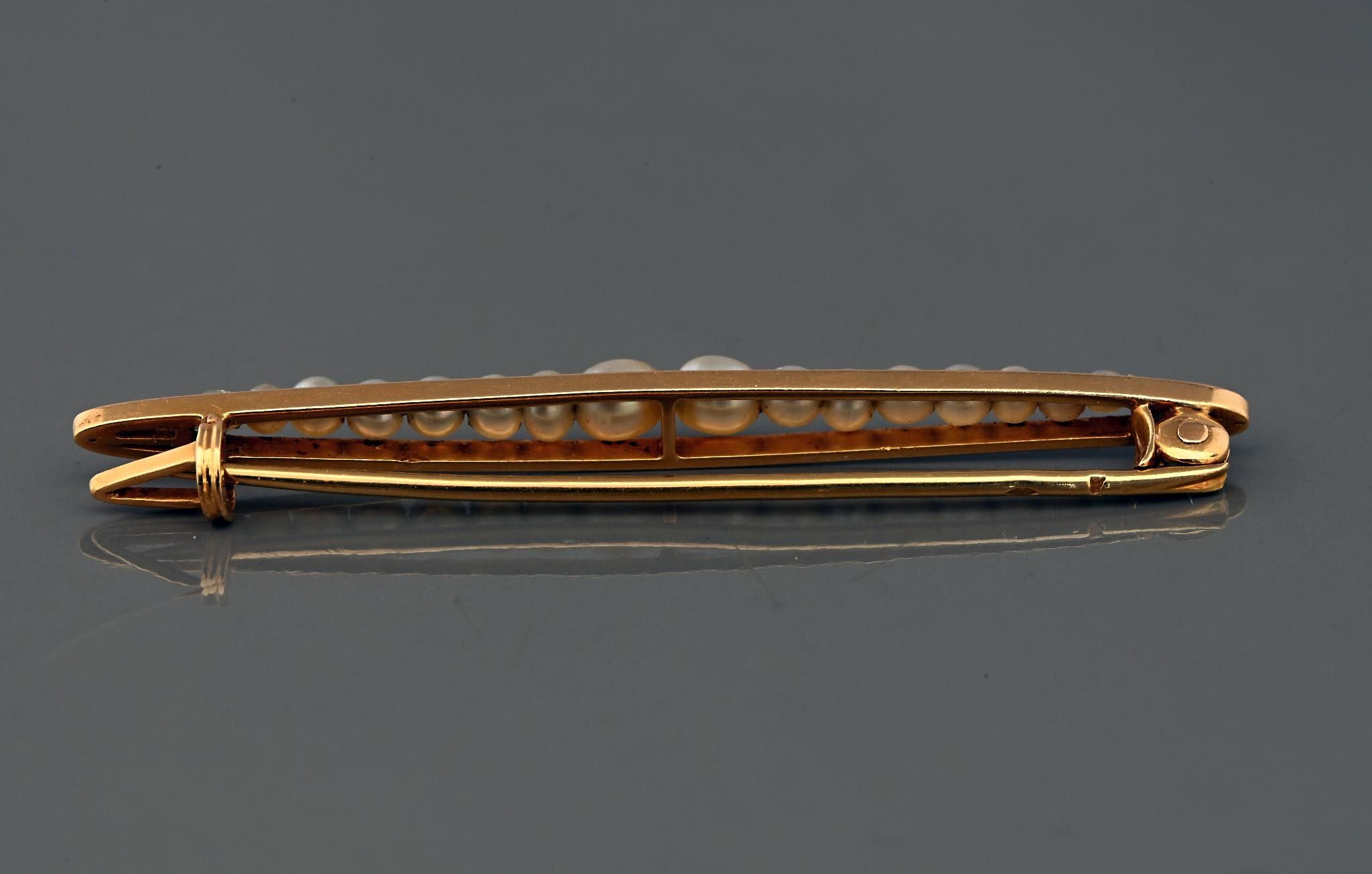 Barrette brooch in 18k yellow gold set with a pearl. Length 53 mm. Marked with an eagle's head. 4.10g gross.